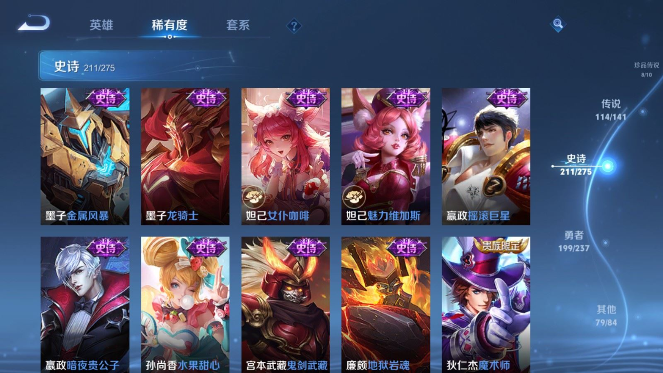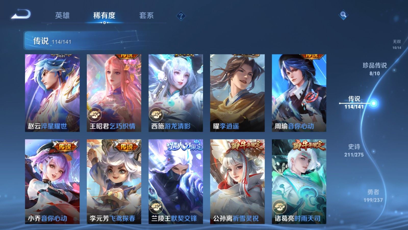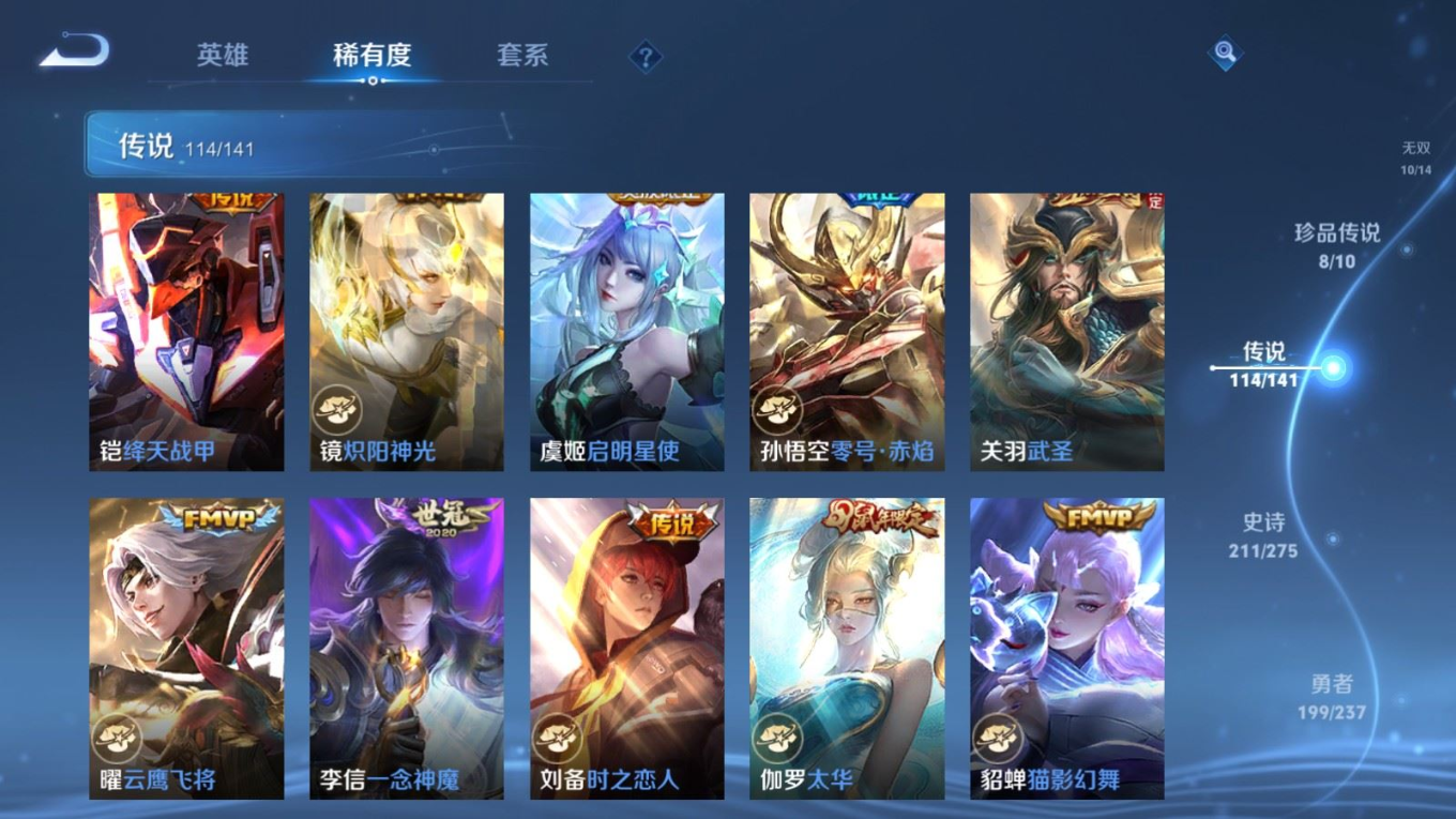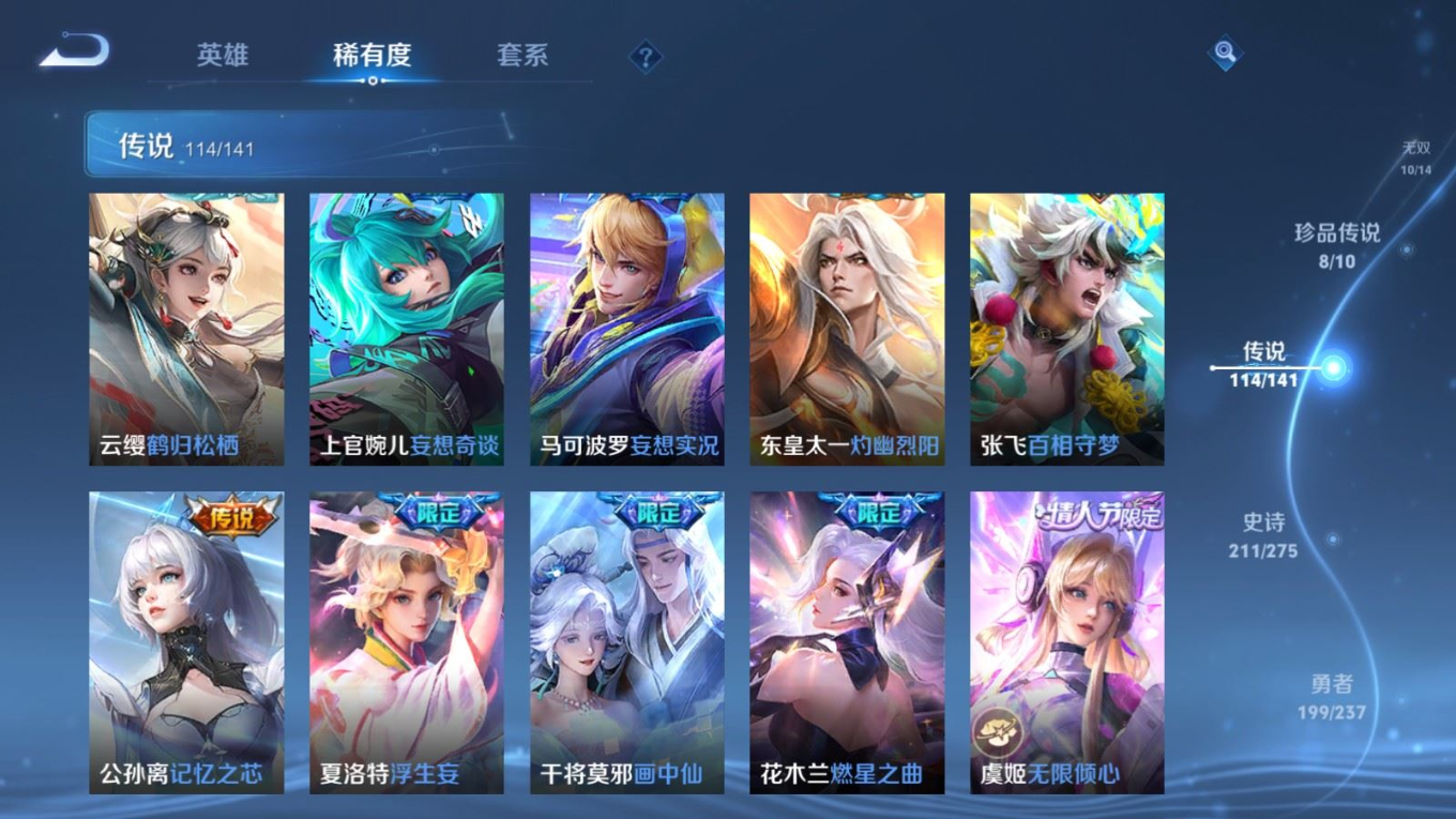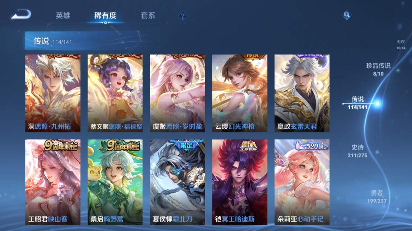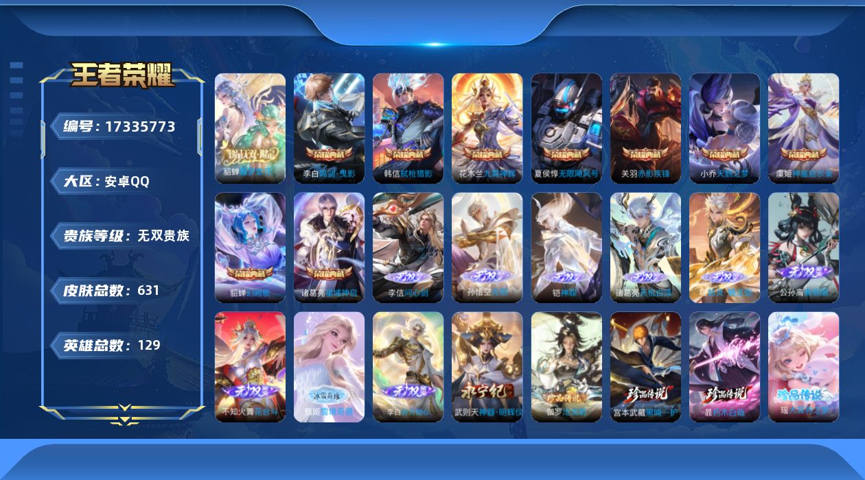 贵族等级:v10皮肤数:631传说品质114 情人节限定11 生肖限定39 荣耀典藏9 无双10 珍品传说8 珍品无双1 英雄数:129