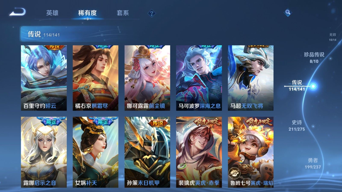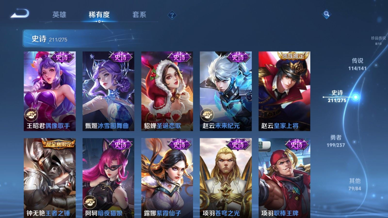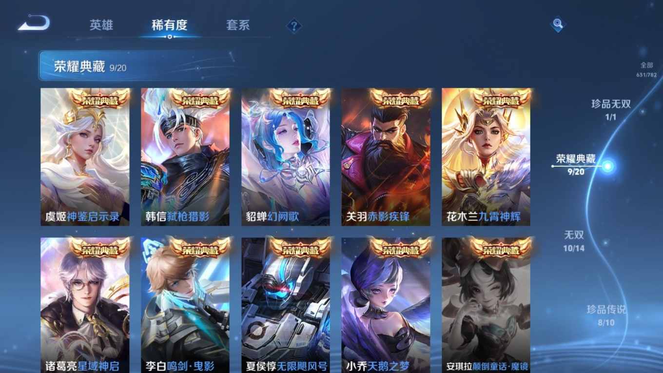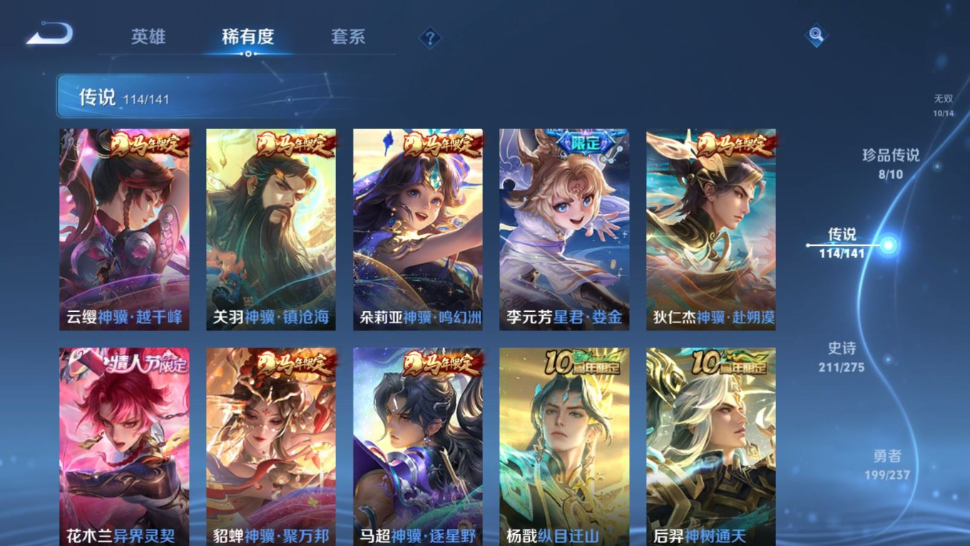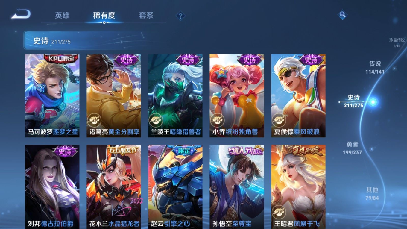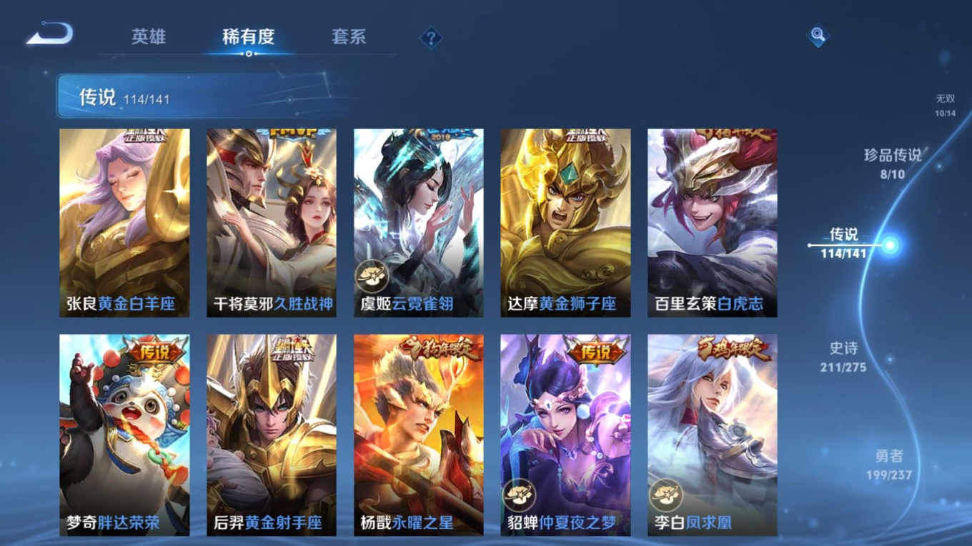 贵族等级:v10皮肤数:631传说品质114 情人节限定11 生肖限定39 荣耀典藏9 无双10 珍品传说8 珍品无双1 英雄数:129