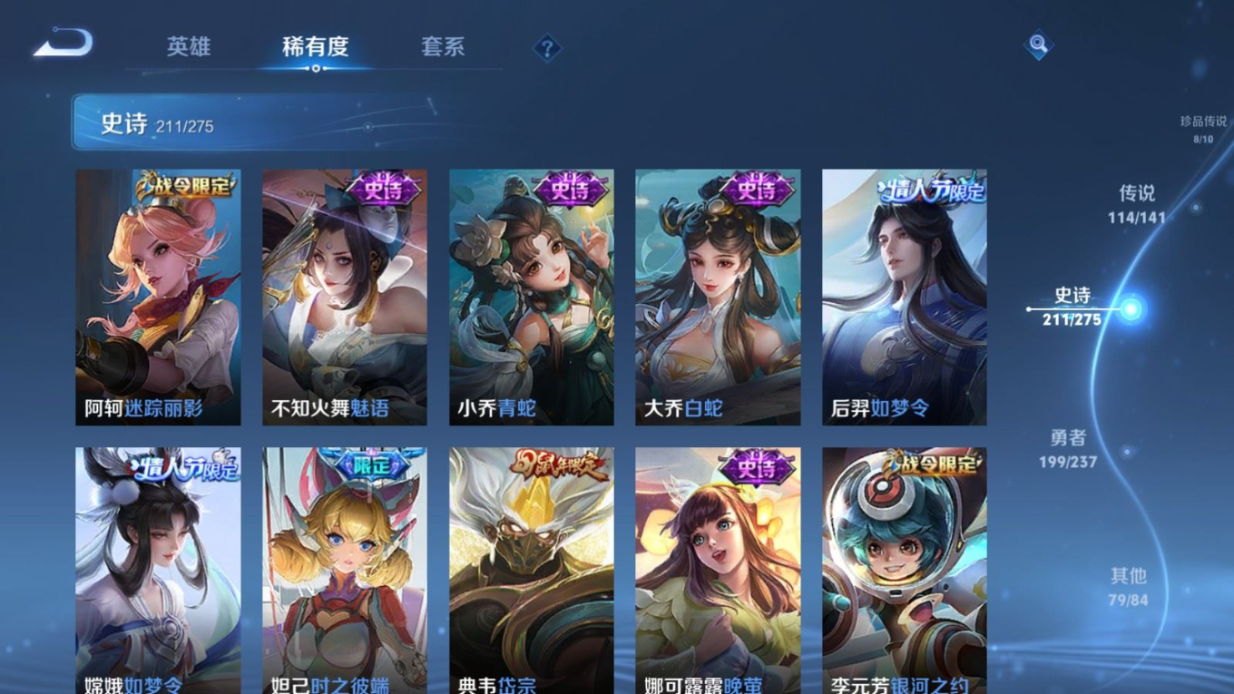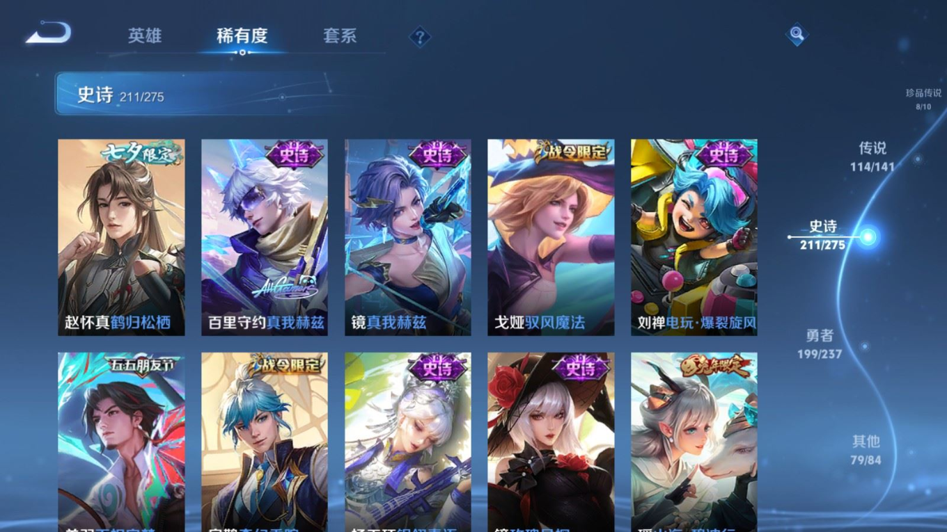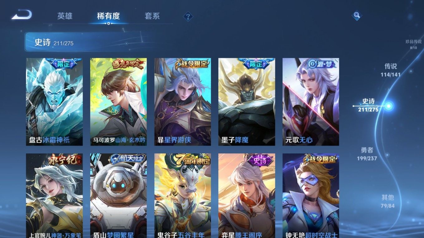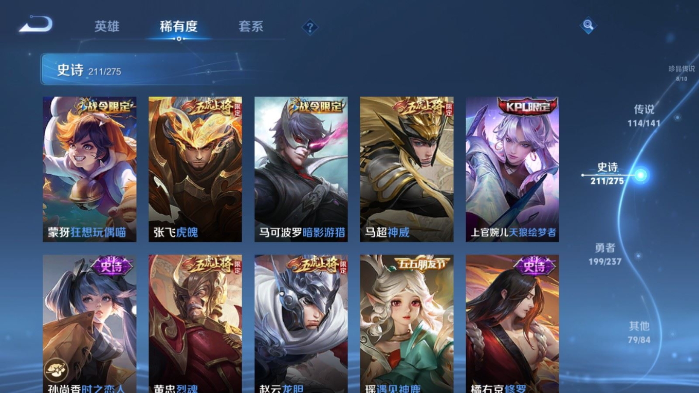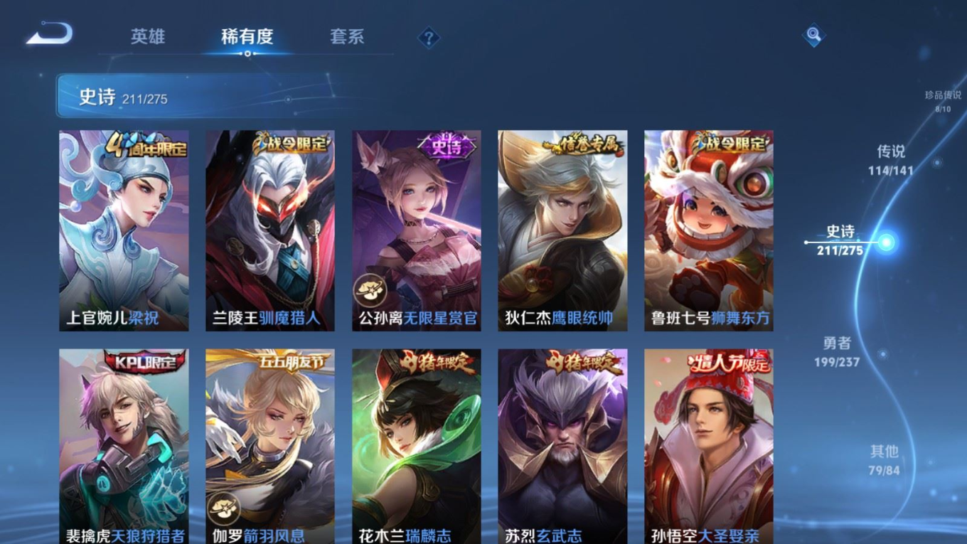 贵族等级:v10皮肤数:631传说品质114 情人节限定11 生肖限定39 荣耀典藏9 无双10 珍品传说8 珍品无双1 英雄数:129