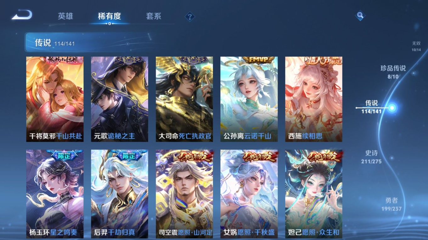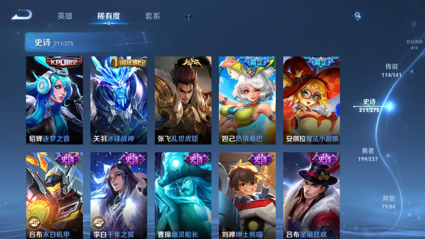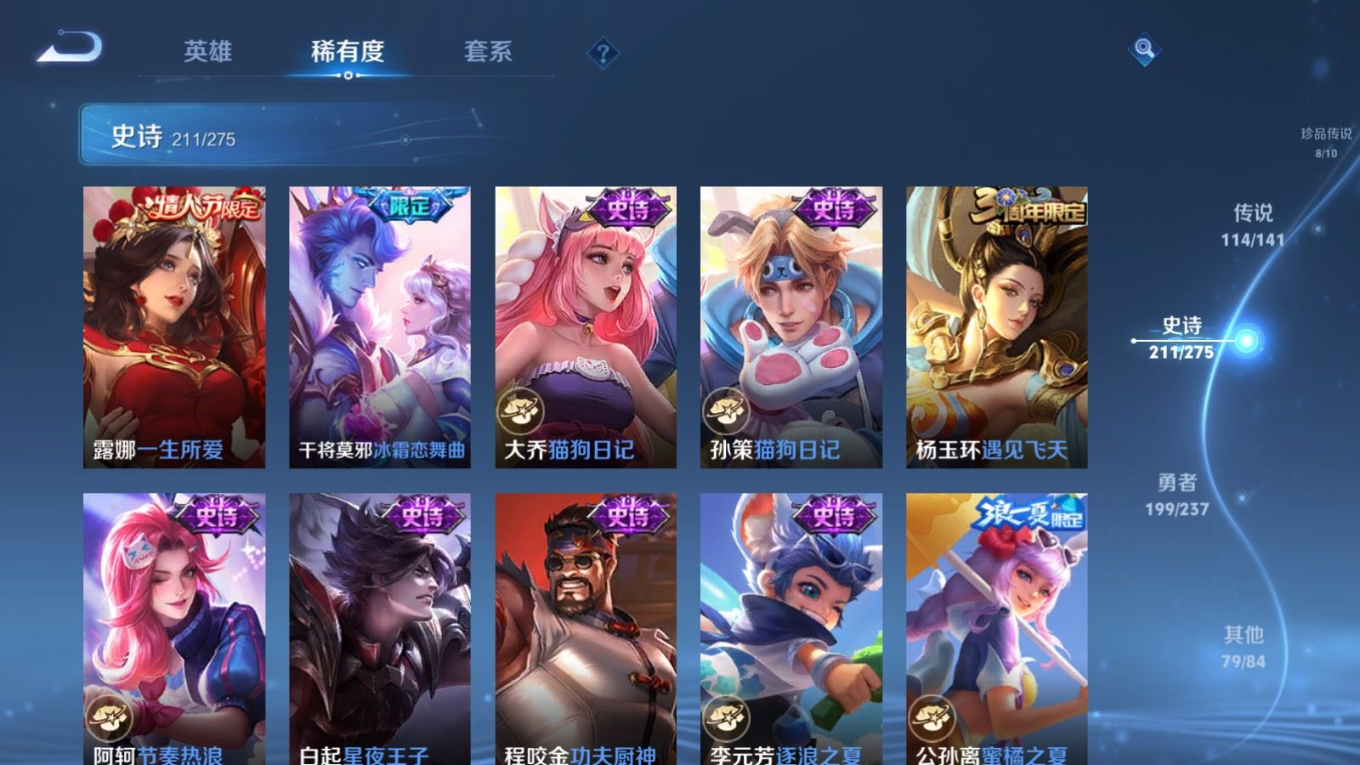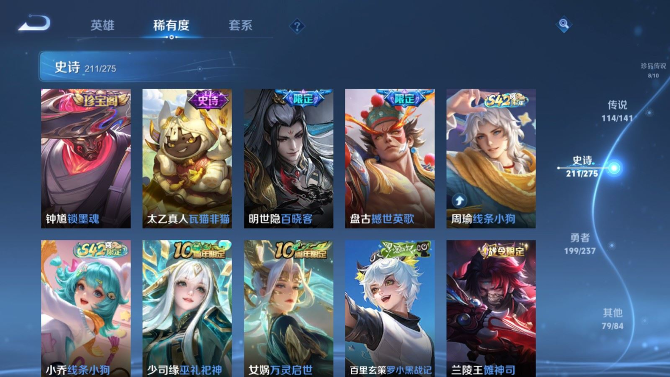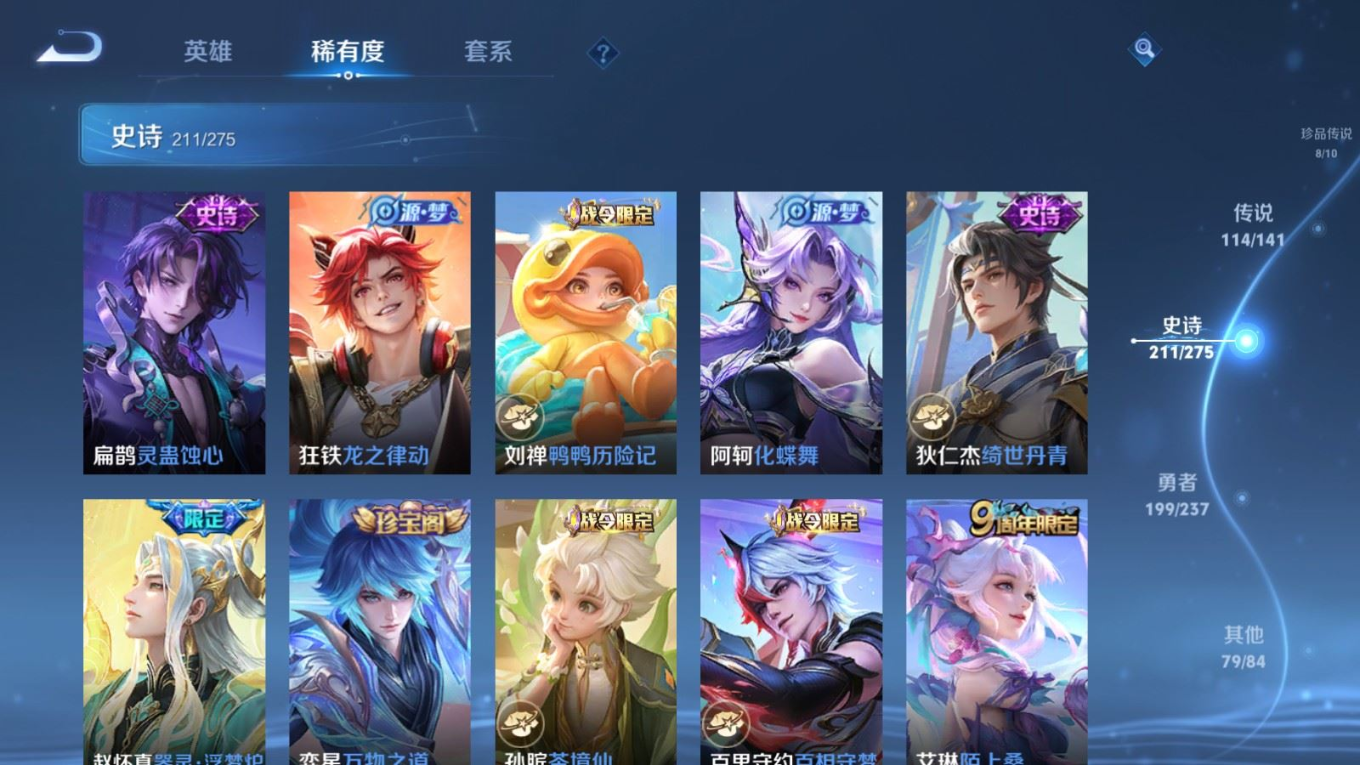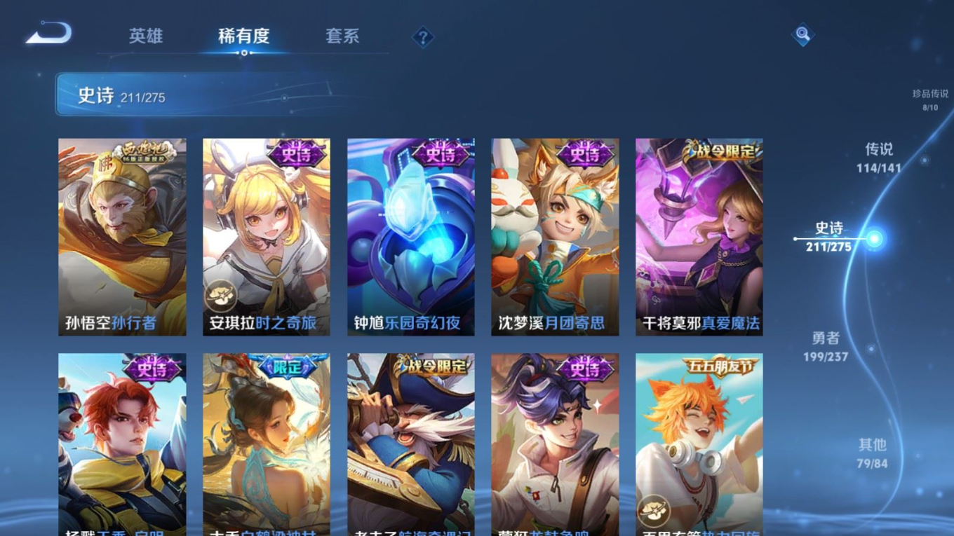 贵族等级:v10皮肤数:631传说品质114 情人节限定11 生肖限定39 荣耀典藏9 无双10 珍品传说8 珍品无双1 英雄数:129