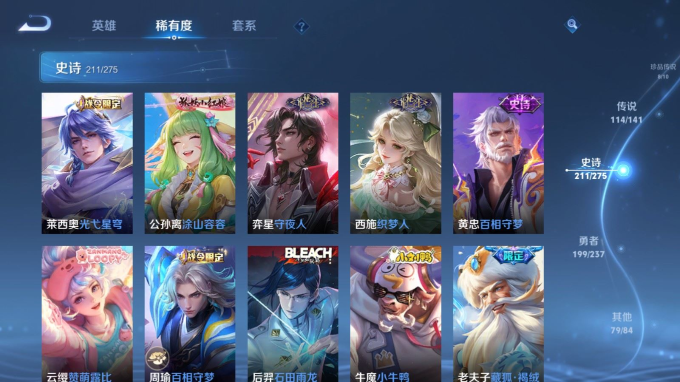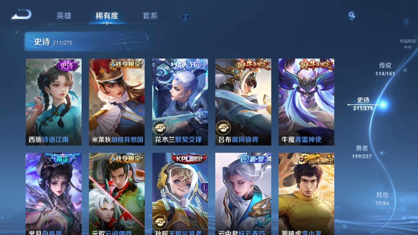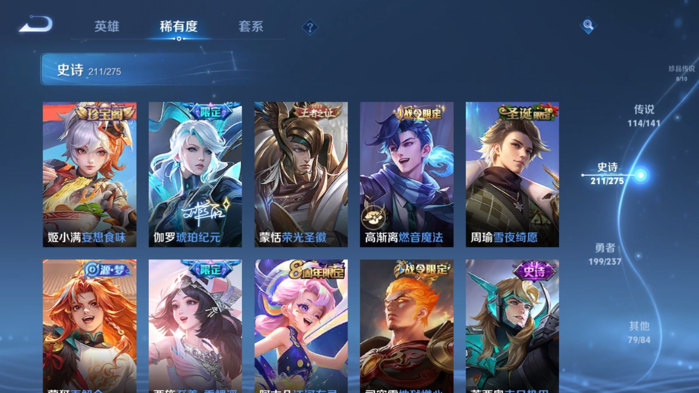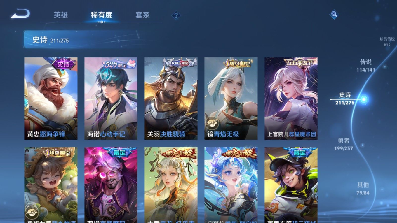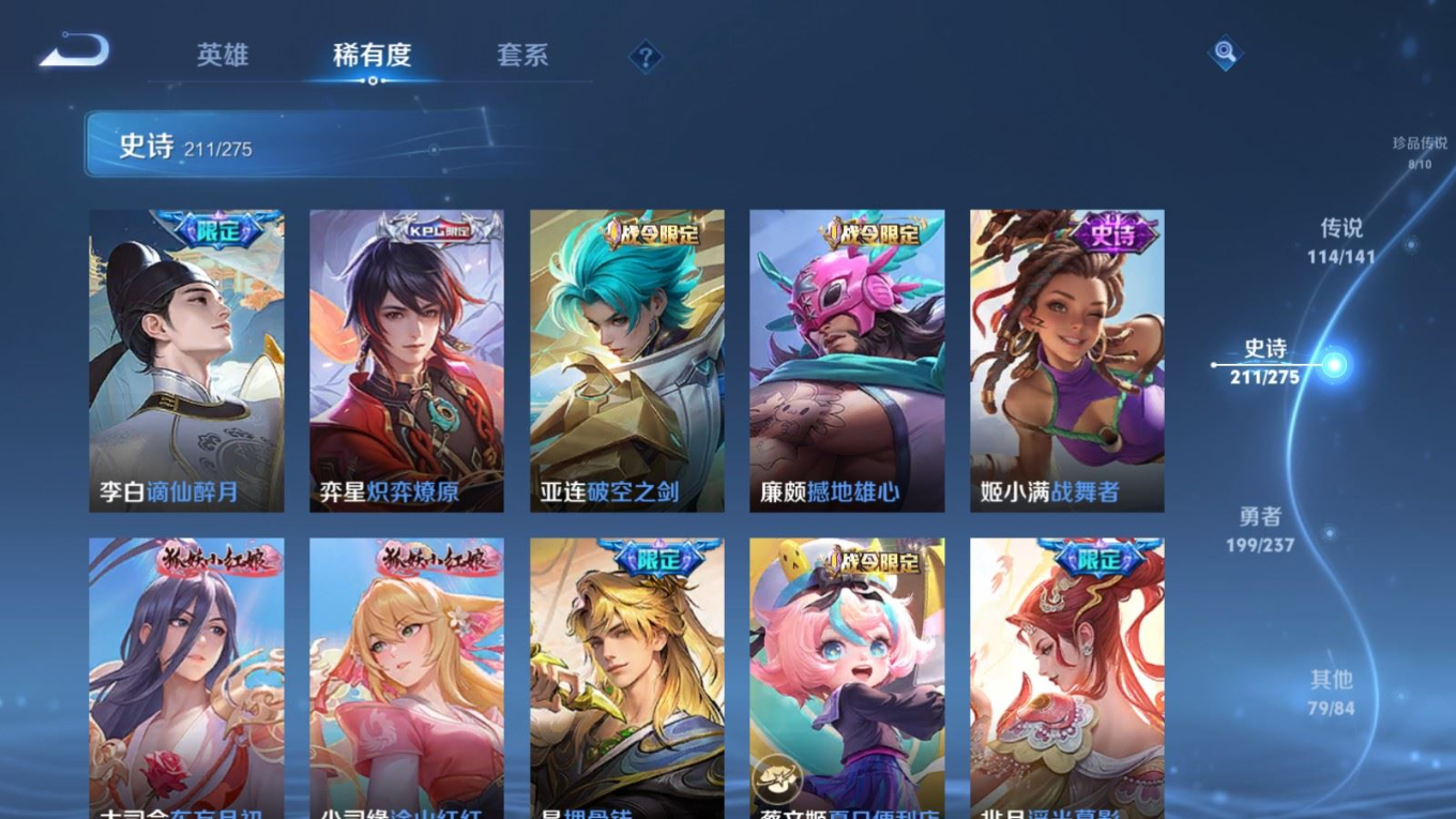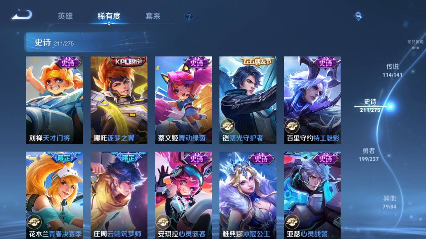贵族等级:v10皮肤数:631传说品质114 情人节限定11 生肖限定39 荣耀典藏9 无双10 珍品传说8 珍品无双1 英雄数:129