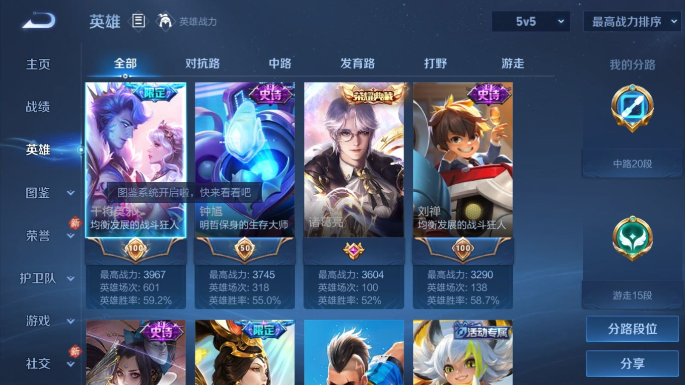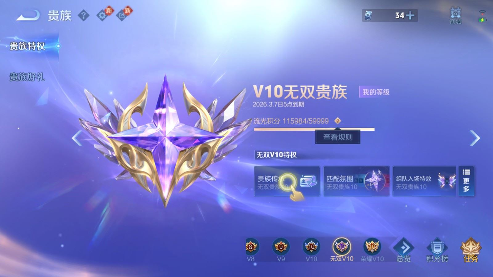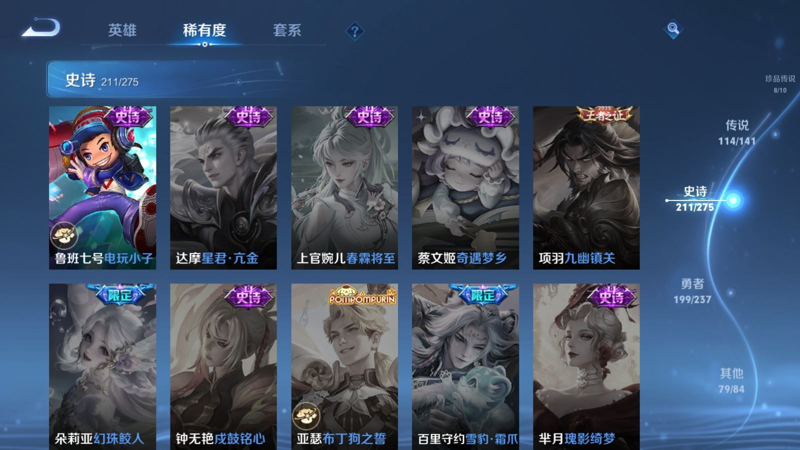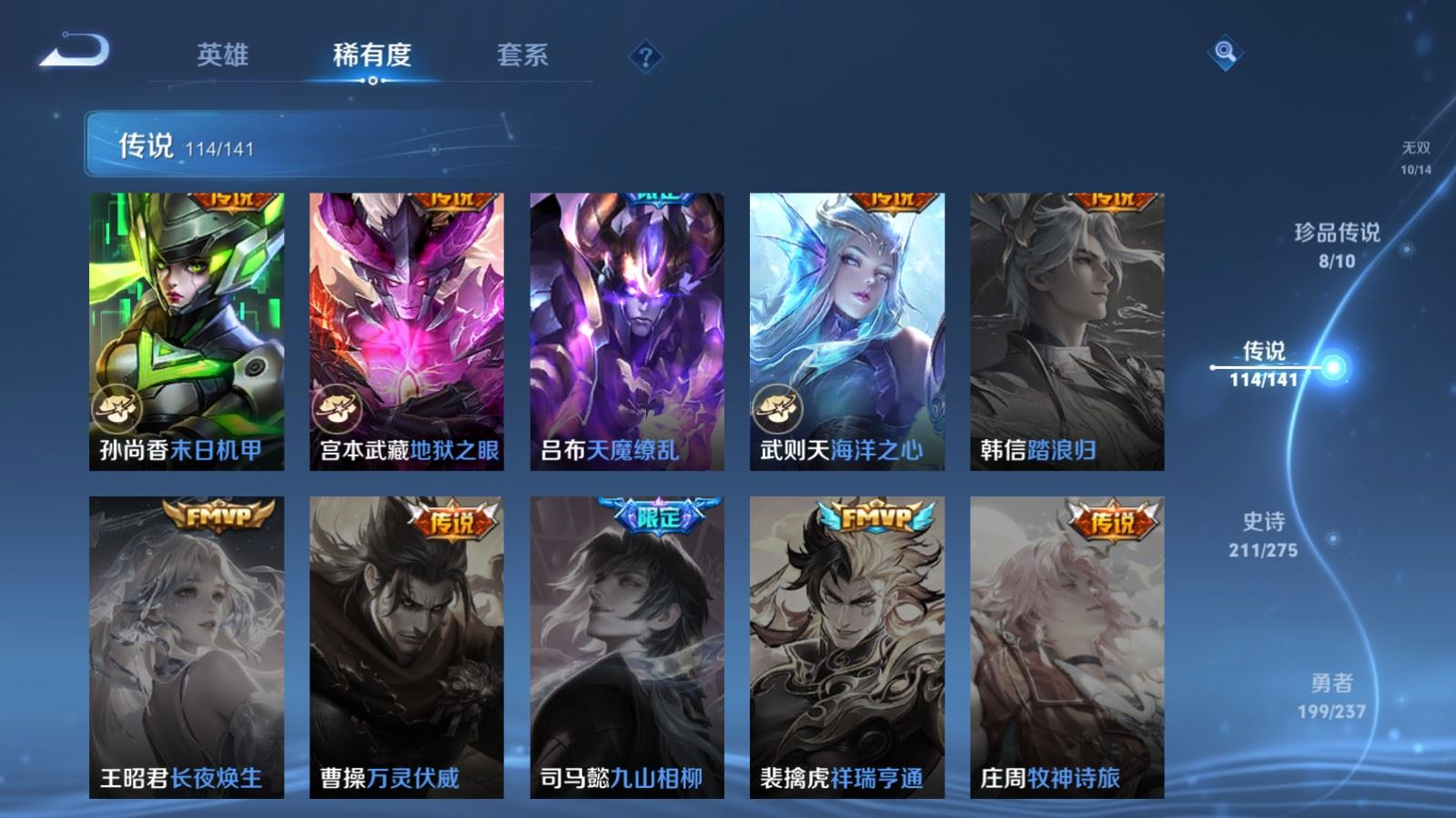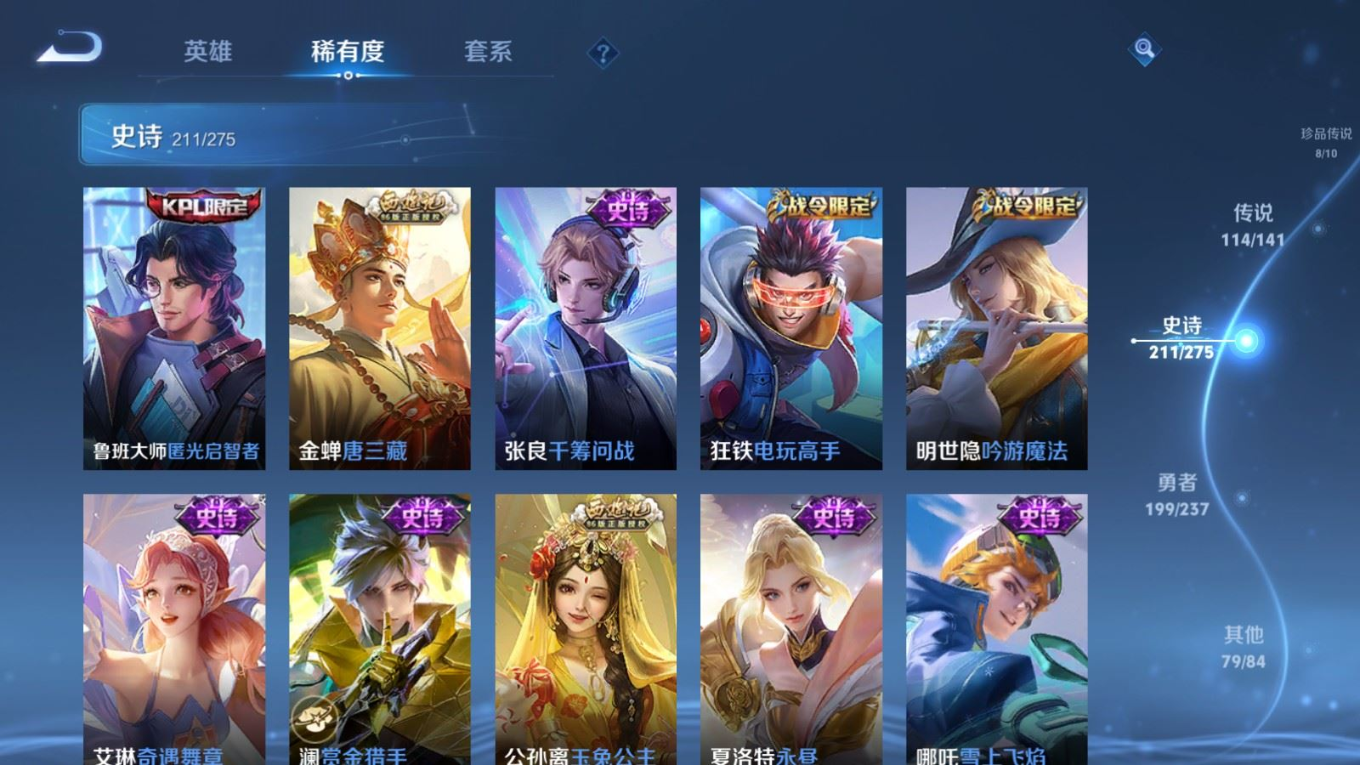 贵族等级:v10皮肤数:631传说品质114 情人节限定11 生肖限定39 荣耀典藏9 无双10 珍品传说8 珍品无双1 英雄数:129