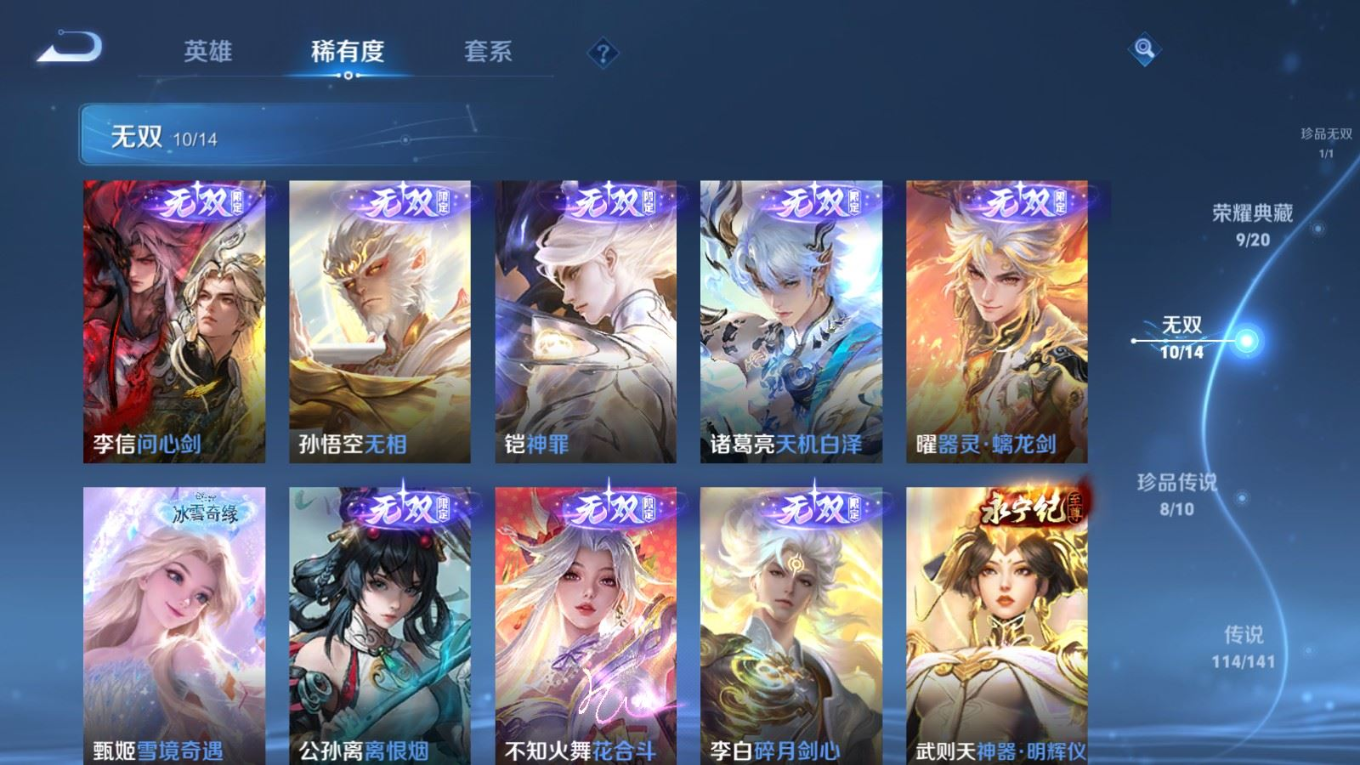 无双_诸葛亮_天机白泽无双_孙悟空_无相无双_武则天_神器·明辉仪无双_不知火舞_花合斗无双_李信_问心剑无双_李白_碎月剑心无双_甄姬_雪境奇遇无双_公孙离_离恨烟无双_曜_器灵·螭龙剑无双_铠_神罪