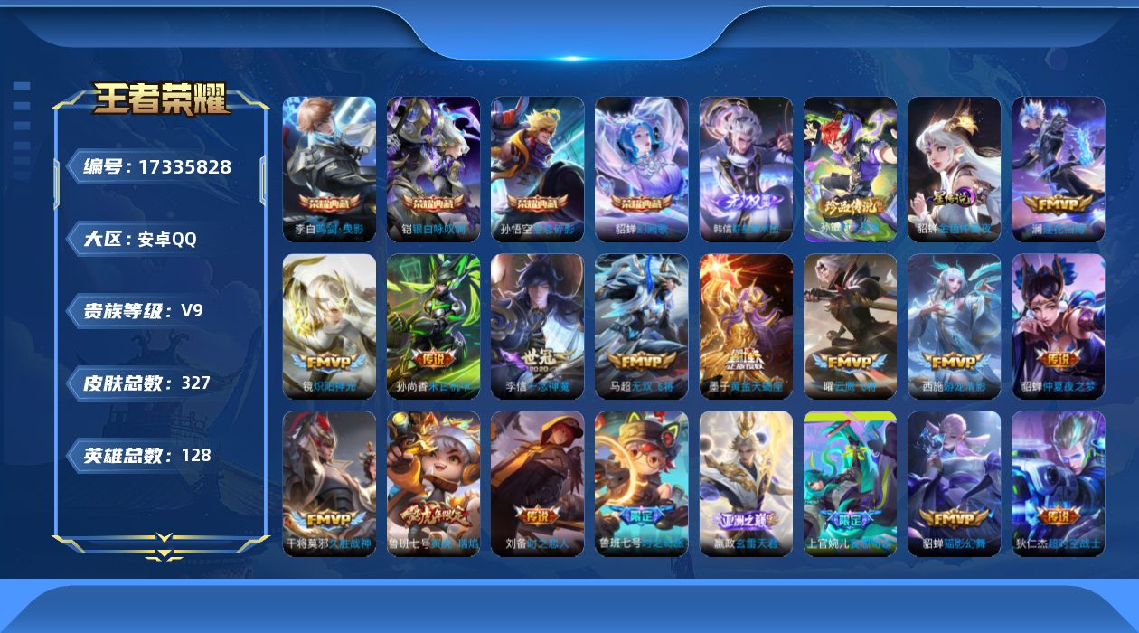 贵族等级:v9皮肤数:329生肖限定5 传说品质24 情人节限定1 荣耀典藏4 珍品传说1 无双1 英雄数:128