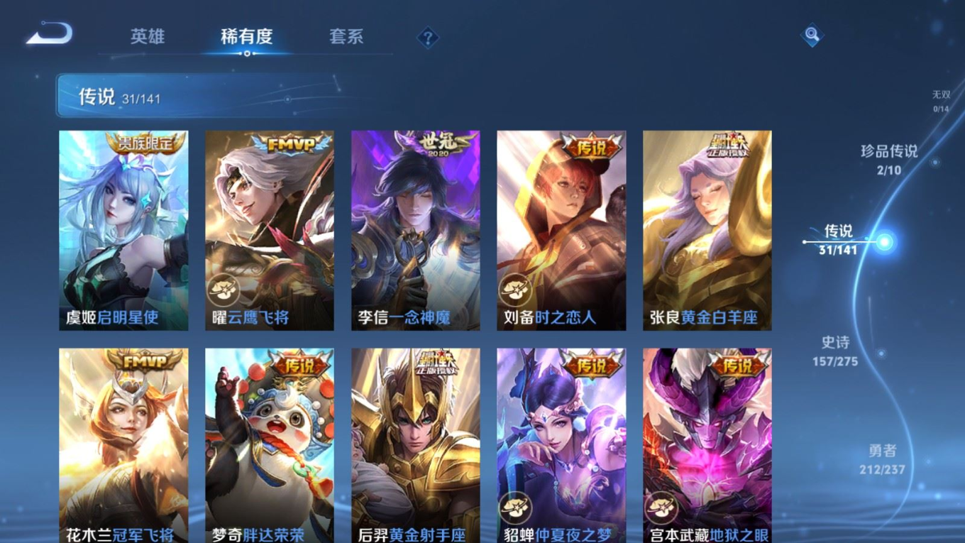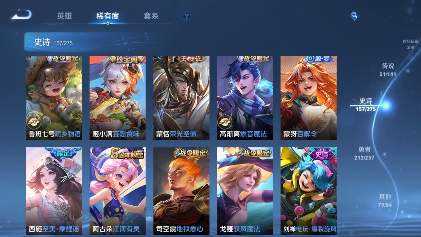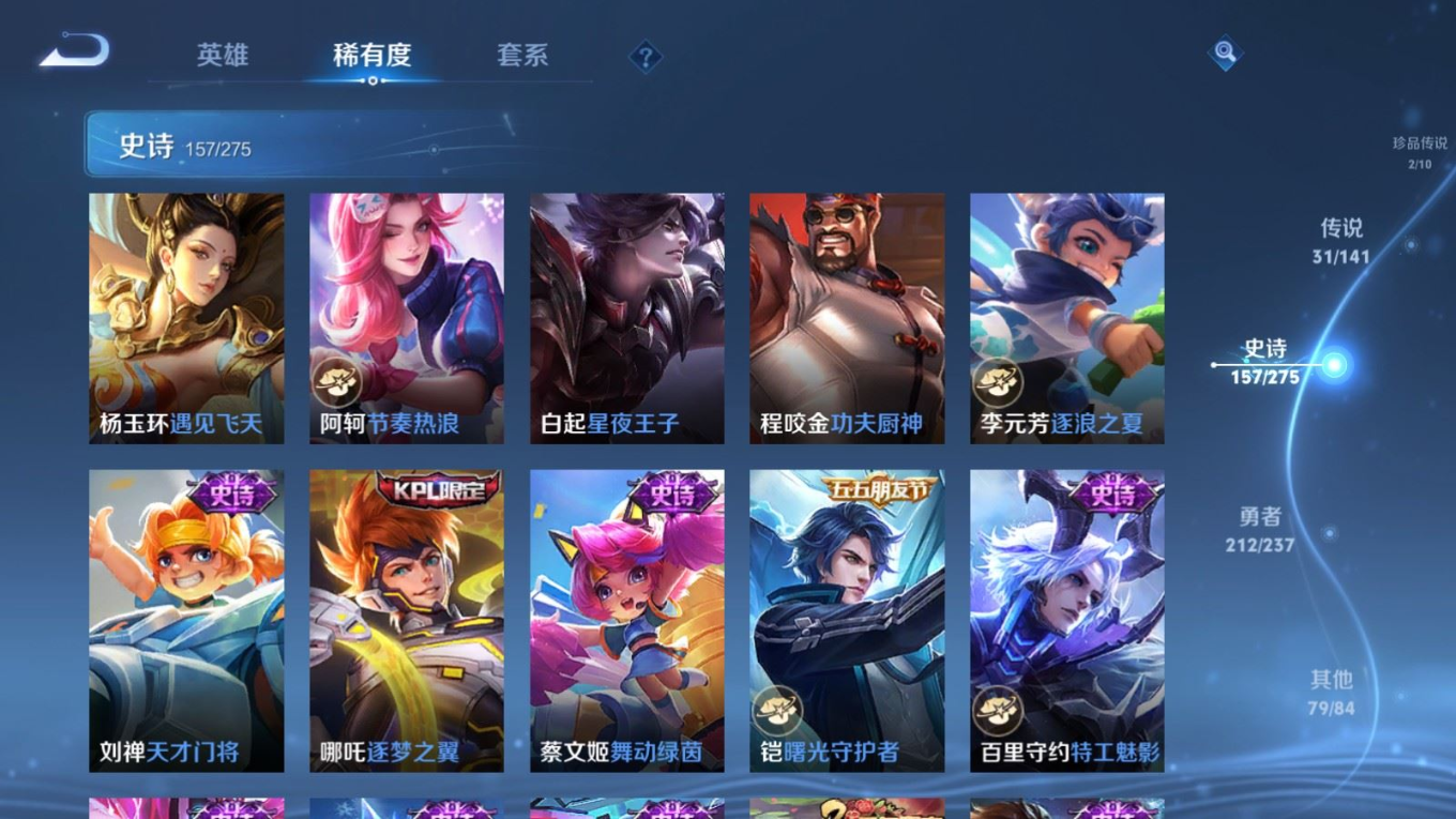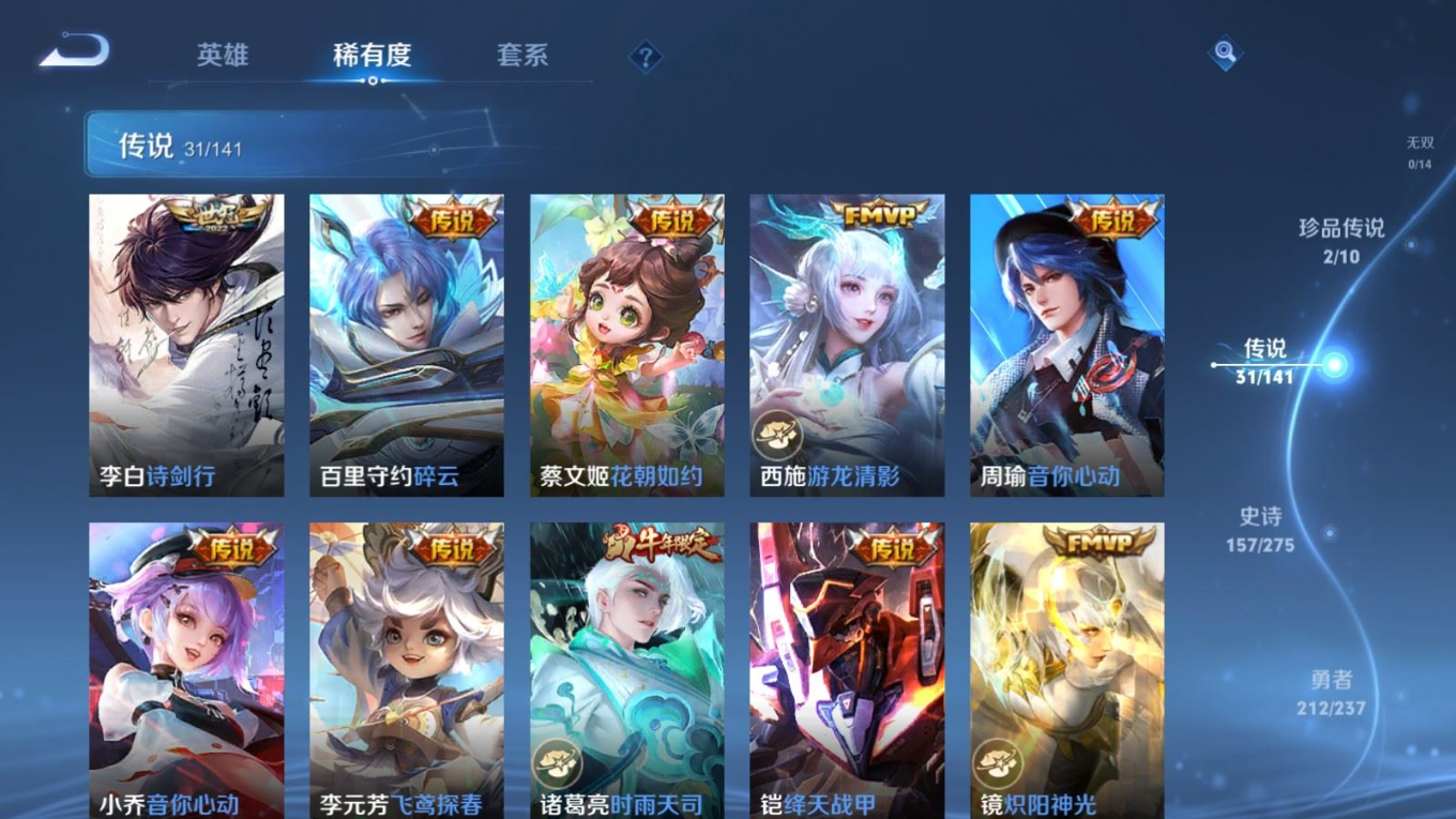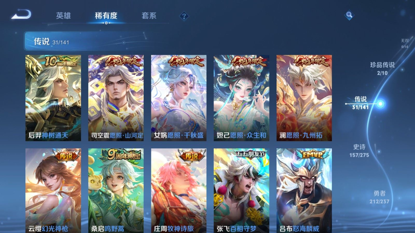 传说品质_后羿_黄金射手座传说品质_后羿_神树通天传说品质_司空震_愿照·山河定传说品质_澜_愿照·九州拓传说品质_诸葛亮_时雨天司传说品质_吕布_怒海麟威传说品质_武则天_海洋之心传说品质_宫本武藏_地狱之眼传说品质_西施_游龙清影传说品质_周瑜_音你心动传说品质_花木兰_冠军飞将传说品质_镜_炽阳神光传说品质_貂蝉_仲夏夜之梦传说品质_李信_一念神魔传说品质_小乔_音你心动传说品质_庄周_牧神诗旅传说品质_梦奇_胖达荣荣传说品质_桑启_鸣野蒿传说品质_刘备_时之恋人传说品质_张良_黄金白羊座传说品质_女娲_愿照·千秋盛传说品质_妲己_愿照·众生和传说品质_云缨_幻光神枪传说品质_李白_诗剑行传说品质_张飞_百相守梦传说品质_蔡文姬_花朝如约传说品质_百里守约_碎云传说品质_曜_云鹰飞将传说品质_铠_绛天战甲传说品质_虞姬_启明星使传说品质_李元芳_飞鸢探春
