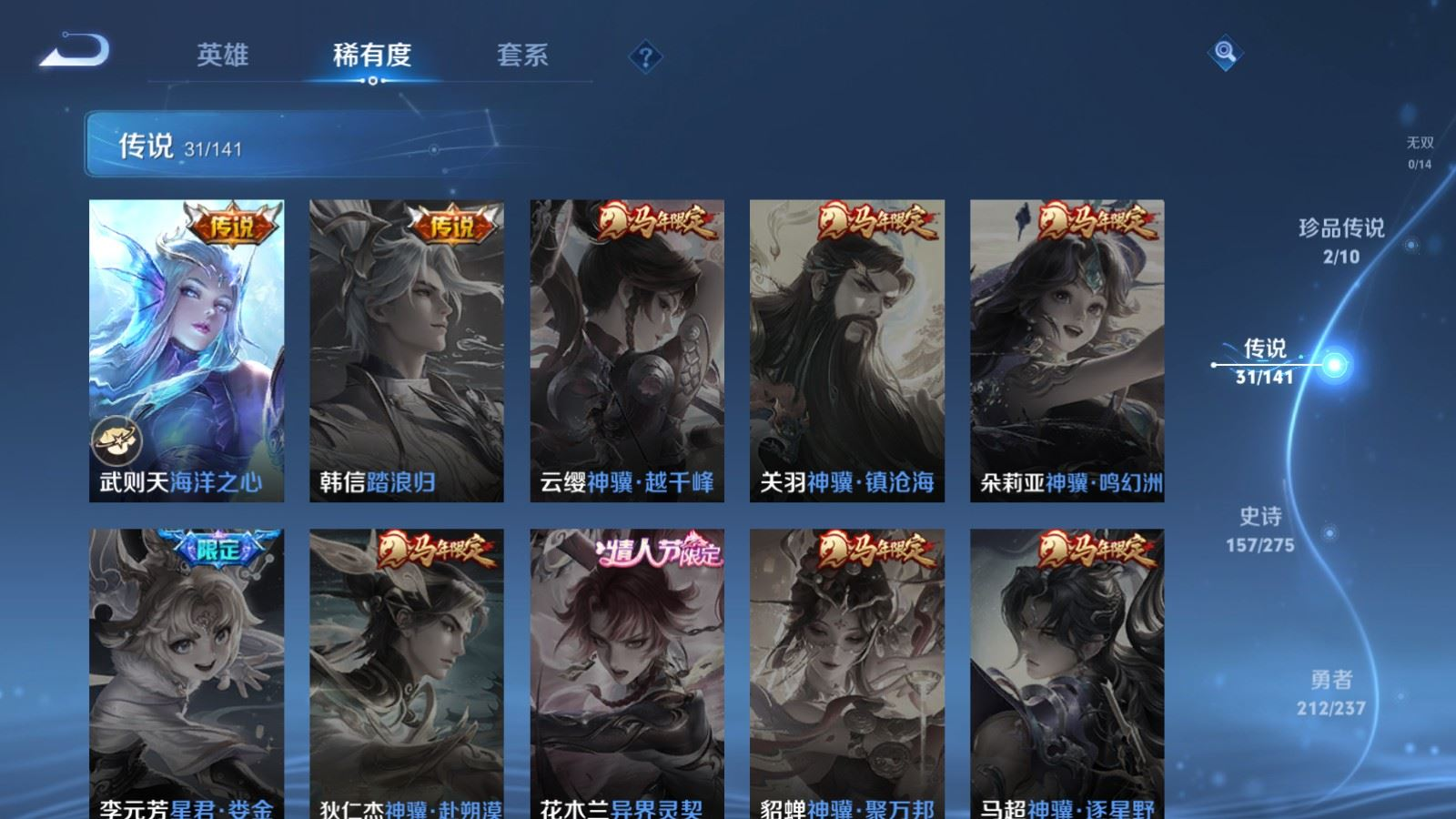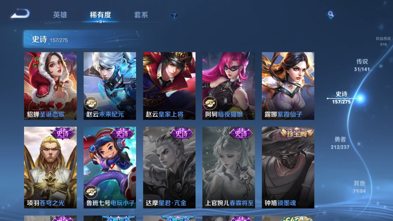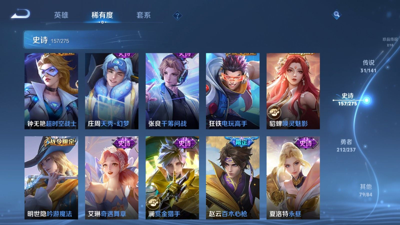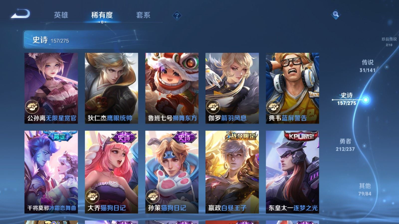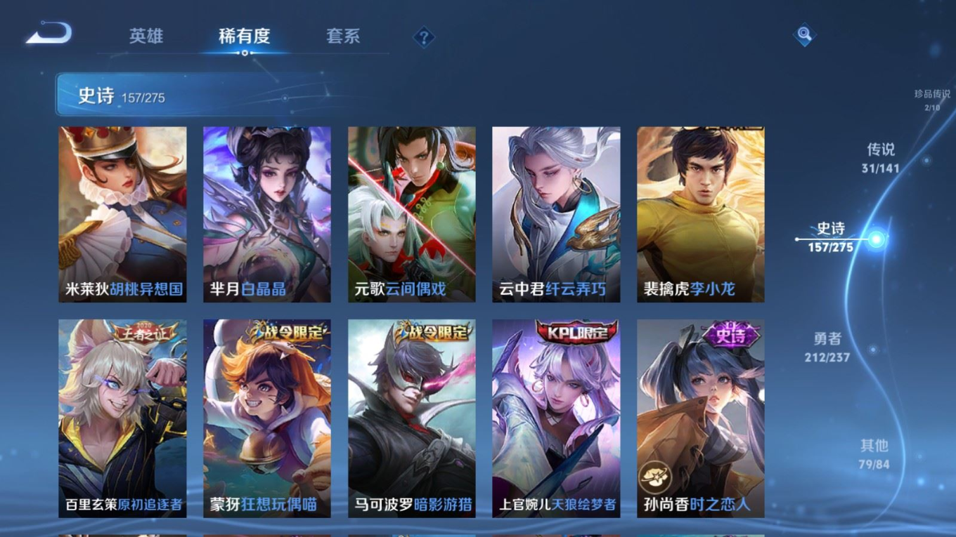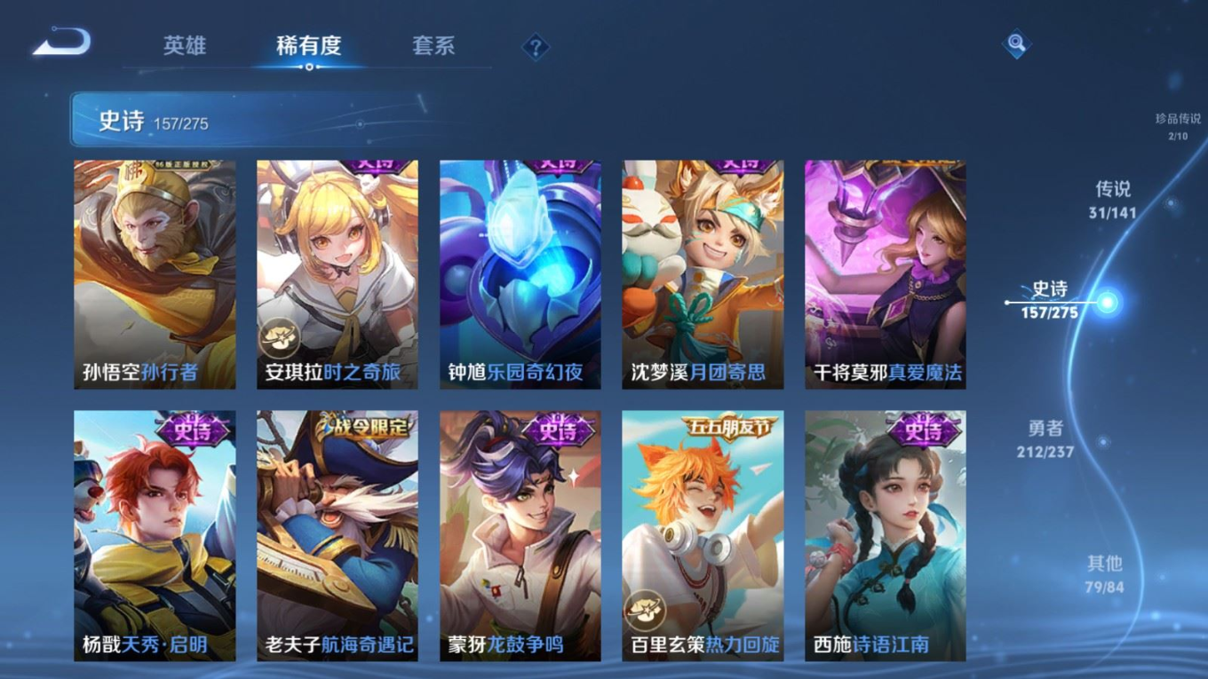 传说品质_后羿_黄金射手座传说品质_后羿_神树通天传说品质_司空震_愿照·山河定传说品质_澜_愿照·九州拓传说品质_诸葛亮_时雨天司传说品质_吕布_怒海麟威传说品质_武则天_海洋之心传说品质_宫本武藏_地狱之眼传说品质_西施_游龙清影传说品质_周瑜_音你心动传说品质_花木兰_冠军飞将传说品质_镜_炽阳神光传说品质_貂蝉_仲夏夜之梦传说品质_李信_一念神魔传说品质_小乔_音你心动传说品质_庄周_牧神诗旅传说品质_梦奇_胖达荣荣传说品质_桑启_鸣野蒿传说品质_刘备_时之恋人传说品质_张良_黄金白羊座传说品质_女娲_愿照·千秋盛传说品质_妲己_愿照·众生和传说品质_云缨_幻光神枪传说品质_李白_诗剑行传说品质_张飞_百相守梦传说品质_蔡文姬_花朝如约传说品质_百里守约_碎云传说品质_曜_云鹰飞将传说品质_铠_绛天战甲传说品质_虞姬_启明星使传说品质_李元芳_飞鸢探春