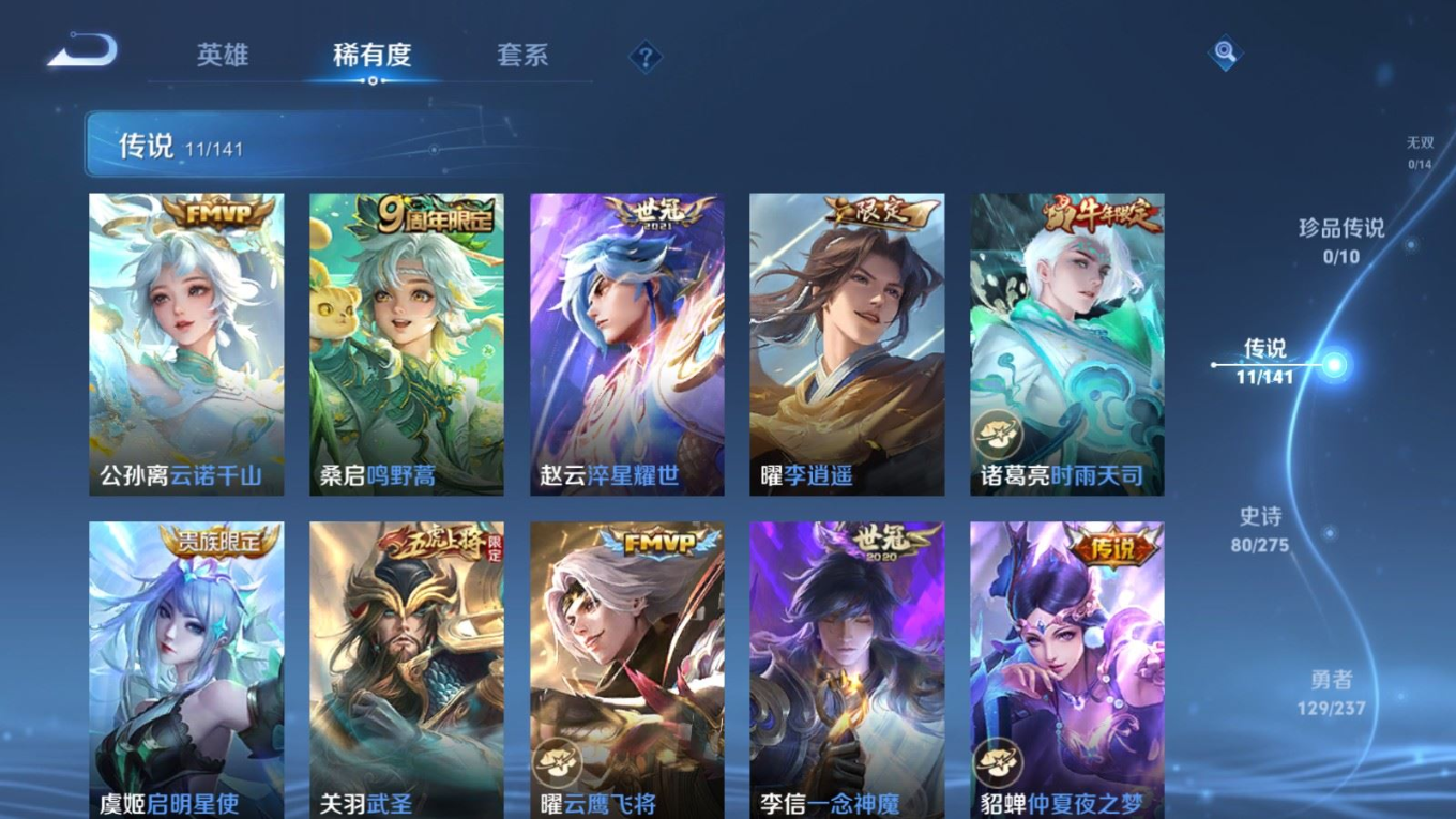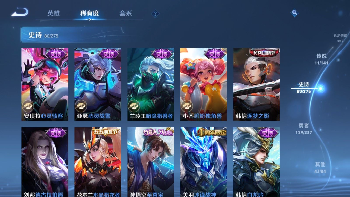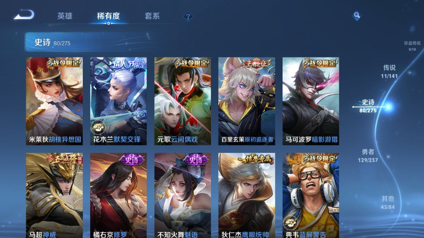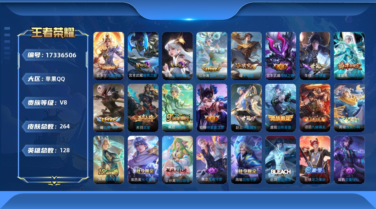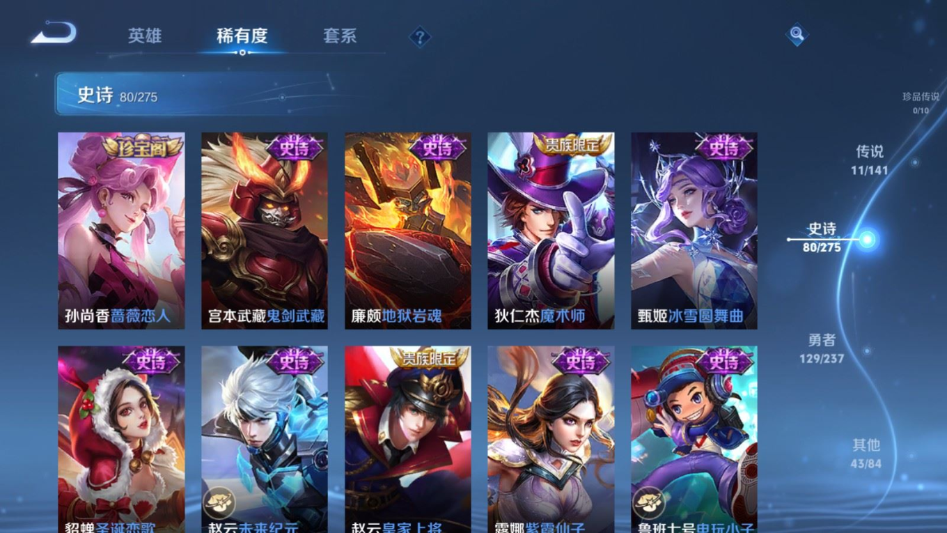 贵族等级:v8皮肤数:264传说品质11 生肖限定2 情人节限定2 荣耀典藏1 英雄数:128