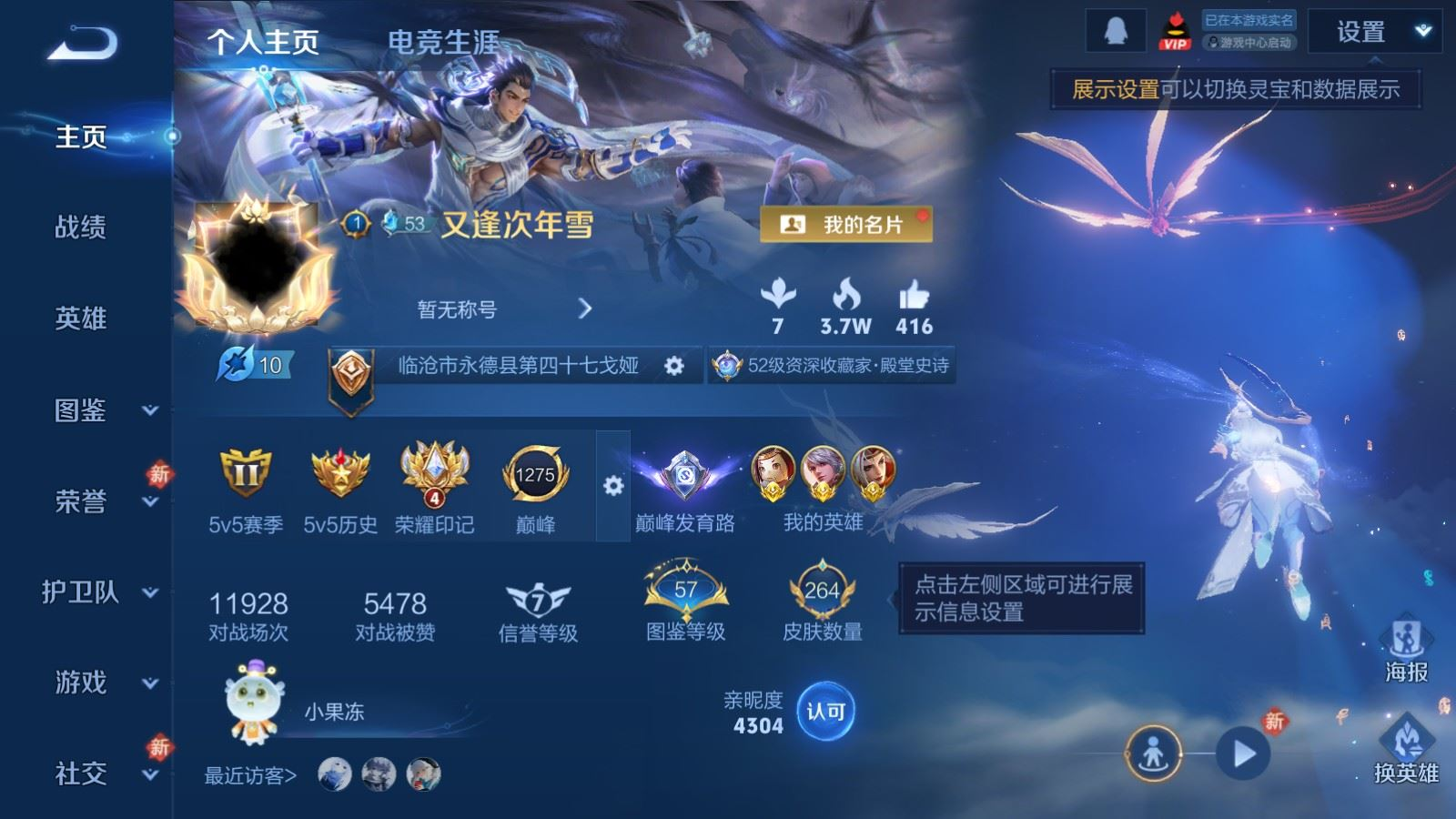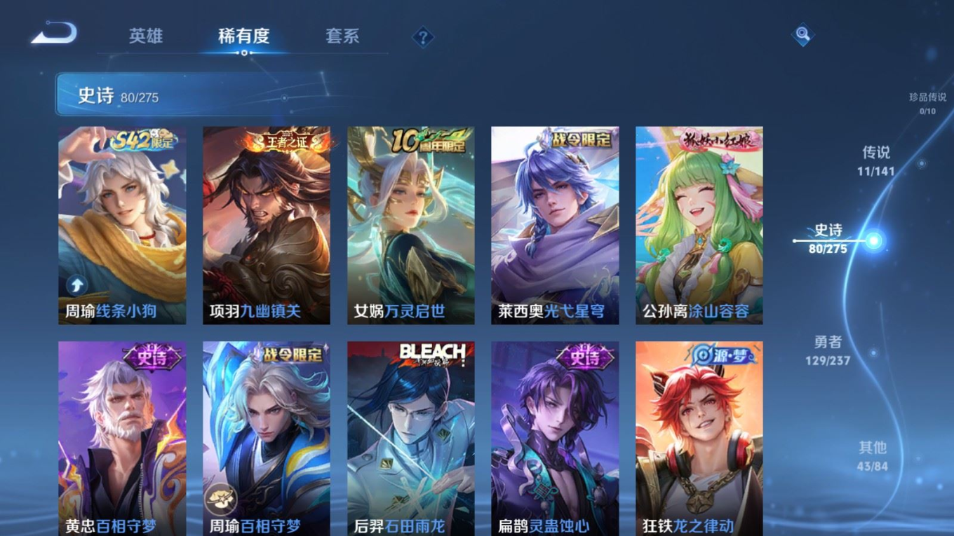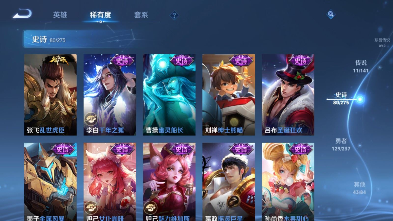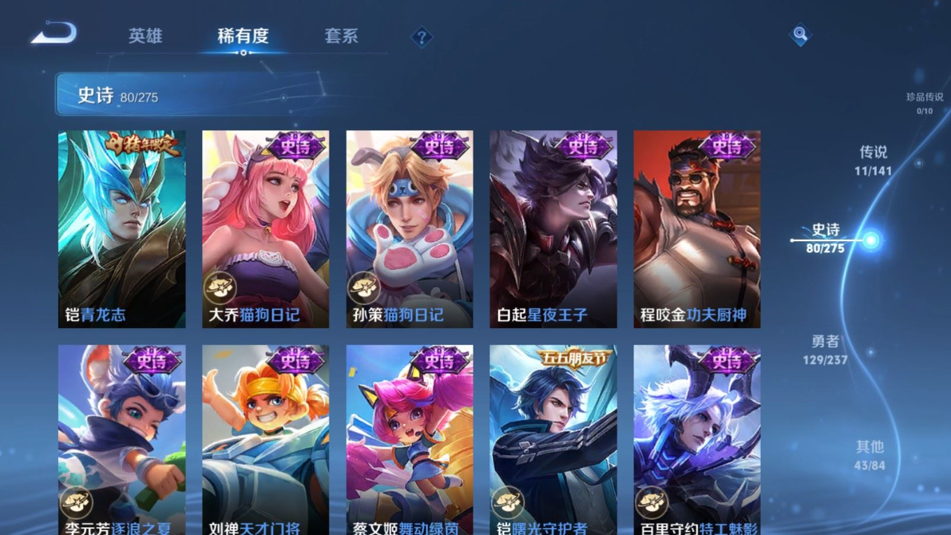 贵族等级:v8皮肤数:264传说品质11 生肖限定2 情人节限定2 荣耀典藏1 英雄数:128