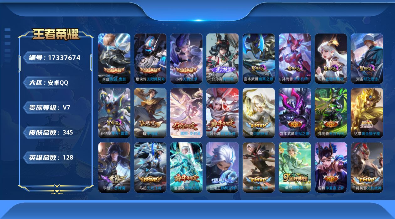 贵族等级:v7皮肤数:345传说品质23 情人节限定4 生肖限定7 荣耀典藏3 无双1 英雄数:128