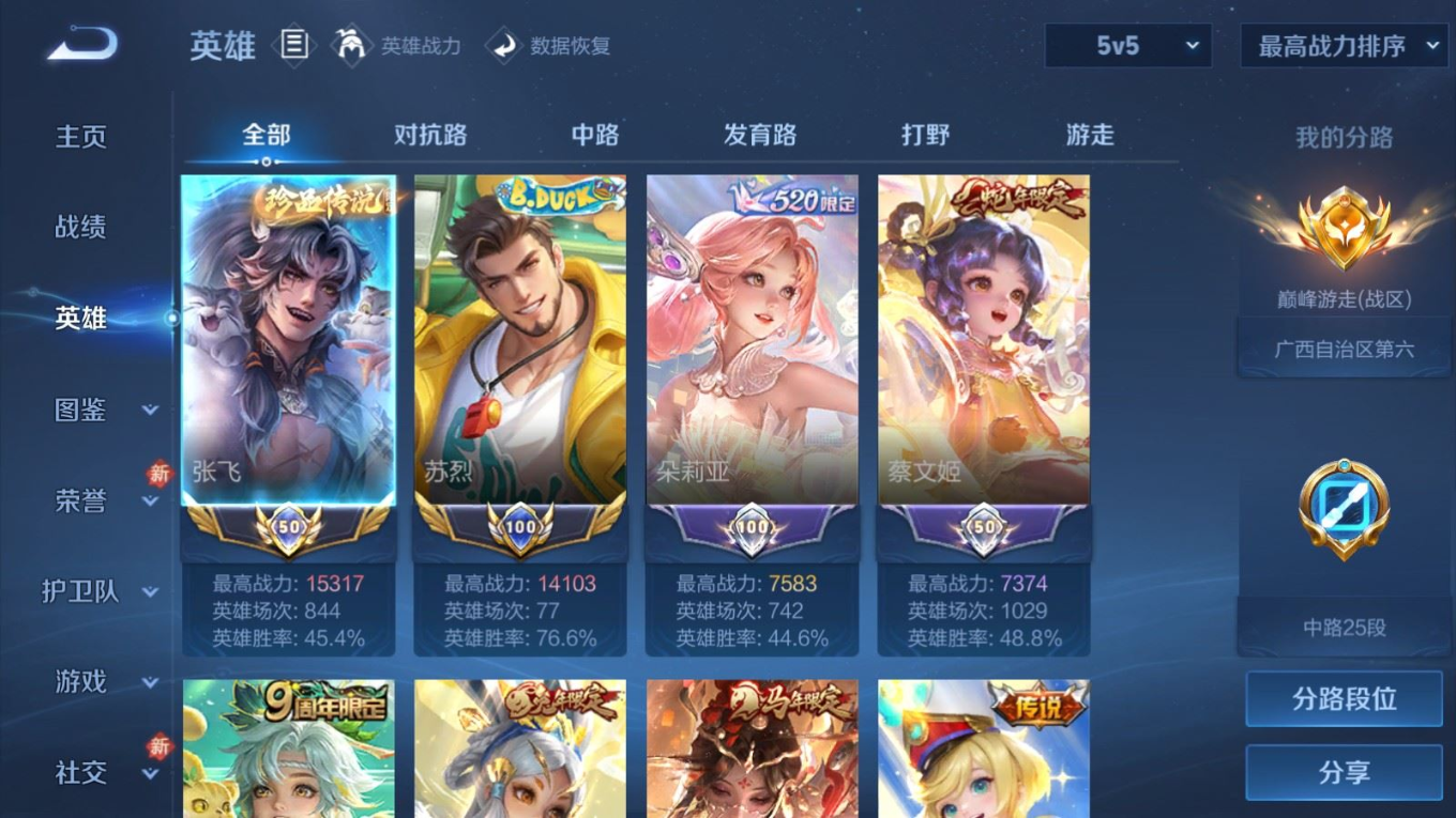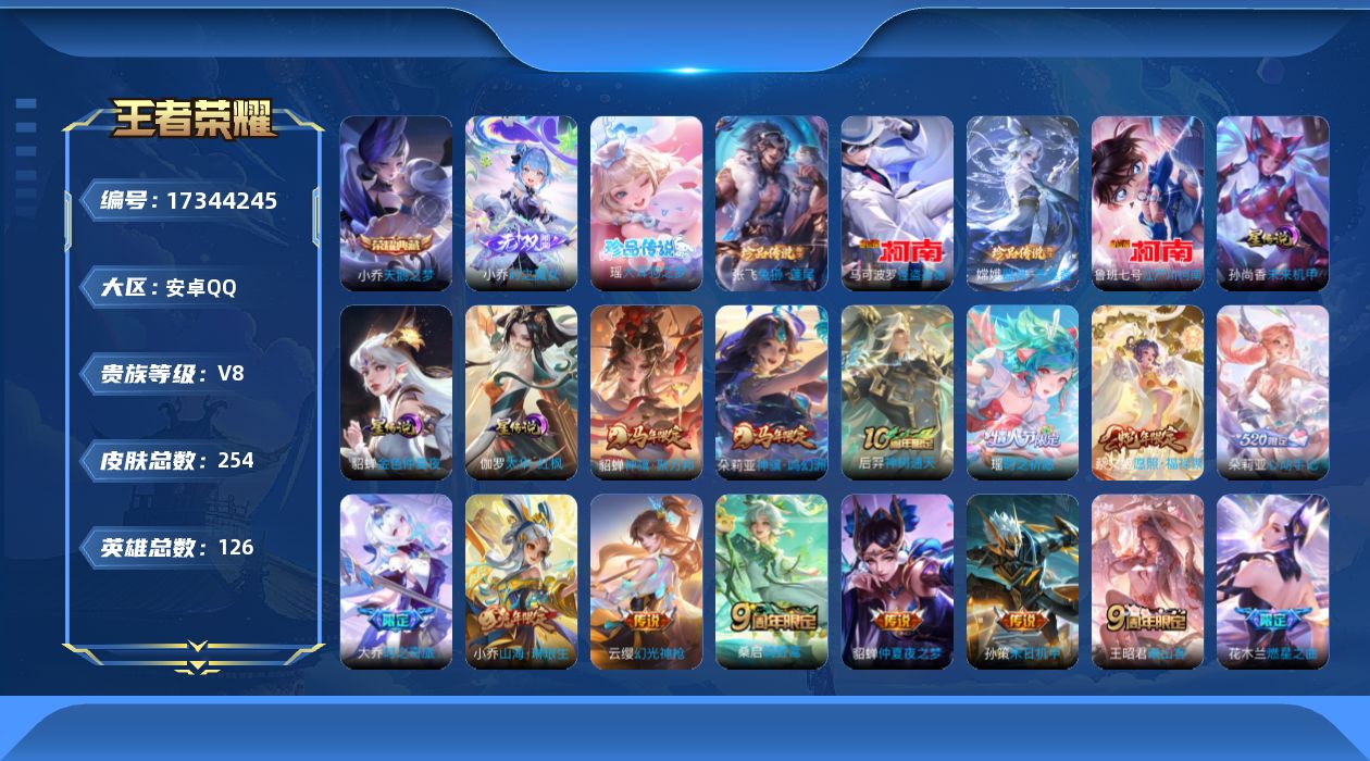 贵族等级:v8皮肤数:254传说品质20 生肖限定5 荣耀典藏1 无双1 珍品传说5 情人节限定1 英雄数:126