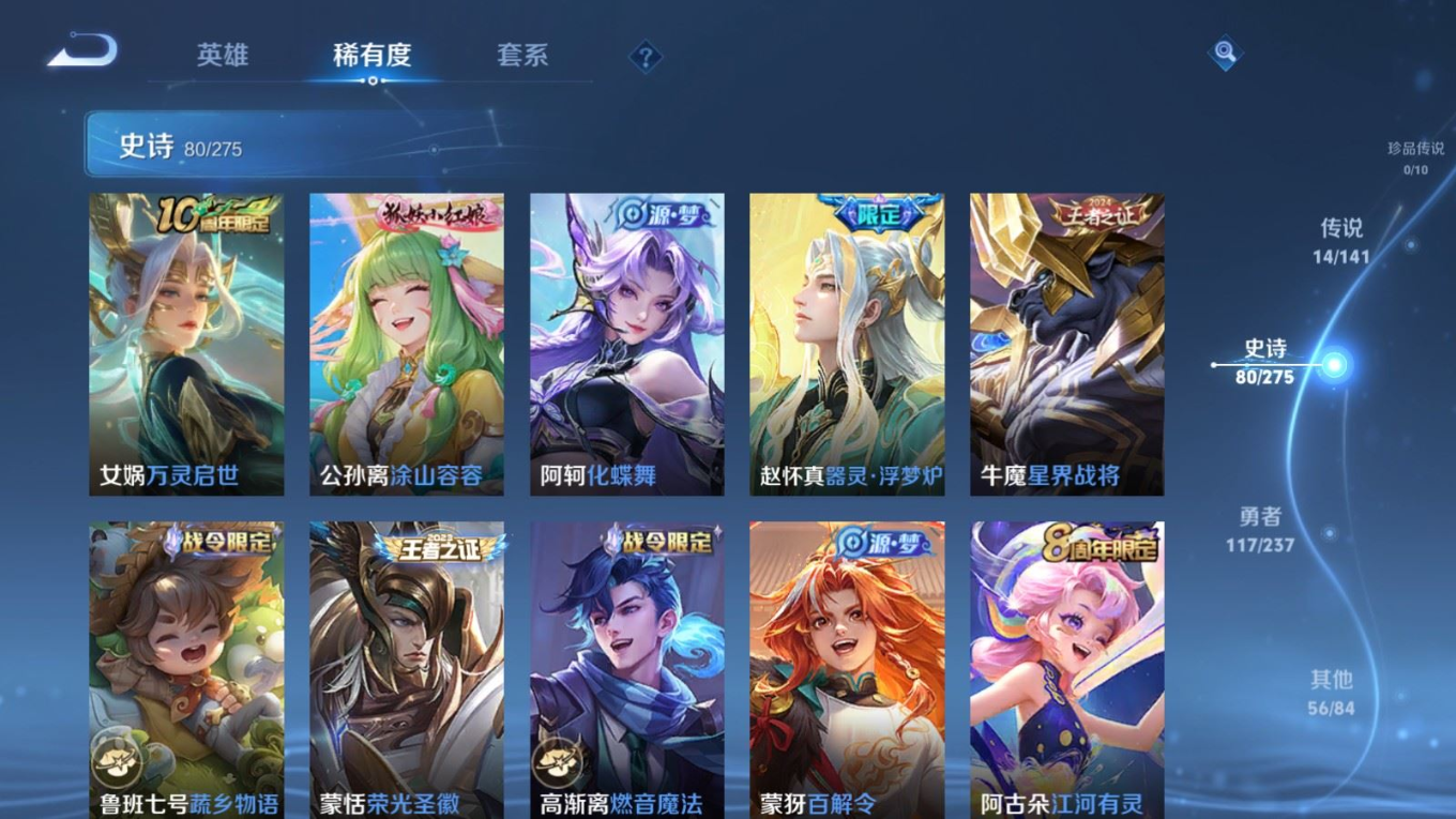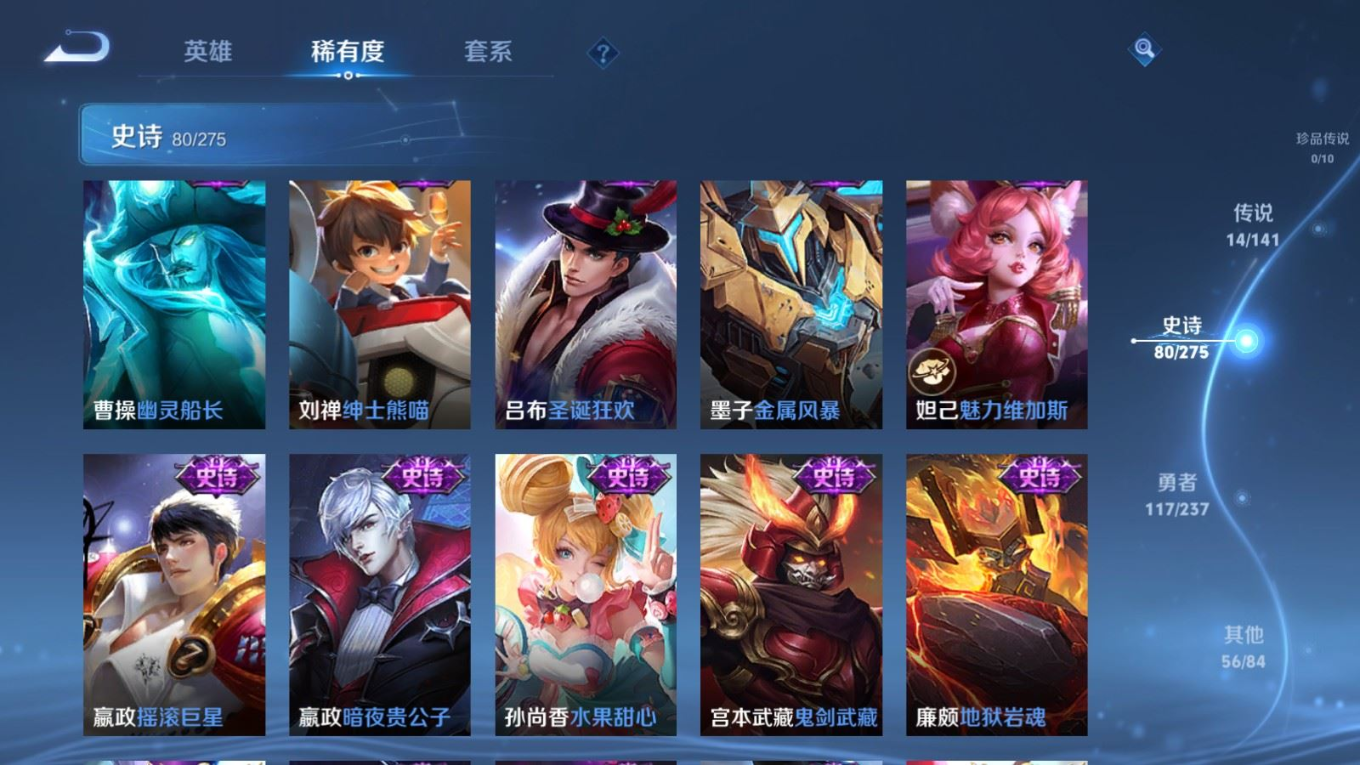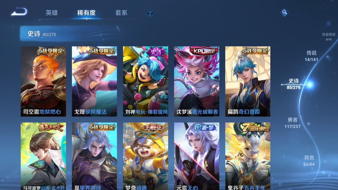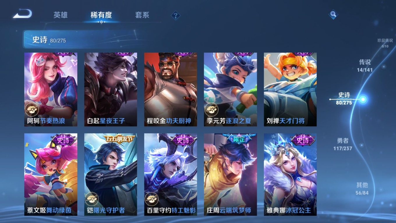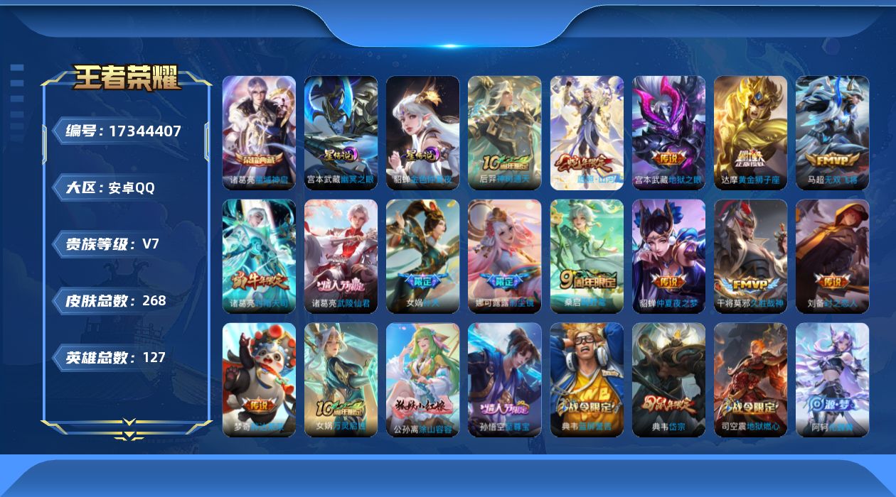 贵族等级:v7皮肤数:268传说品质14 生肖限定8 情人节限定2 荣耀典藏1 英雄数:127