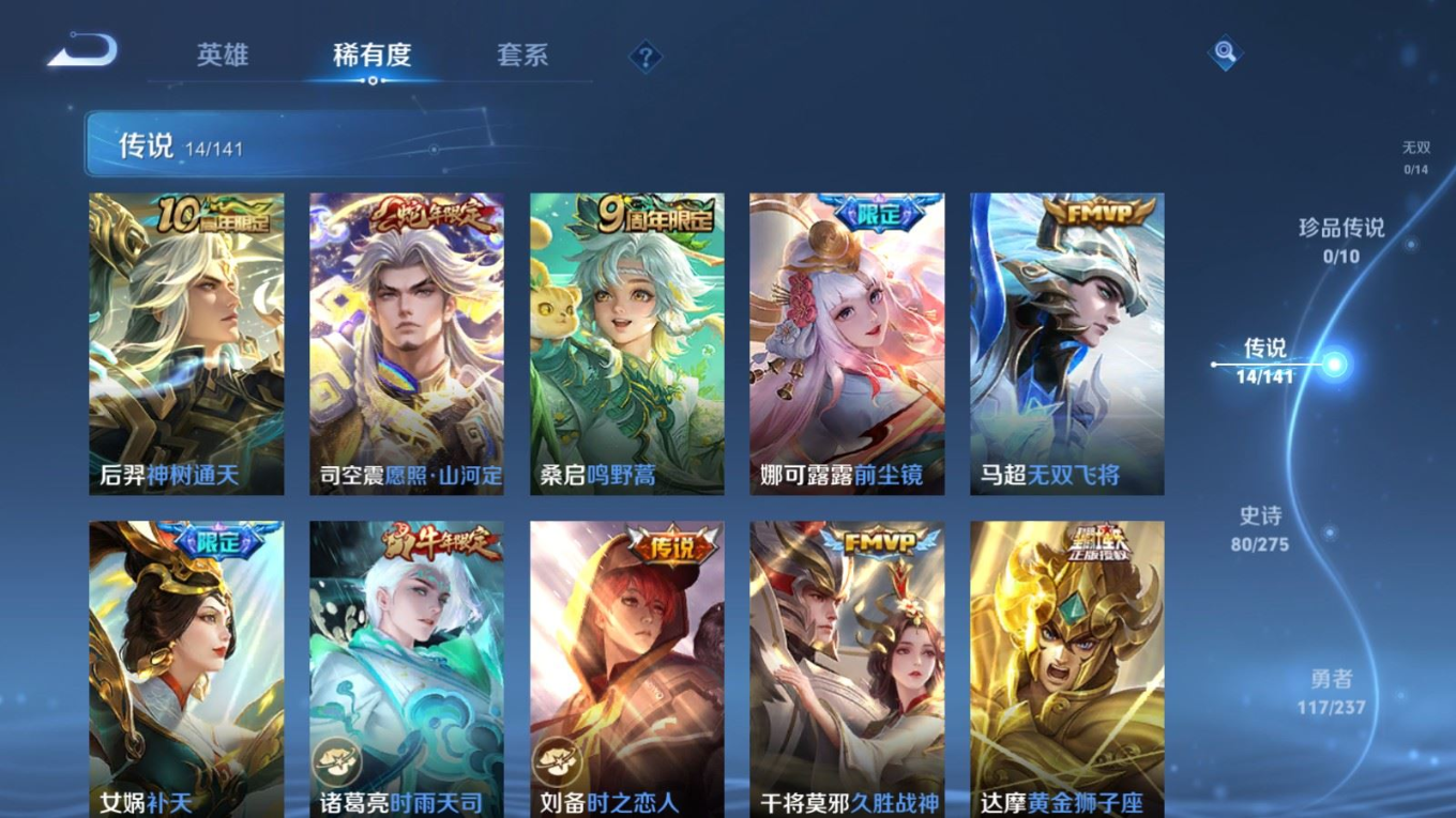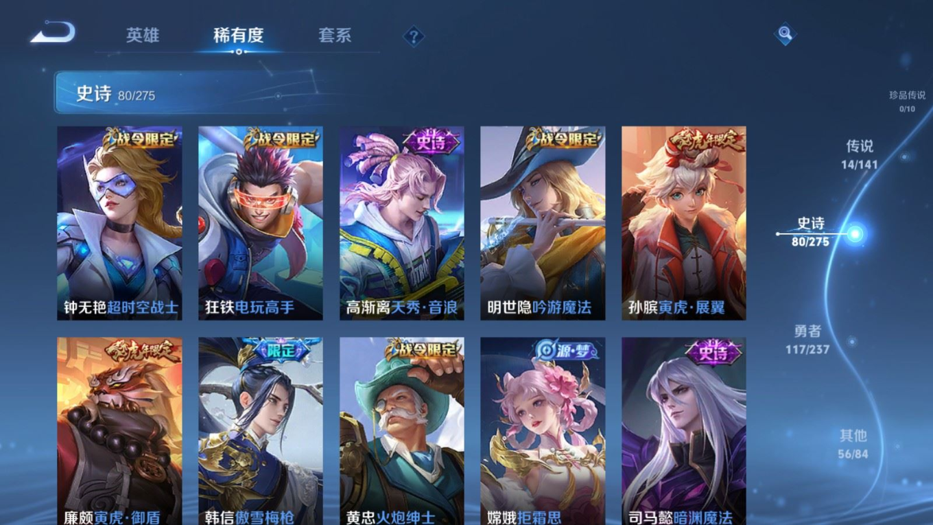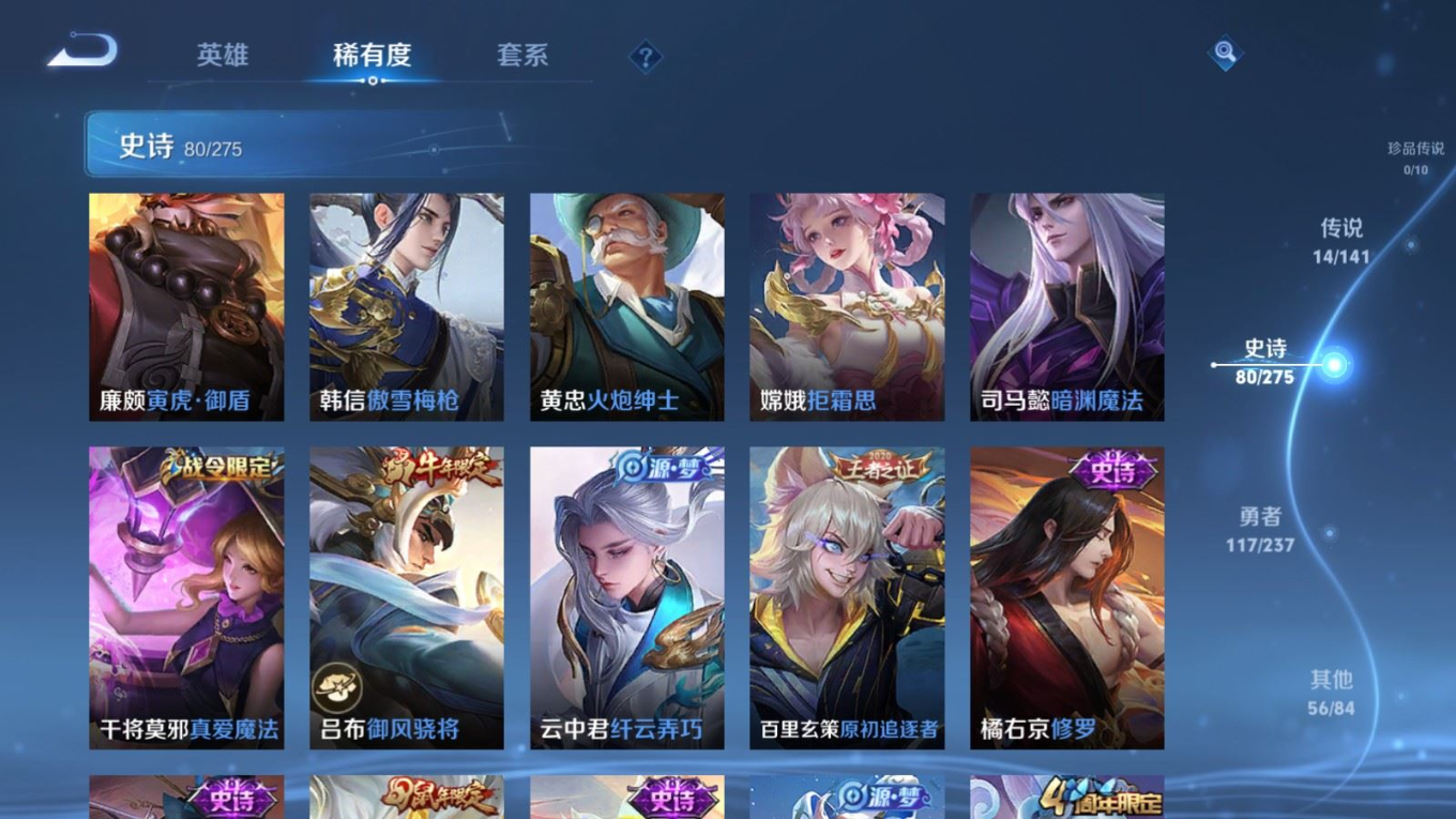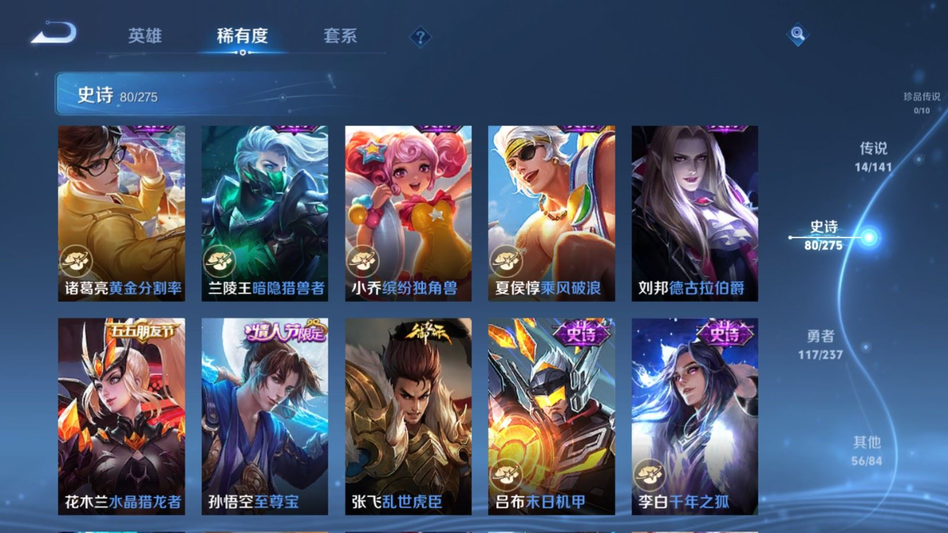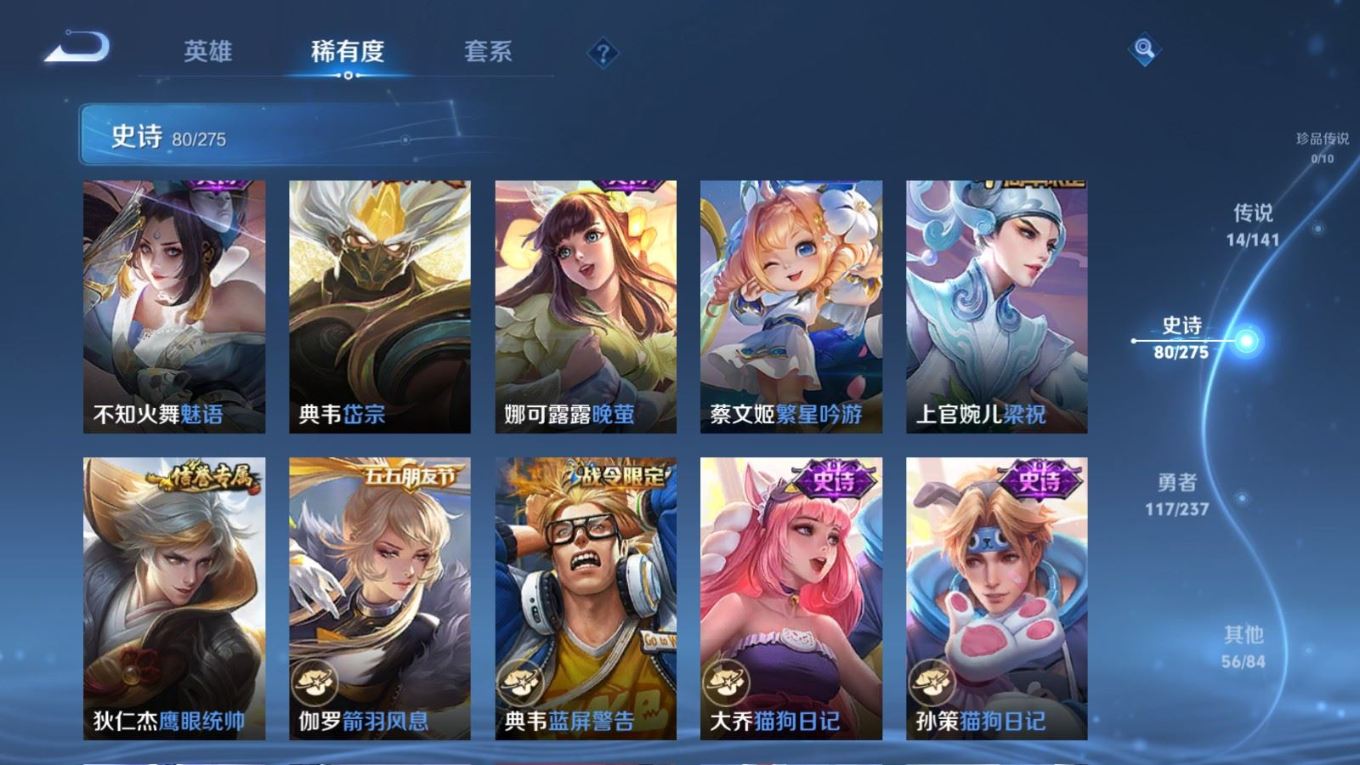 贵族等级:v7皮肤数:268传说品质14 生肖限定8 情人节限定2 荣耀典藏1 英雄数:127