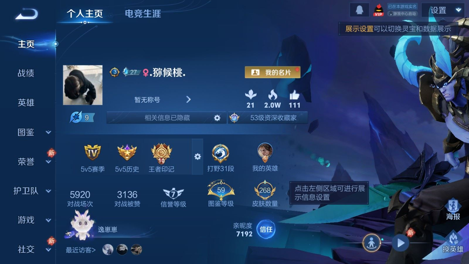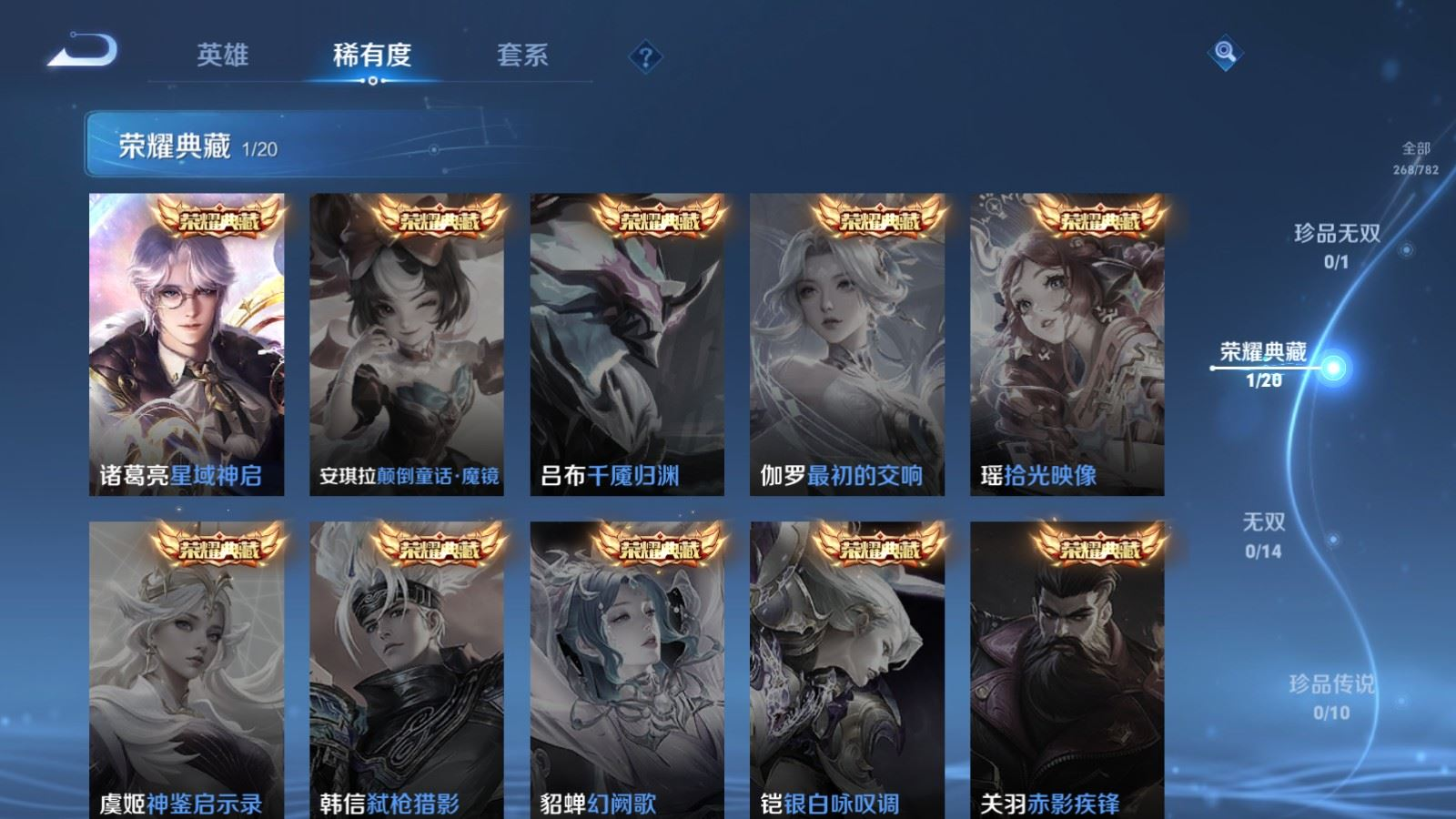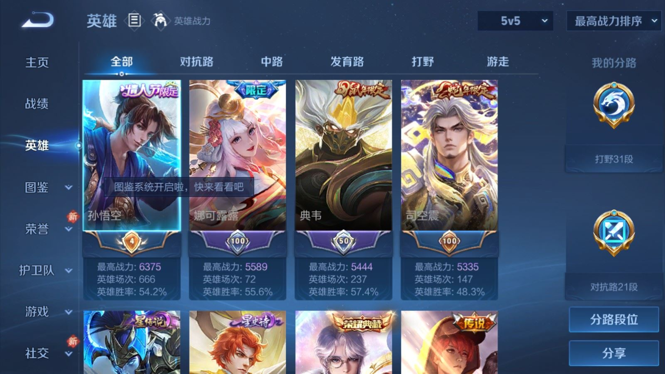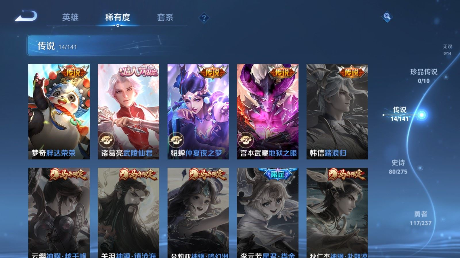 贵族等级:v7皮肤数:268传说品质14 生肖限定8 情人节限定2 荣耀典藏1 英雄数:127