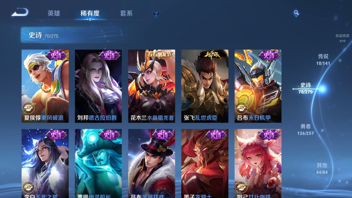贵族等级:v7皮肤数:254传说品质10 生肖限定1 荣耀典藏1 珍品传说3 英雄数:127