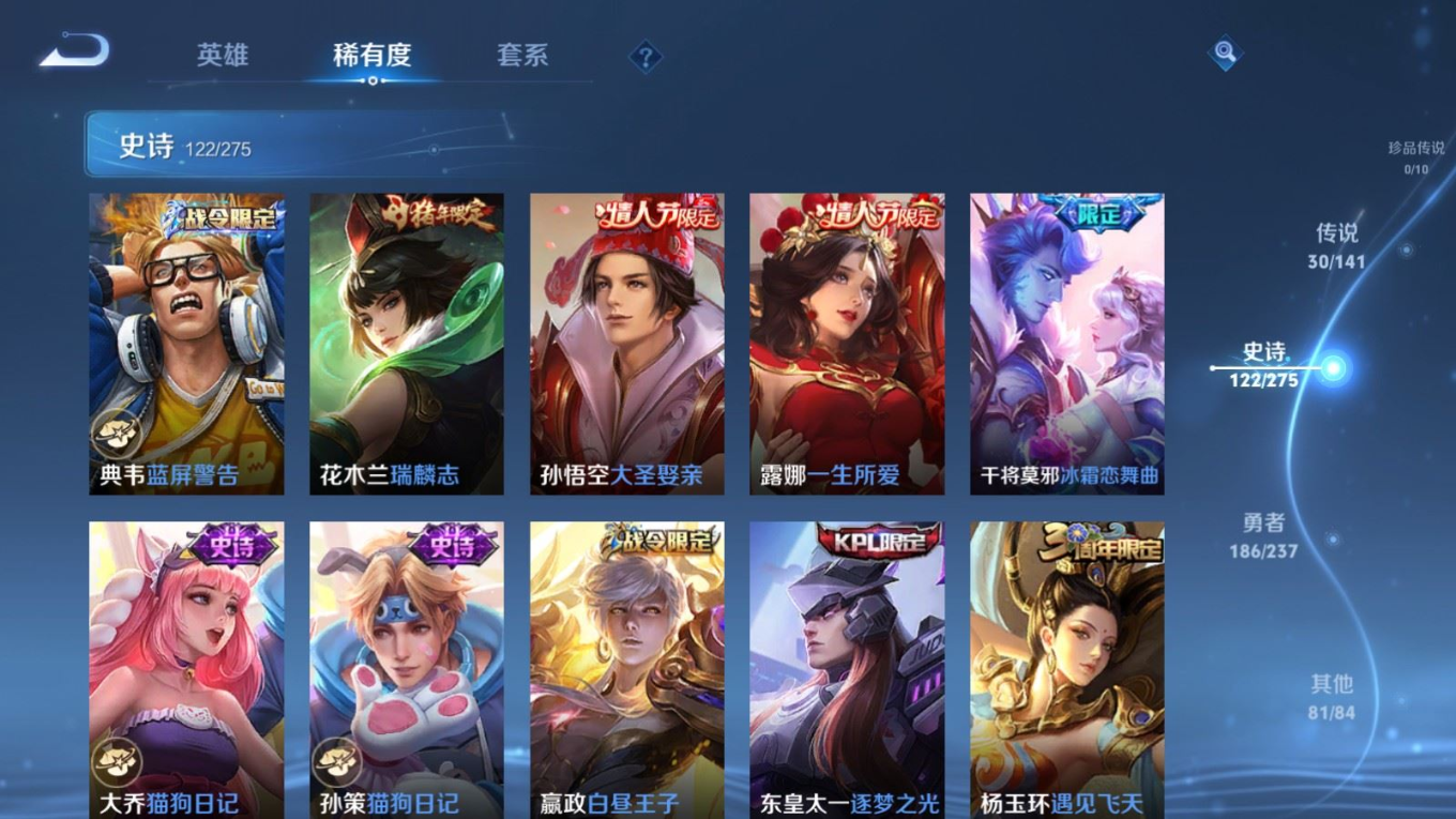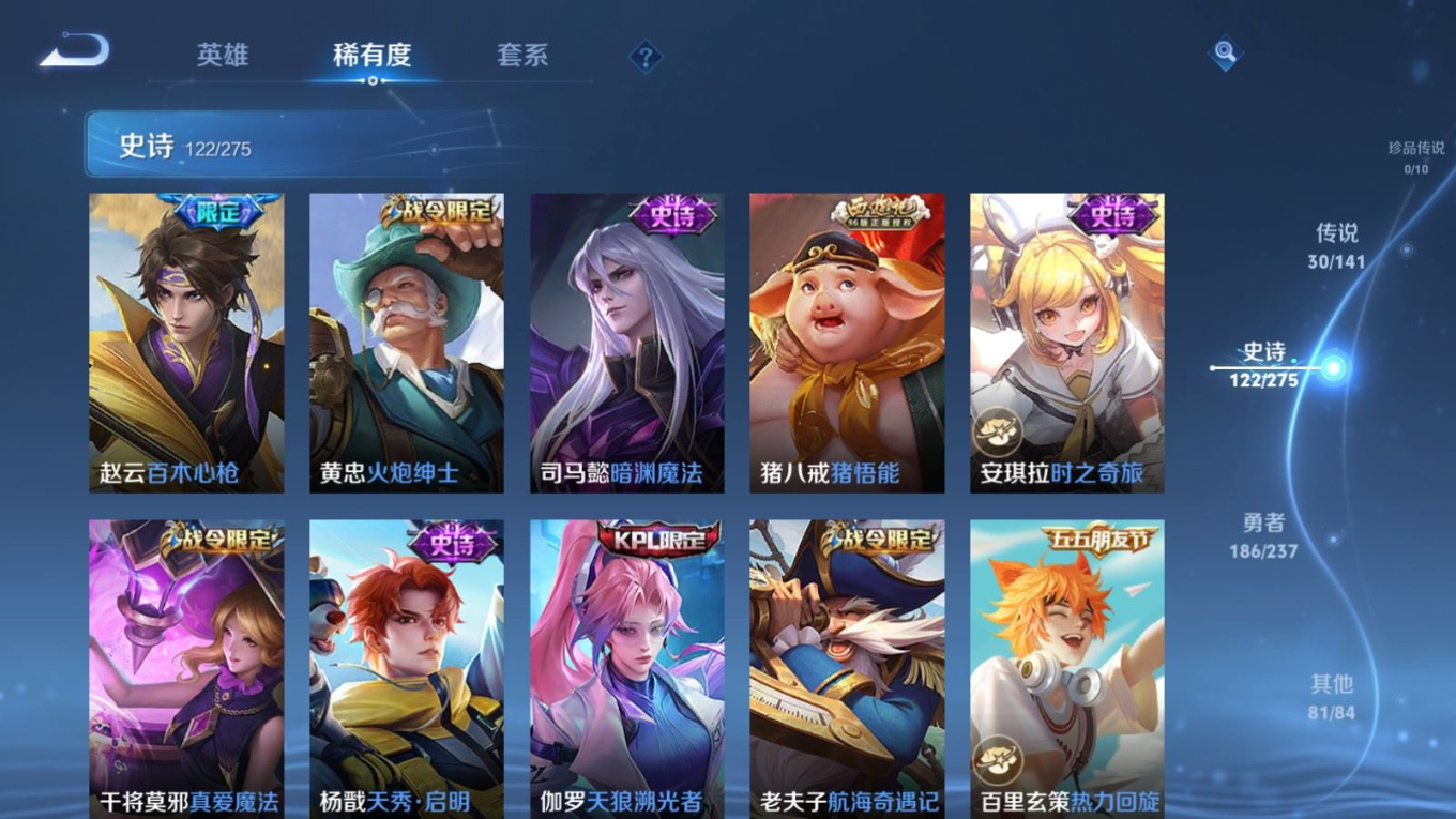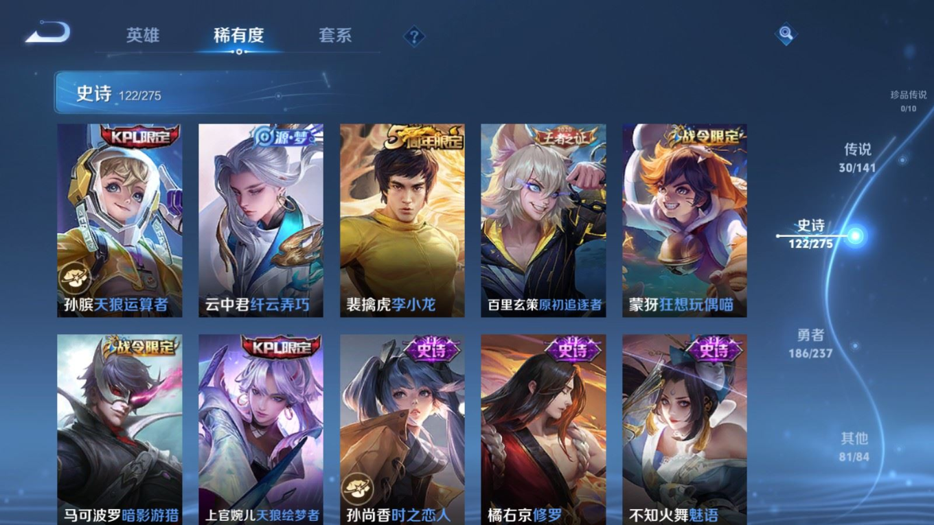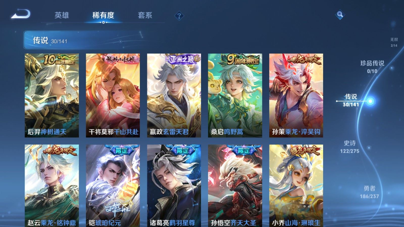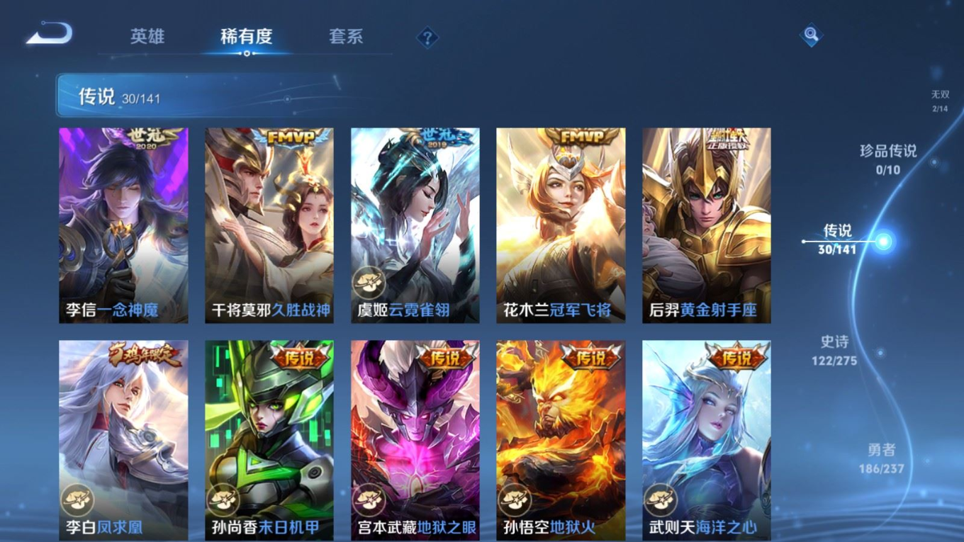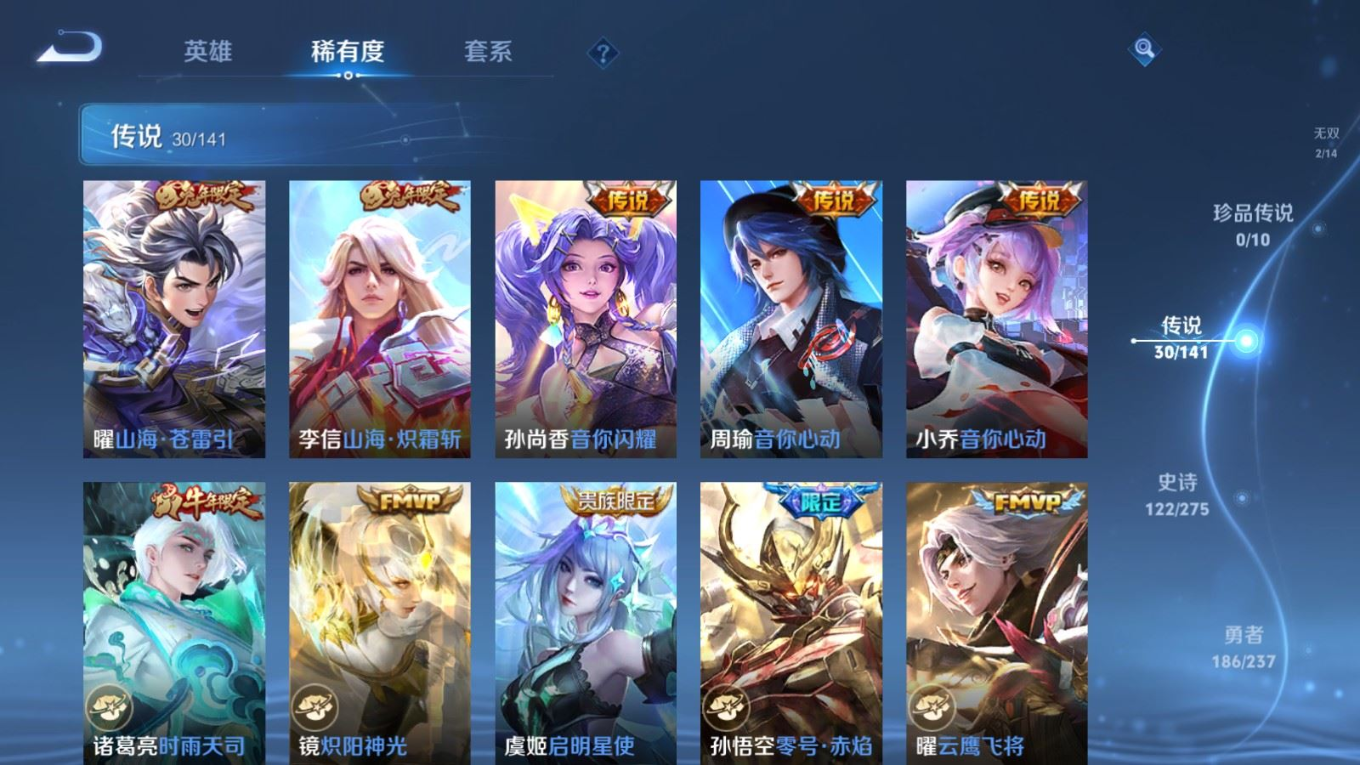 传说品质_后羿_黄金射手座传说品质_后羿_神树通天传说品质_诸葛亮_时雨天司传说品质_诸葛亮_鹤羽星尊传说品质_孙悟空_零号·赤焰传说品质_孙悟空_齐天大圣传说品质_孙悟空_地狱火传说品质_武则天_海洋之心传说品质_干将莫邪_千山共赴传说品质_干将莫邪_久胜战神传说品质_宫本武藏_地狱之眼传说品质_周瑜_音你心动传说品质_花木兰_冠军飞将传说品质_镜_炽阳神光传说品质_李信_一念神魔传说品质_李信_山海·炽霜斩传说品质_孙尚香_末日机甲传说品质_孙尚香_音你闪耀传说品质_小乔_音你心动传说品质_小乔_山海·琳琅生传说品质_桑启_鸣野蒿传说品质_李白_凤求凰传说品质_曜_云鹰飞将传说品质_曜_山海·苍雷引传说品质_孙策_乘龙·淬吴钩传说品质_铠_琥珀纪元传说品质_虞姬_云霓雀翎传说品质_虞姬_启明星使传说品质_嬴政_玄雷天君传说品质_赵云_乘龙·铭钟鼎