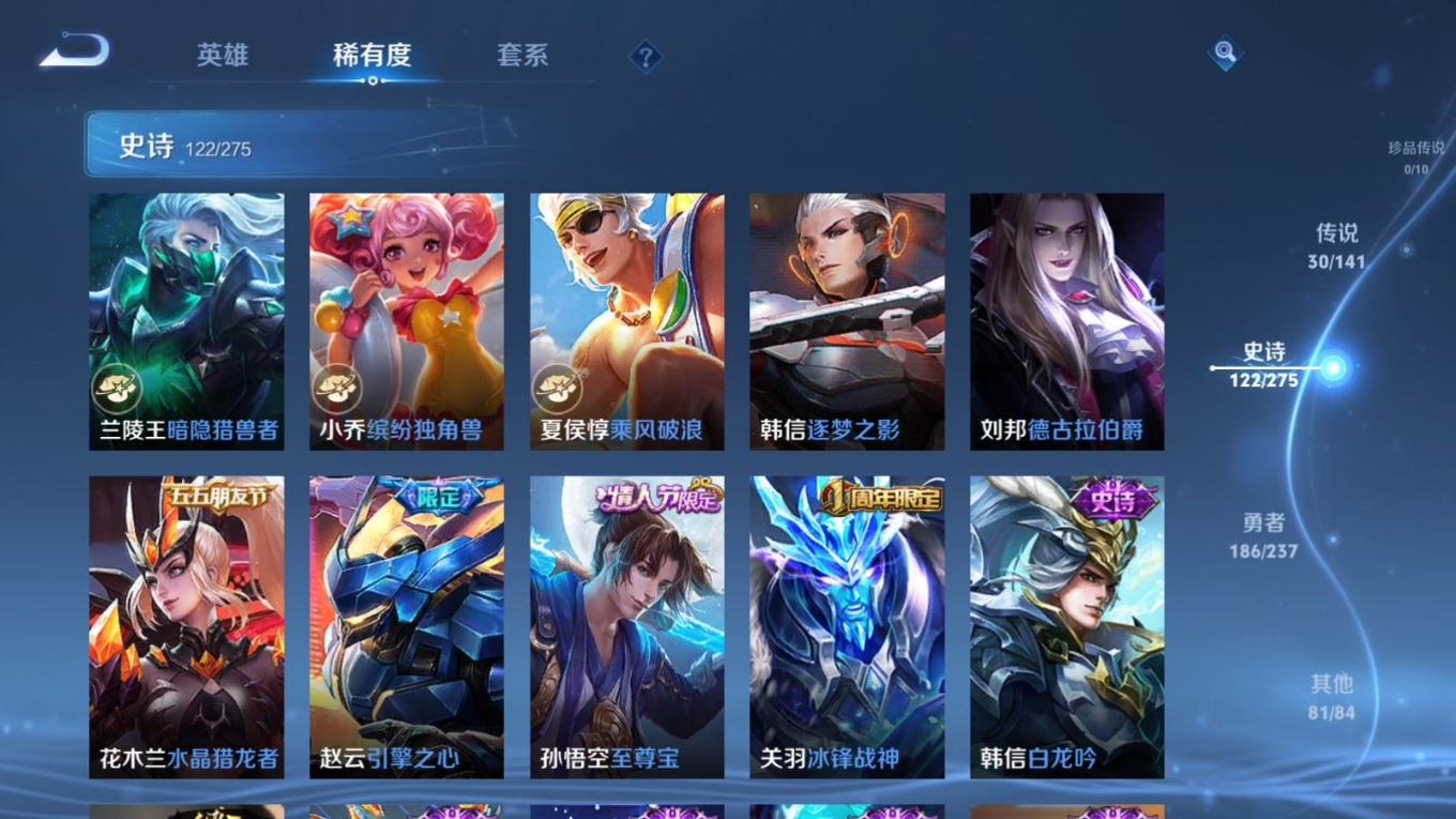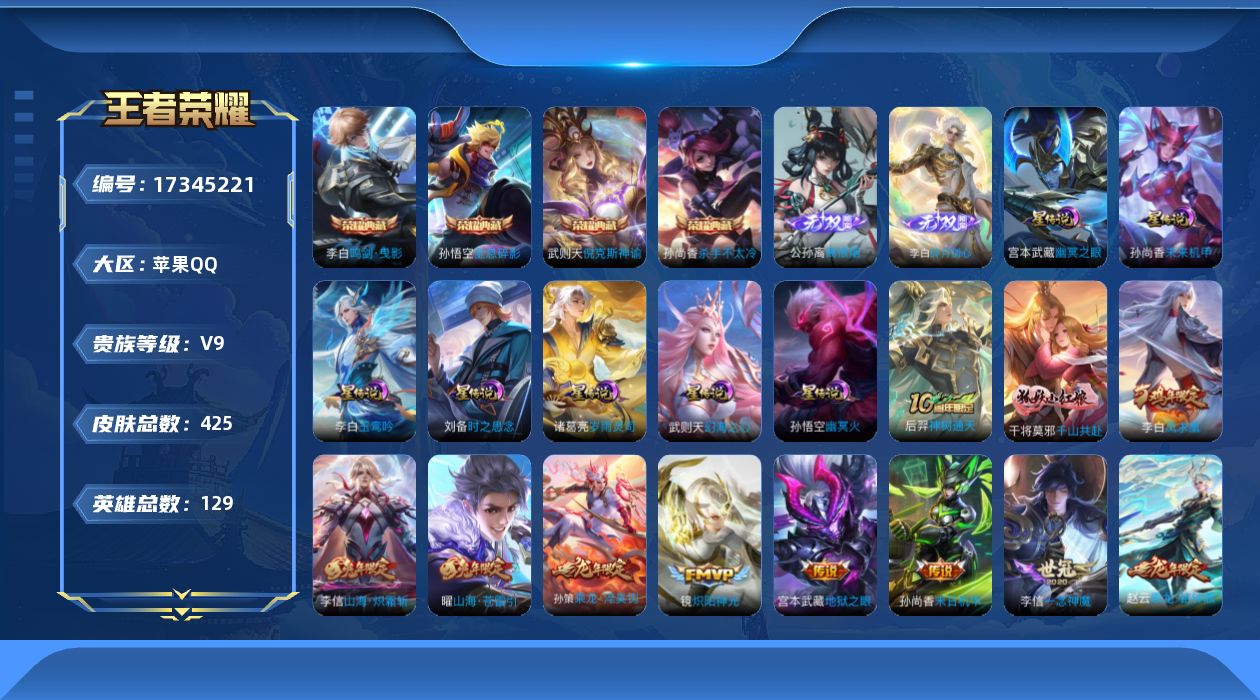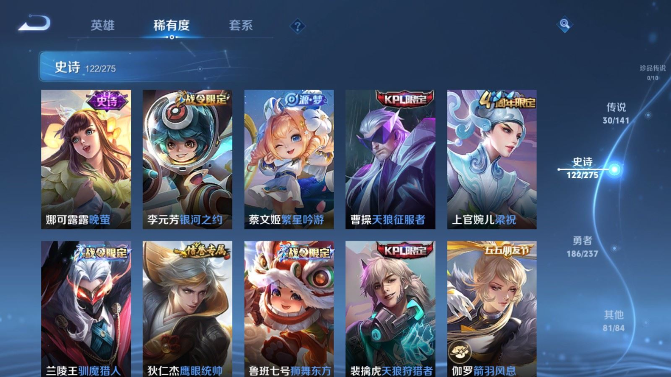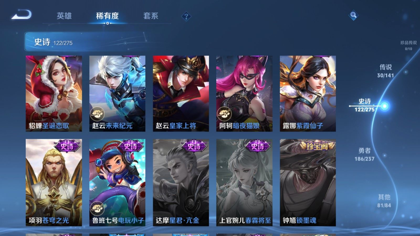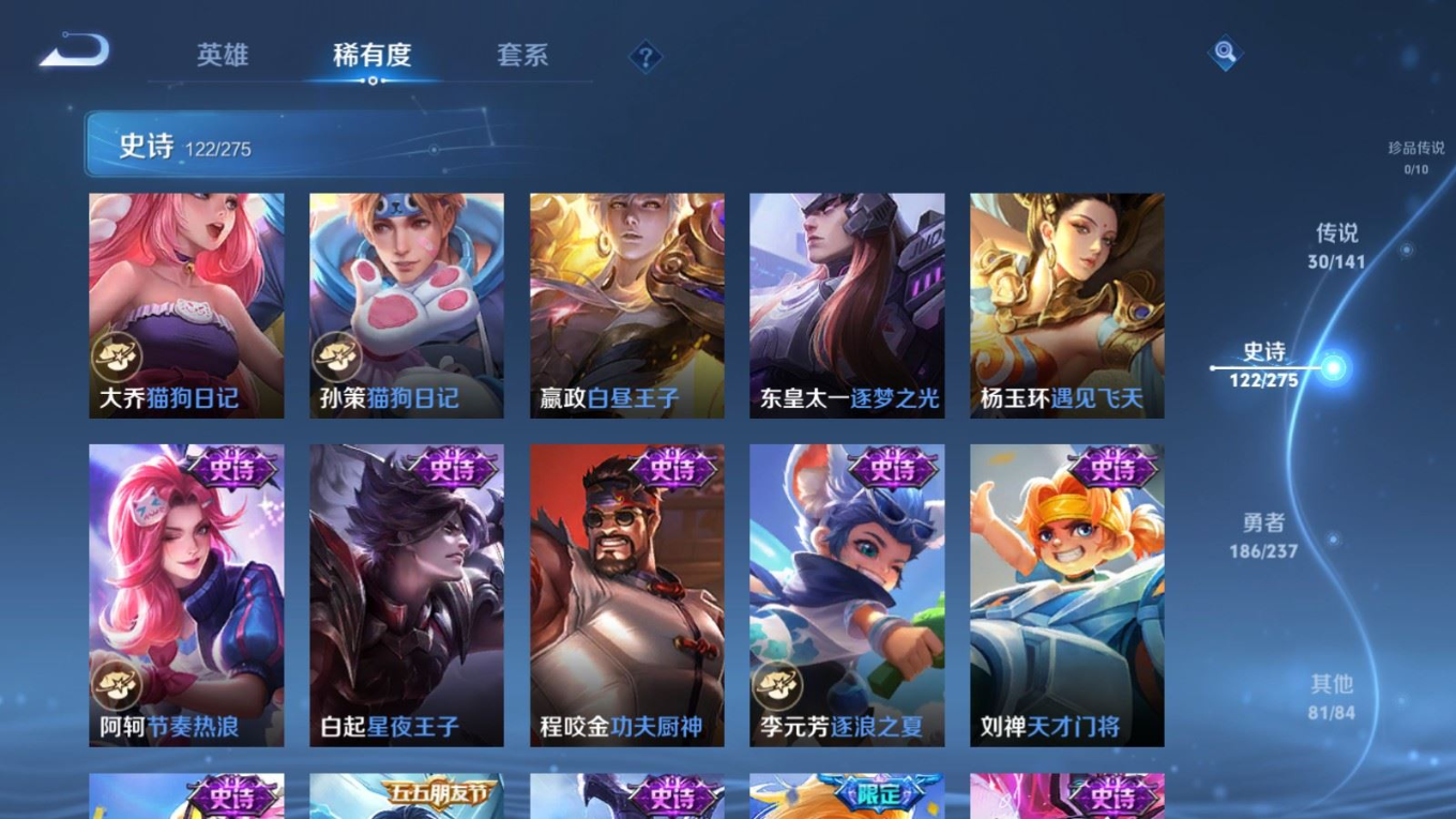 传说品质_后羿_黄金射手座传说品质_后羿_神树通天传说品质_诸葛亮_时雨天司传说品质_诸葛亮_鹤羽星尊传说品质_孙悟空_零号·赤焰传说品质_孙悟空_齐天大圣传说品质_孙悟空_地狱火传说品质_武则天_海洋之心传说品质_干将莫邪_千山共赴传说品质_干将莫邪_久胜战神传说品质_宫本武藏_地狱之眼传说品质_周瑜_音你心动传说品质_花木兰_冠军飞将传说品质_镜_炽阳神光传说品质_李信_一念神魔传说品质_李信_山海·炽霜斩传说品质_孙尚香_末日机甲传说品质_孙尚香_音你闪耀传说品质_小乔_音你心动传说品质_小乔_山海·琳琅生传说品质_桑启_鸣野蒿传说品质_李白_凤求凰传说品质_曜_云鹰飞将传说品质_曜_山海·苍雷引传说品质_孙策_乘龙·淬吴钩传说品质_铠_琥珀纪元传说品质_虞姬_云霓雀翎传说品质_虞姬_启明星使传说品质_嬴政_玄雷天君传说品质_赵云_乘龙·铭钟鼎