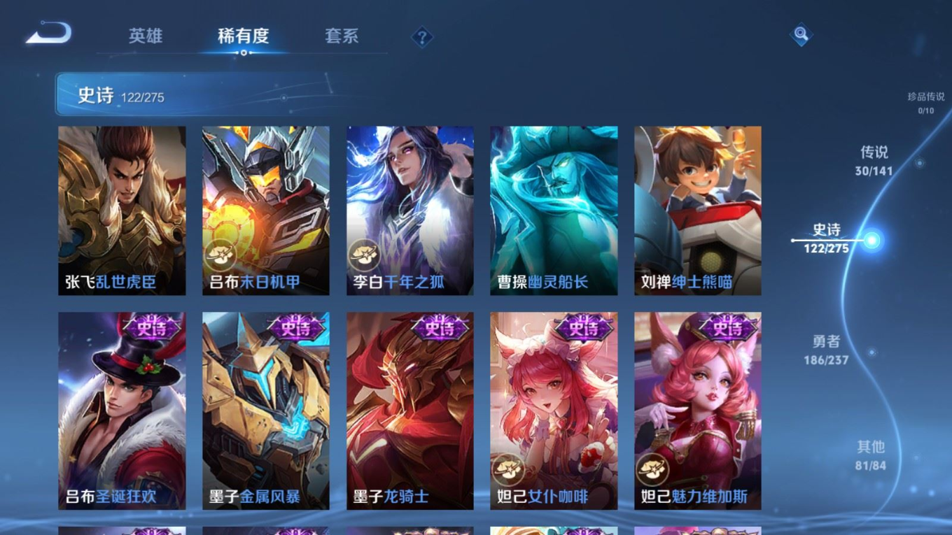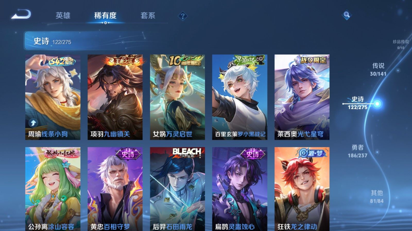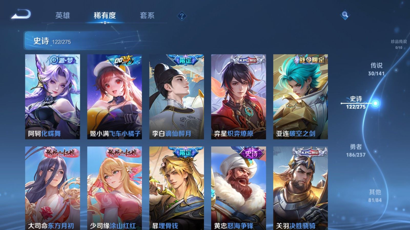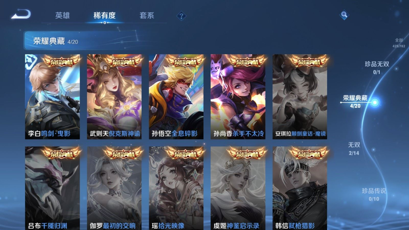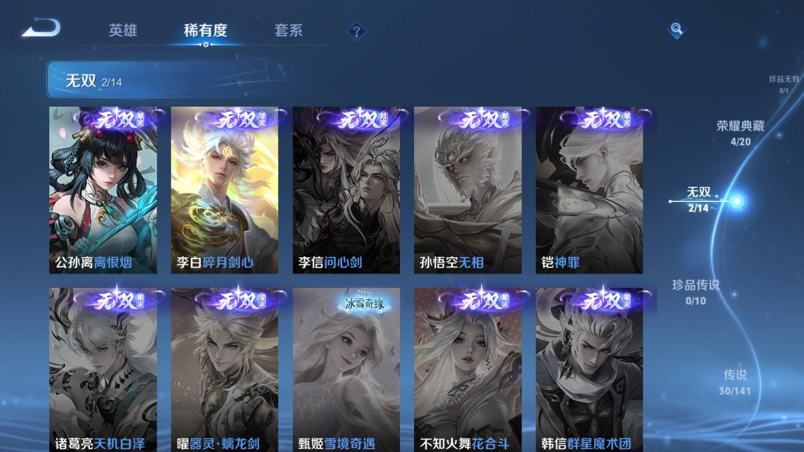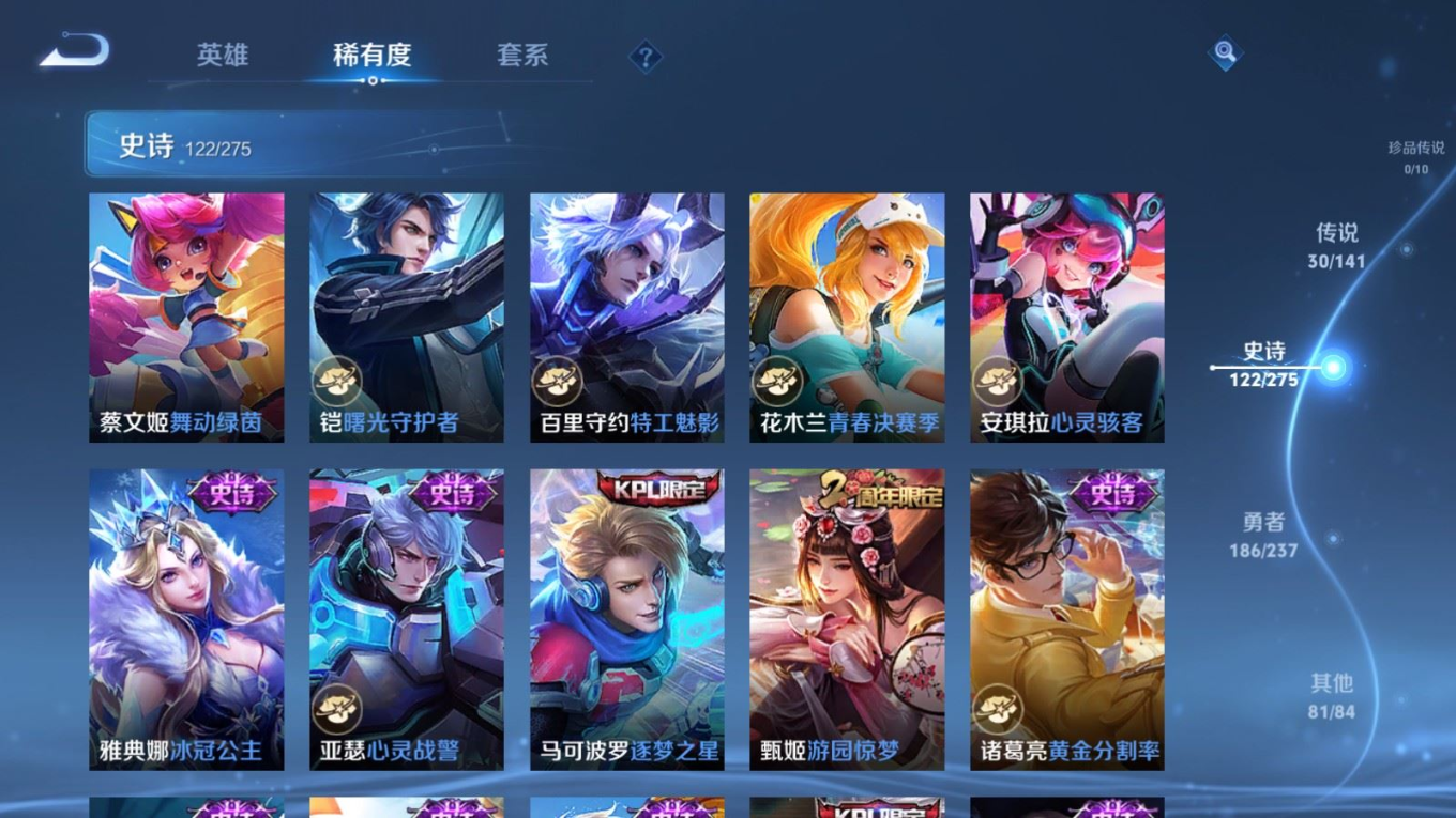 传说品质_后羿_黄金射手座传说品质_后羿_神树通天传说品质_诸葛亮_时雨天司传说品质_诸葛亮_鹤羽星尊传说品质_孙悟空_零号·赤焰传说品质_孙悟空_齐天大圣传说品质_孙悟空_地狱火传说品质_武则天_海洋之心传说品质_干将莫邪_千山共赴传说品质_干将莫邪_久胜战神传说品质_宫本武藏_地狱之眼传说品质_周瑜_音你心动传说品质_花木兰_冠军飞将传说品质_镜_炽阳神光传说品质_李信_一念神魔传说品质_李信_山海·炽霜斩传说品质_孙尚香_末日机甲传说品质_孙尚香_音你闪耀传说品质_小乔_音你心动传说品质_小乔_山海·琳琅生传说品质_桑启_鸣野蒿传说品质_李白_凤求凰传说品质_曜_云鹰飞将传说品质_曜_山海·苍雷引传说品质_孙策_乘龙·淬吴钩传说品质_铠_琥珀纪元传说品质_虞姬_云霓雀翎传说品质_虞姬_启明星使传说品质_嬴政_玄雷天君传说品质_赵云_乘龙·铭钟鼎