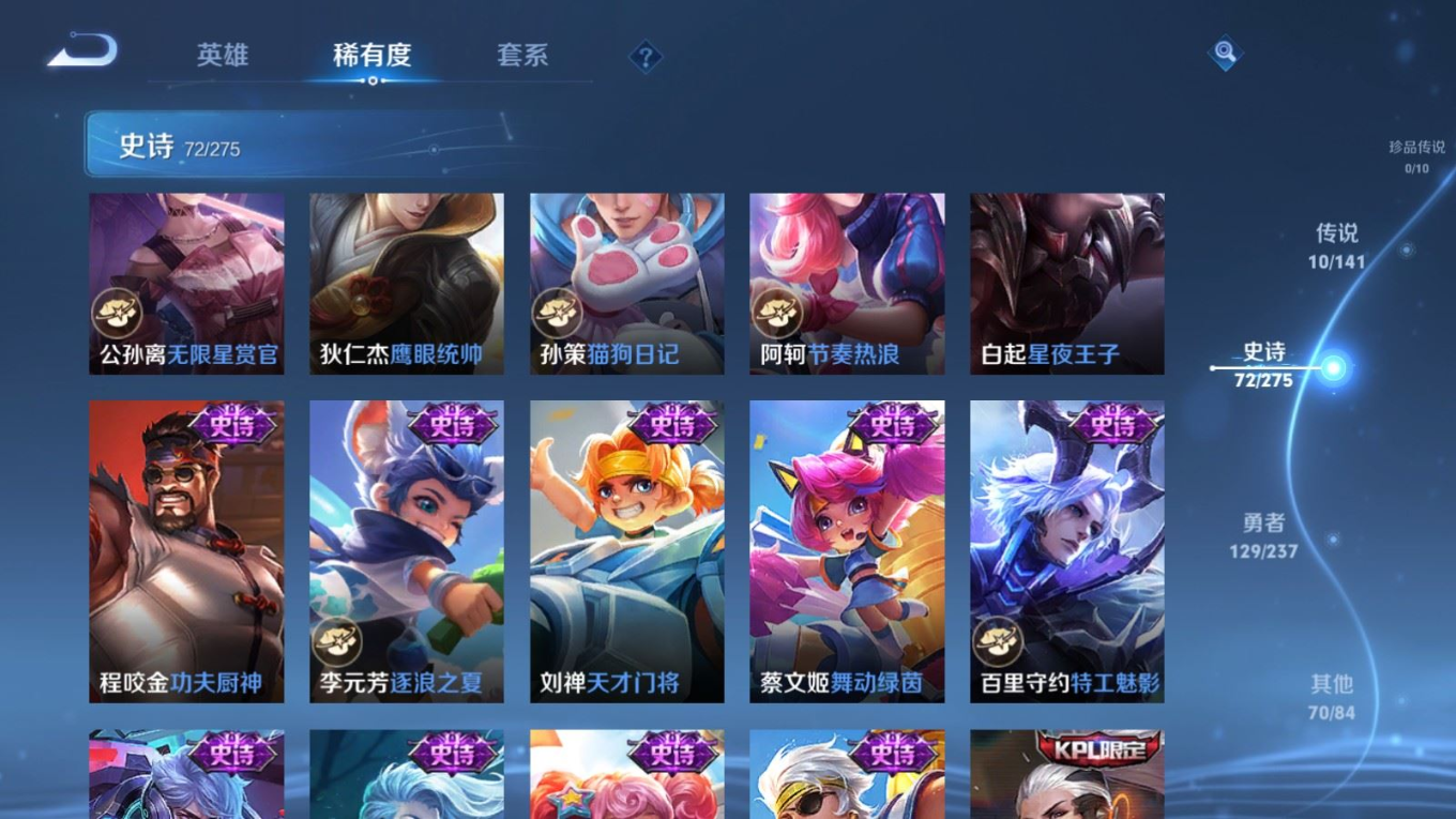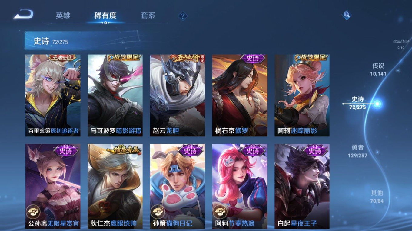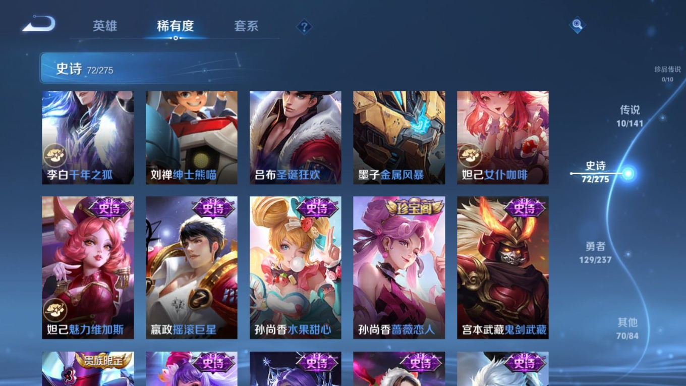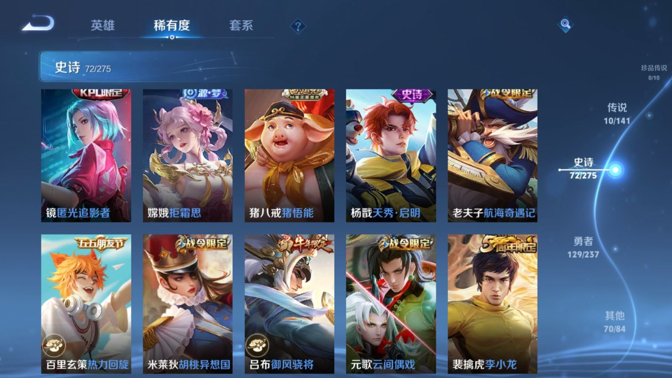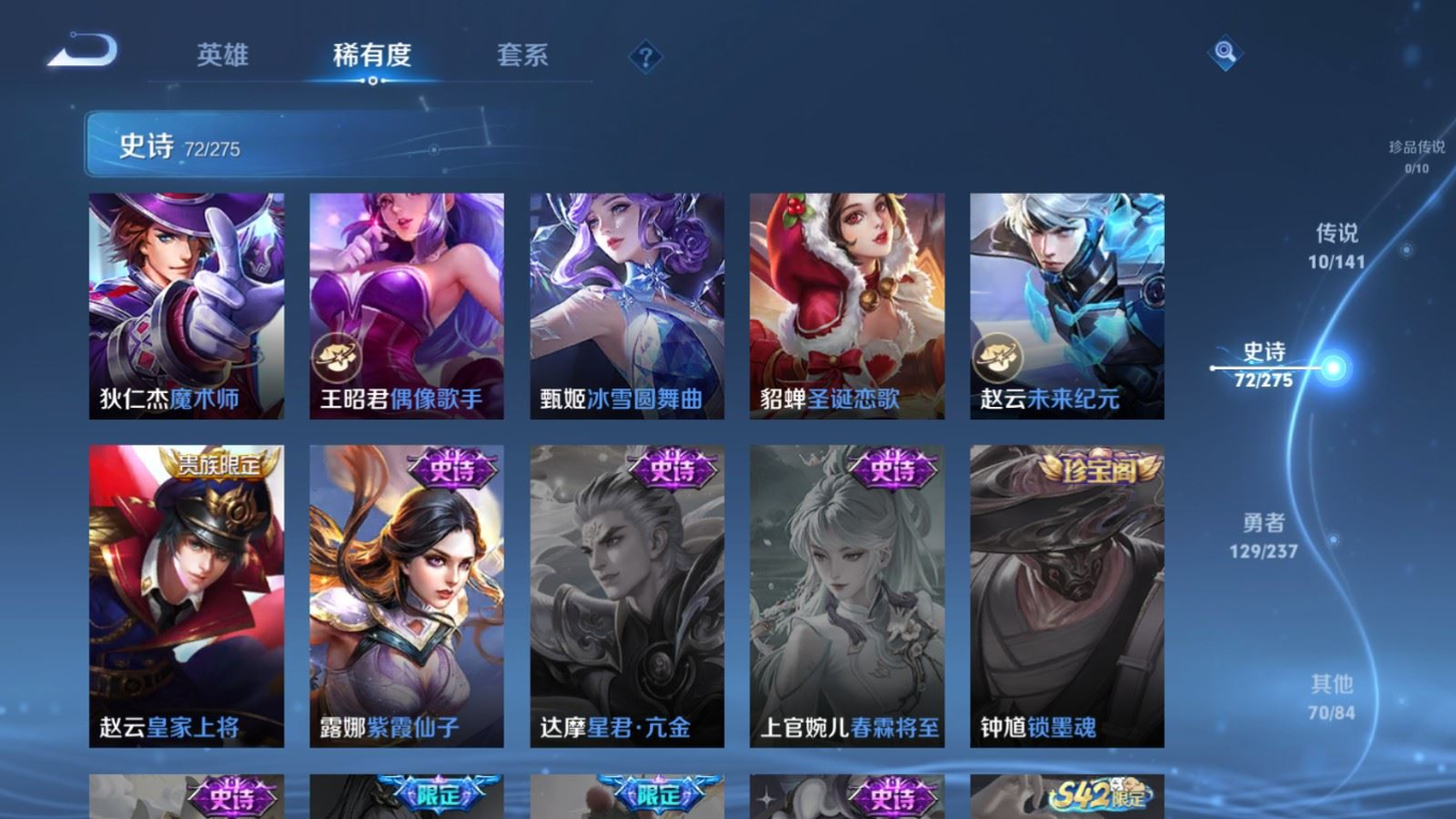 贵族等级:v7皮肤数:283传说品质10 生肖限定4 情人节限定1 荣耀典藏2 英雄数:124