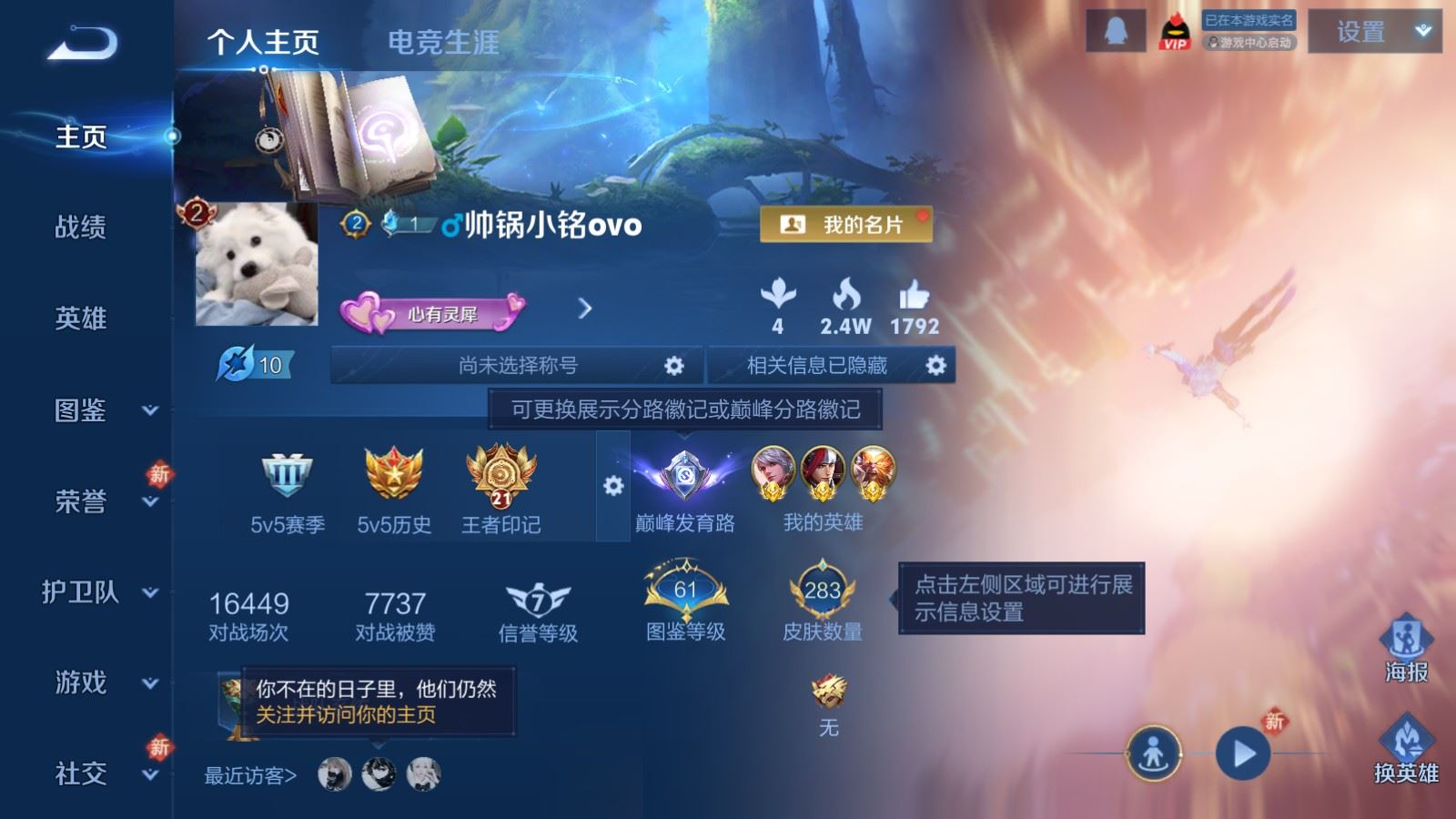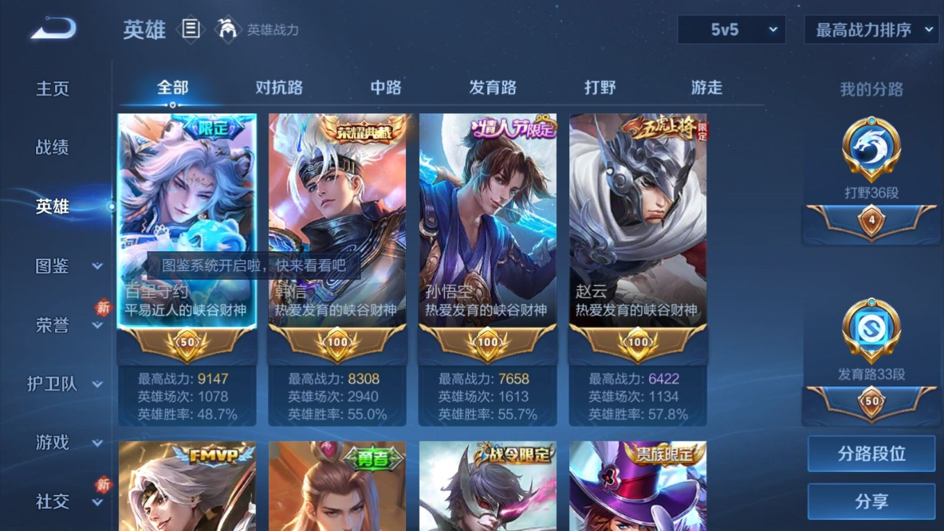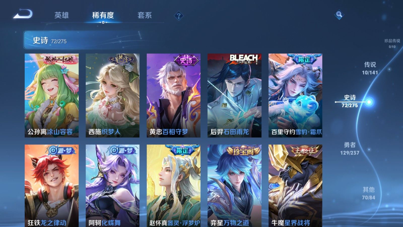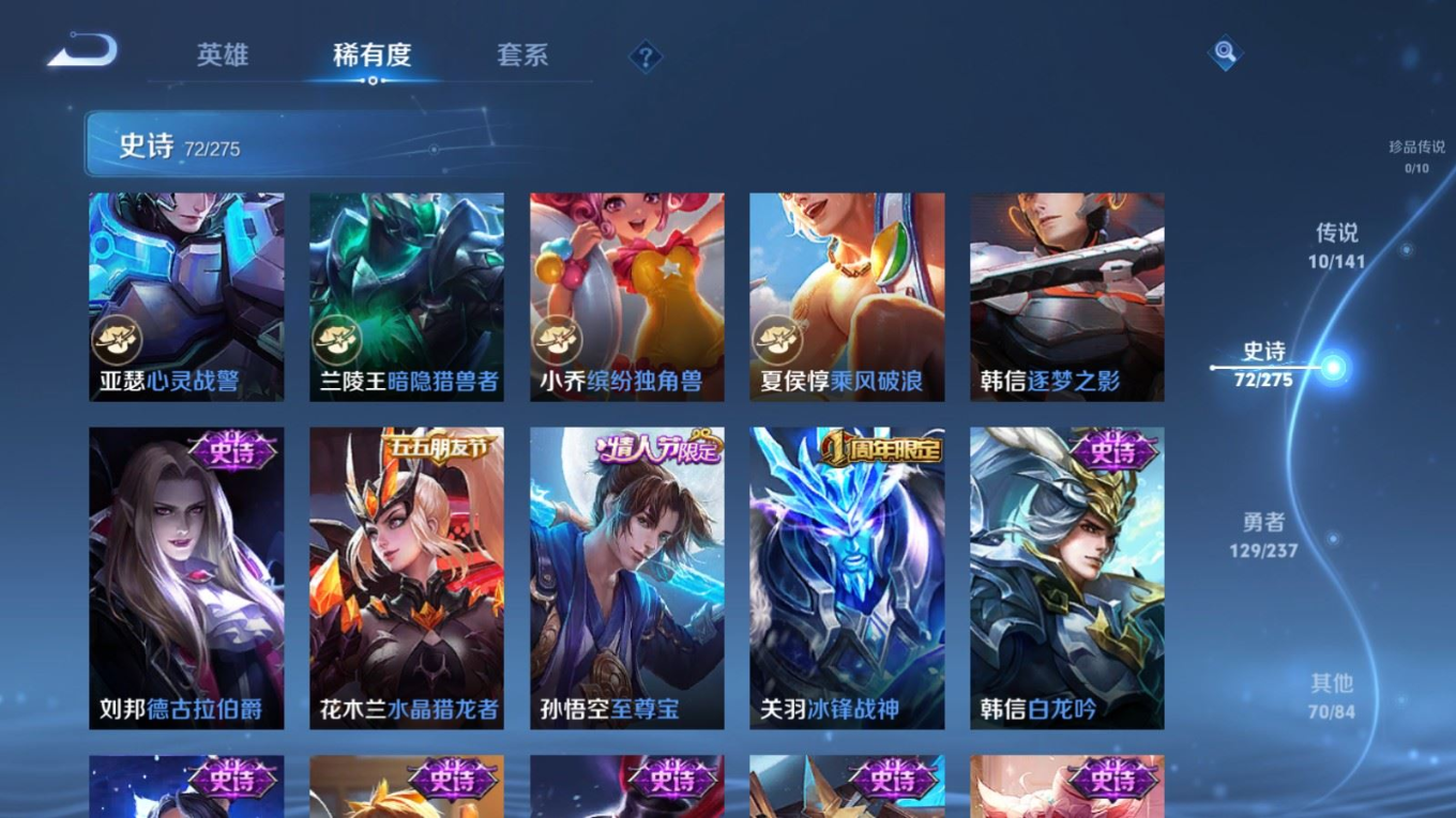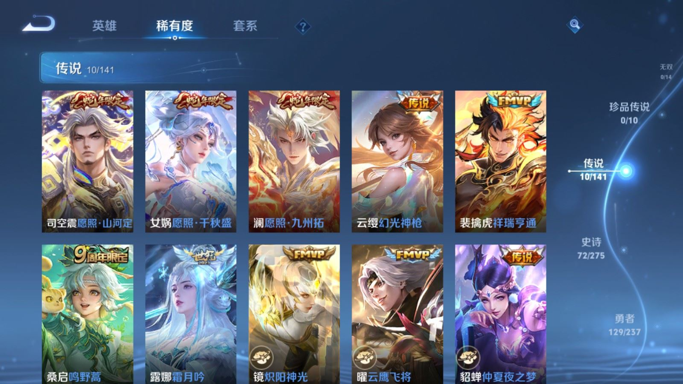 贵族等级:v7皮肤数:283传说品质10 生肖限定4 情人节限定1 荣耀典藏2 英雄数:124