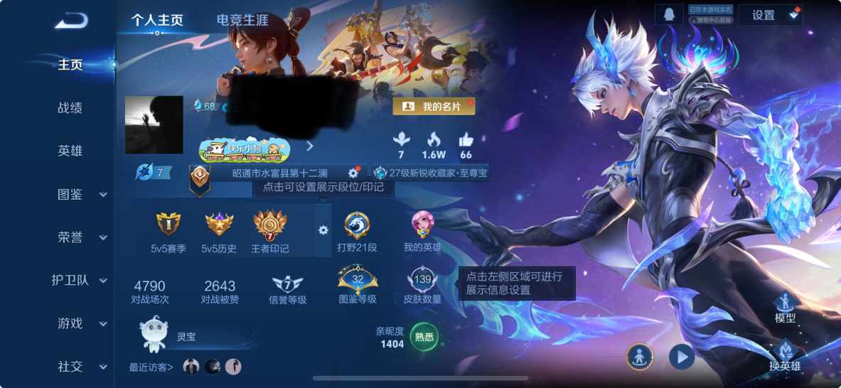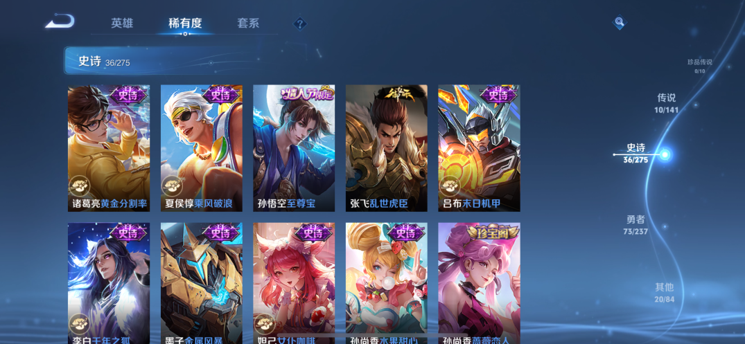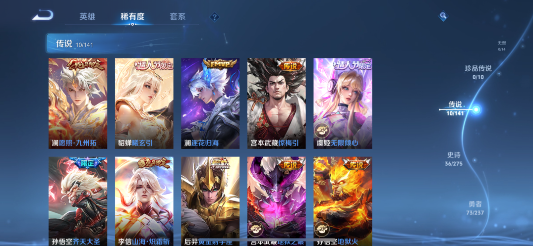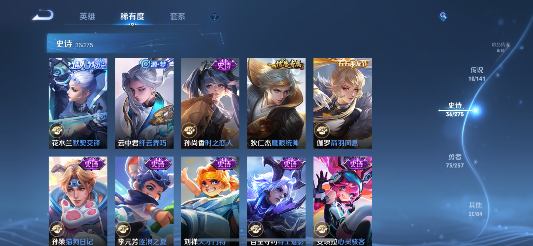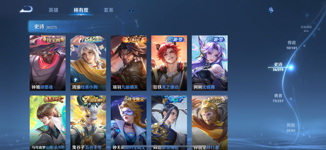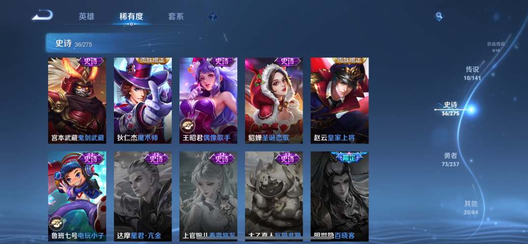 贵族等级:v7皮肤数:139传说品质10 生肖限定3 情人节限定4 英雄数:126