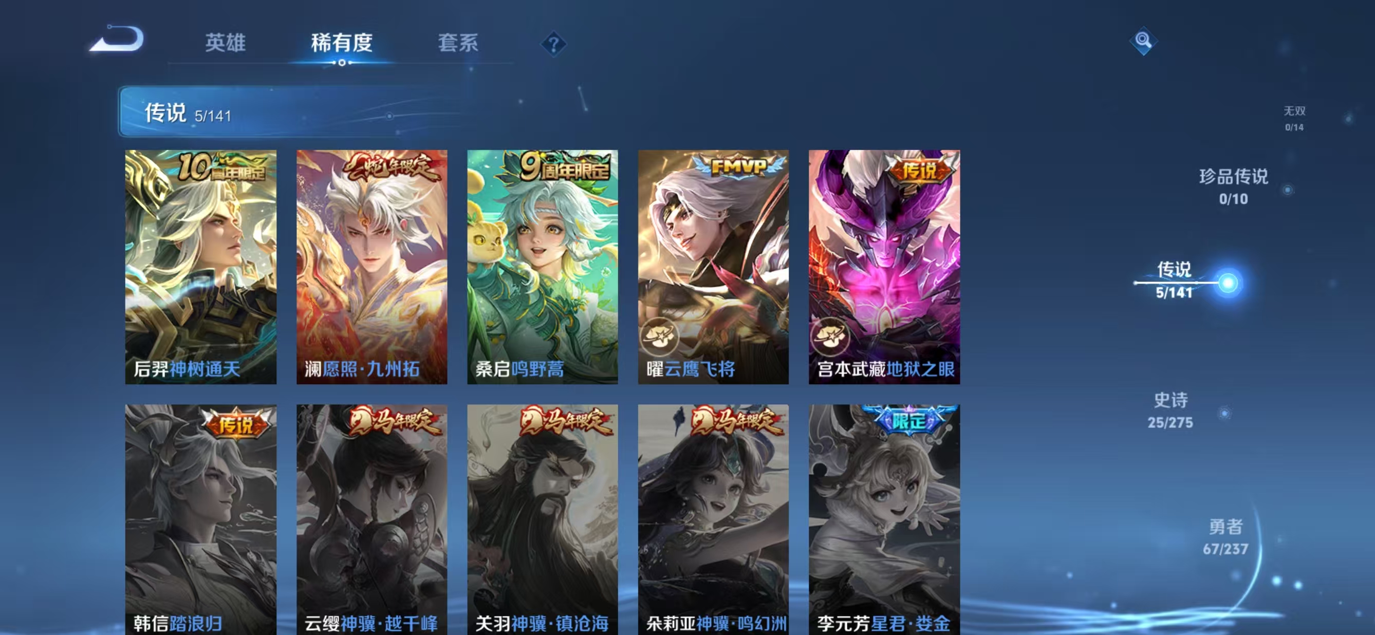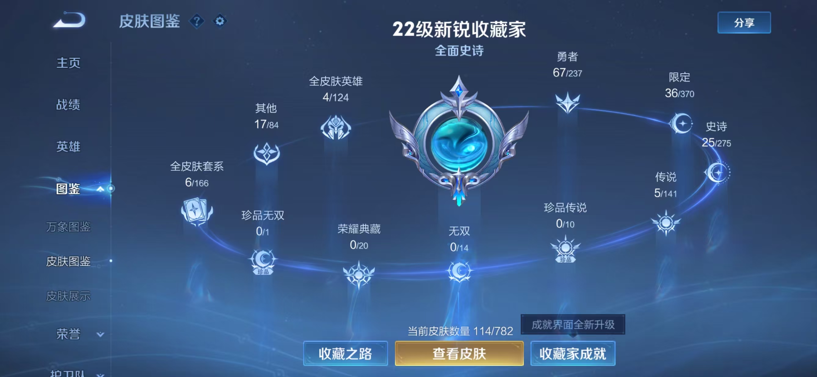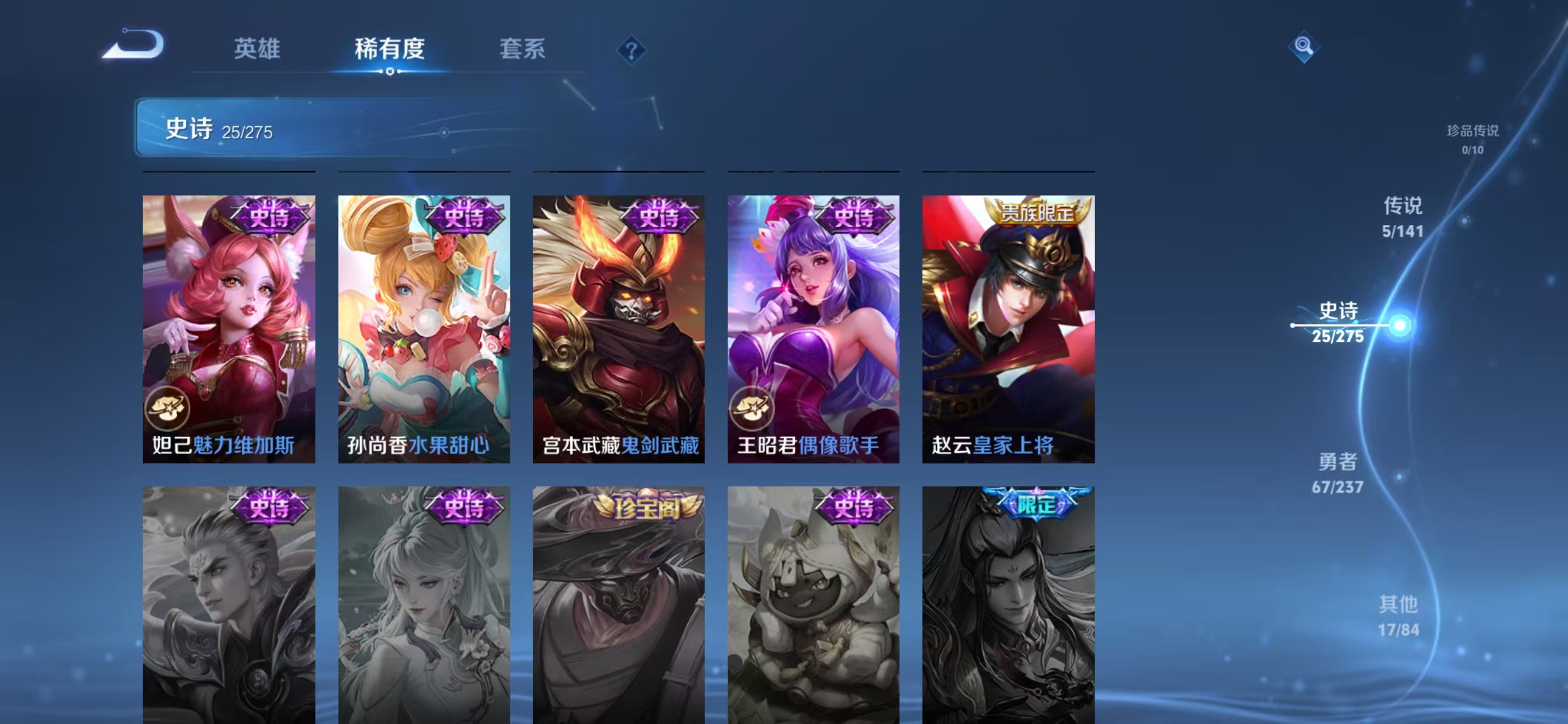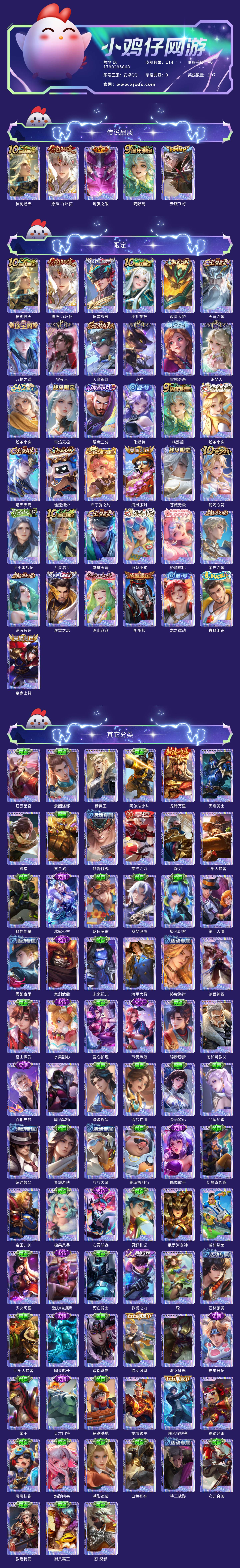 贵族等级:v6皮肤数:114传说品质5 生肖限定1 英雄数:107