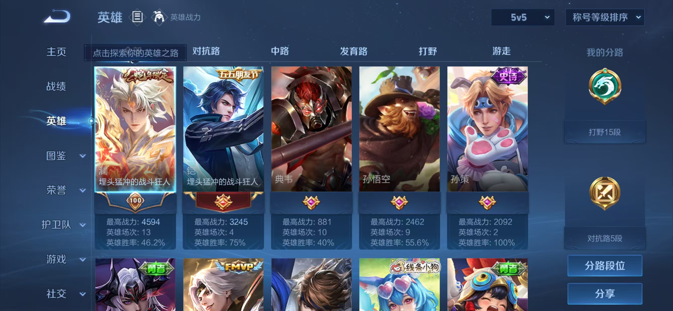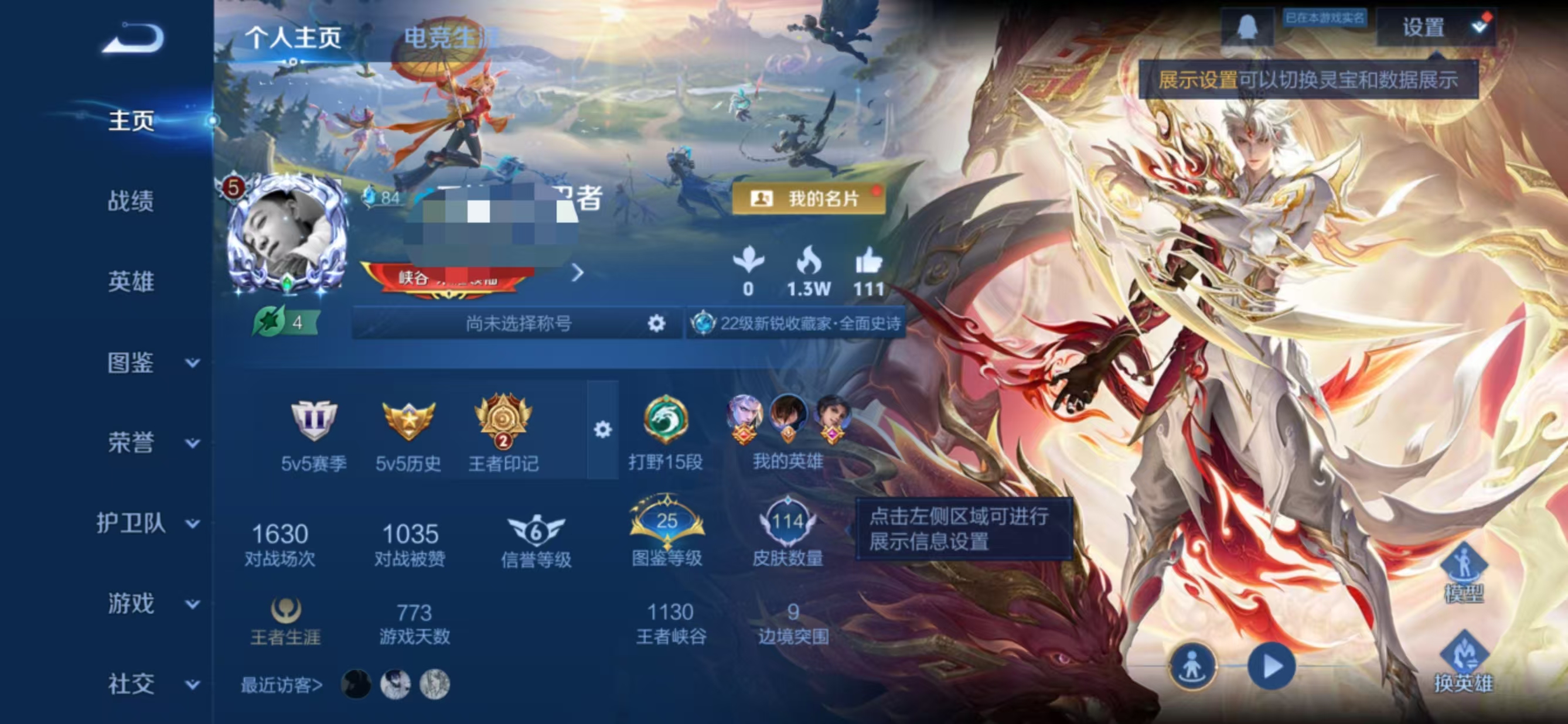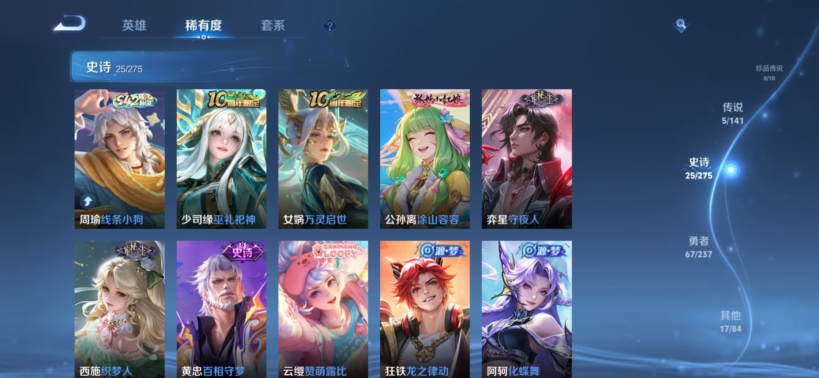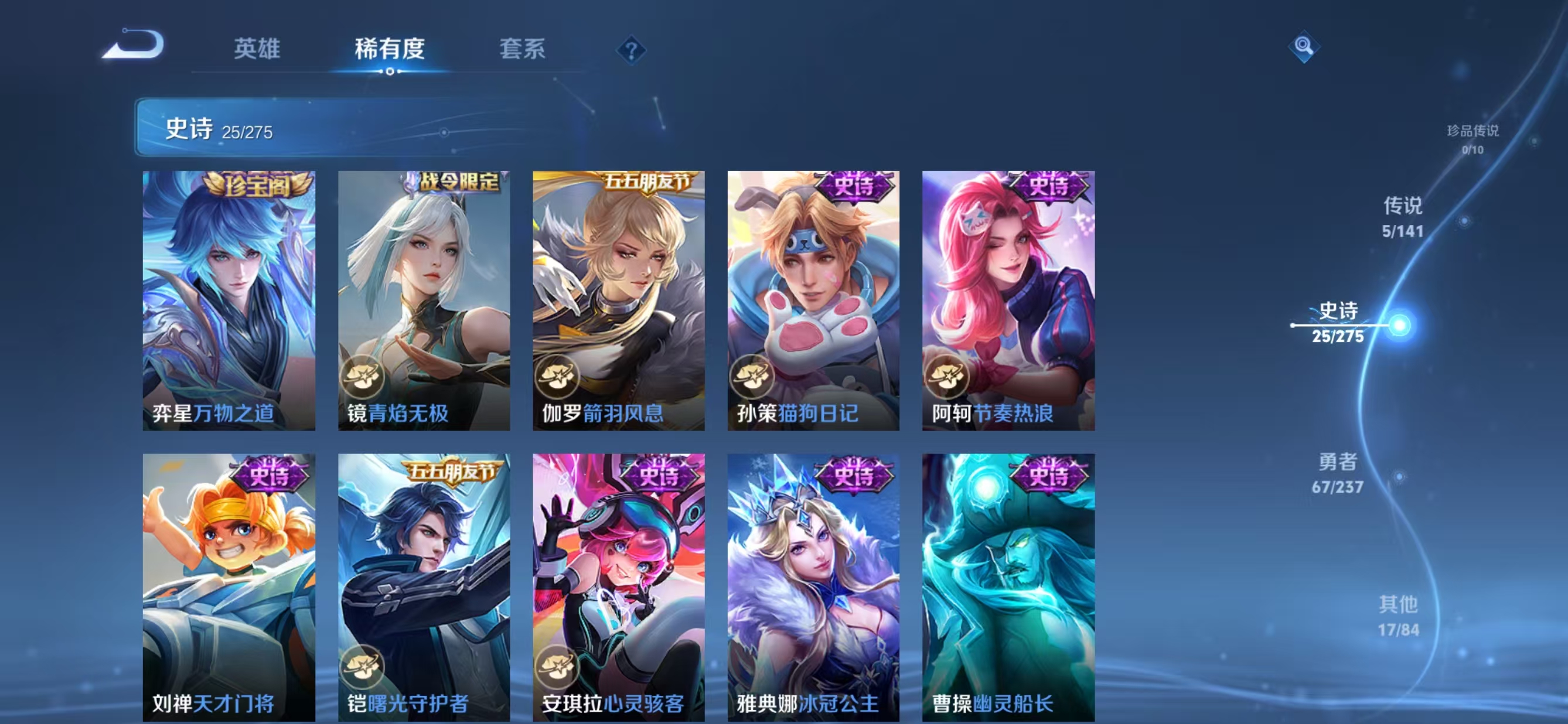 贵族等级:v6皮肤数:114传说品质5 生肖限定1 英雄数:107