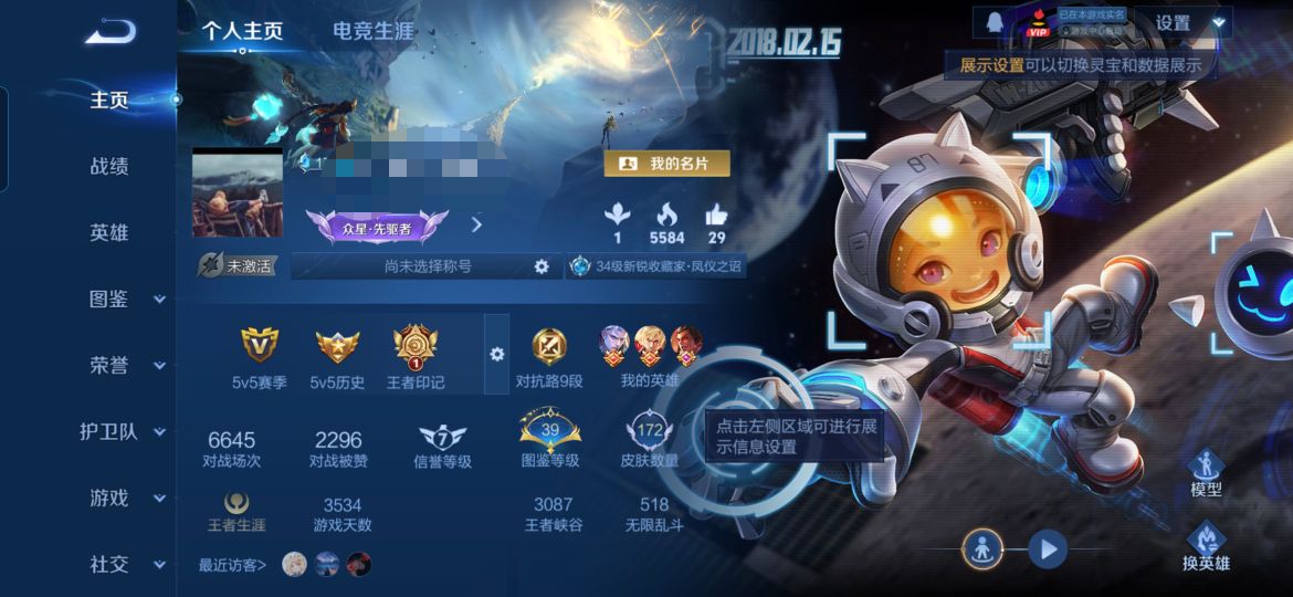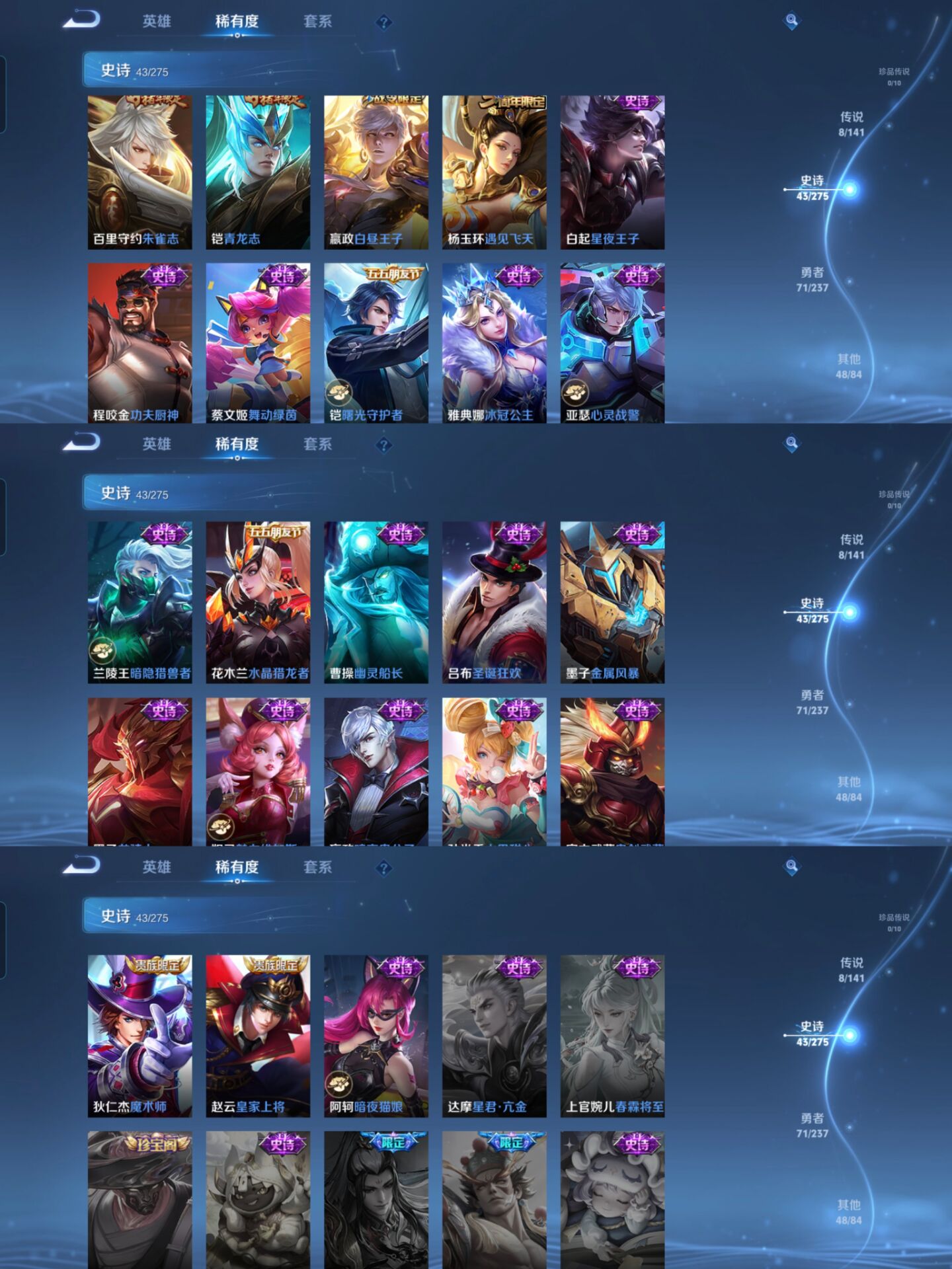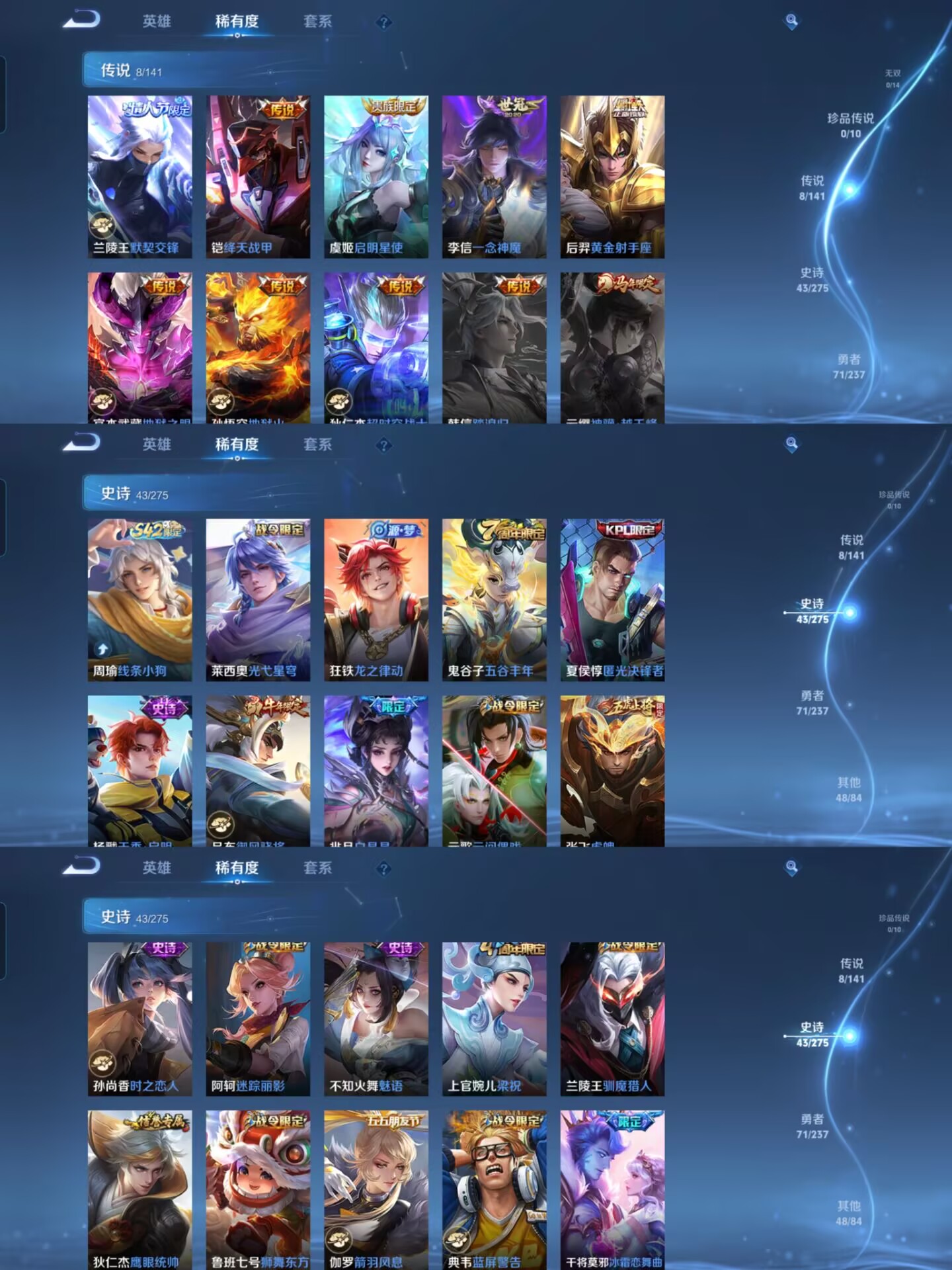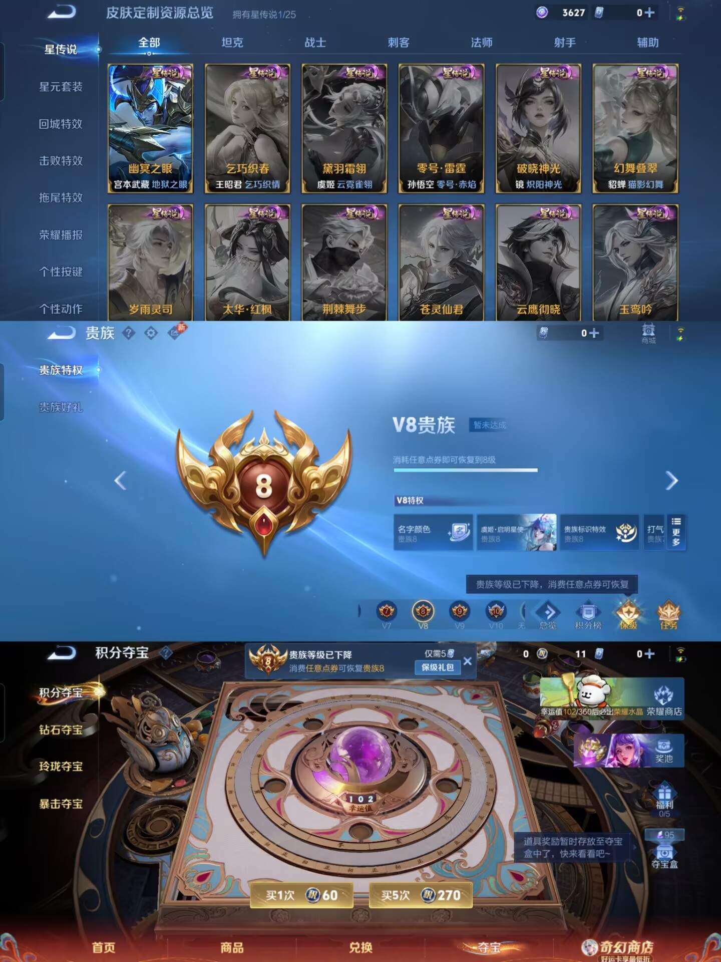 贵族等级:v8皮肤数:172传说品质8 情人节限定1 生肖限定3 荣耀典藏2 英雄数:126