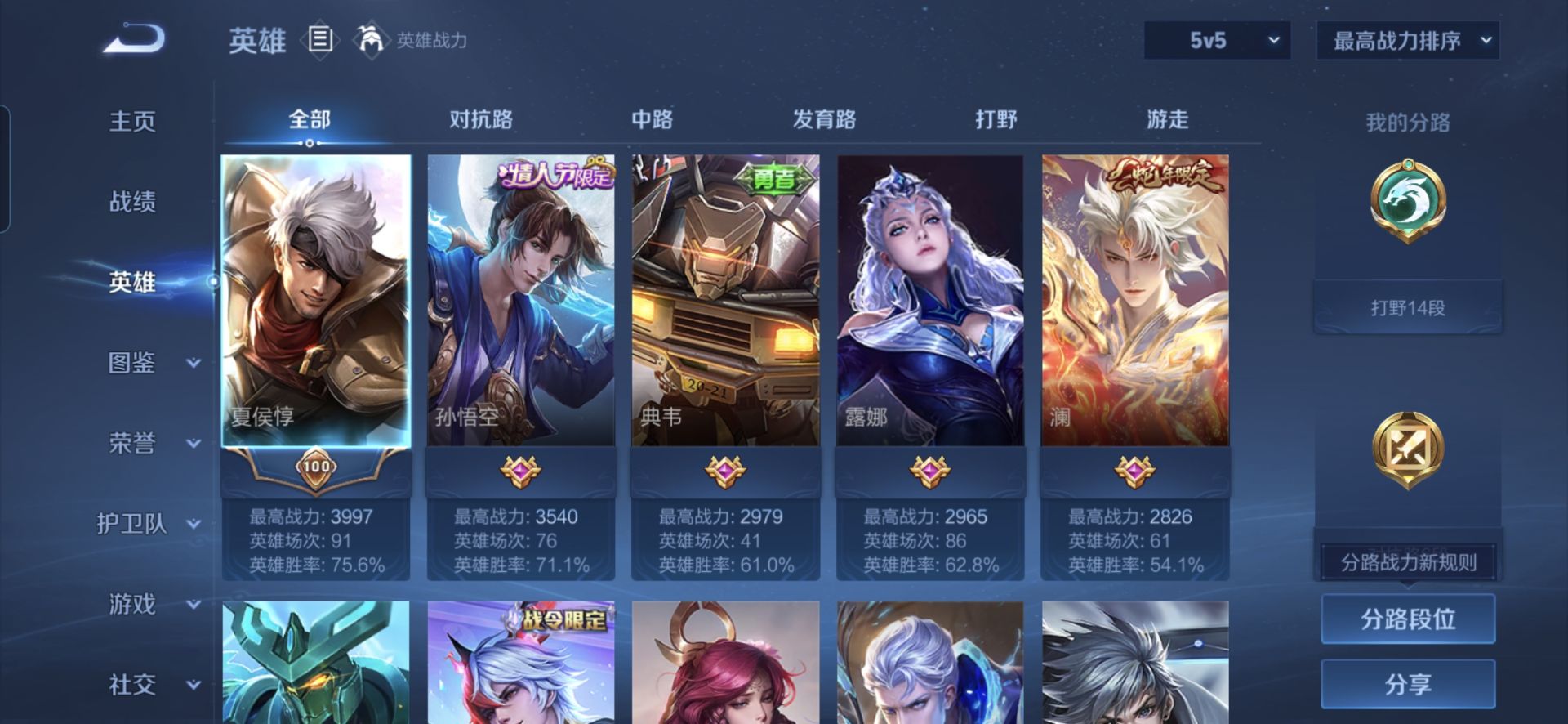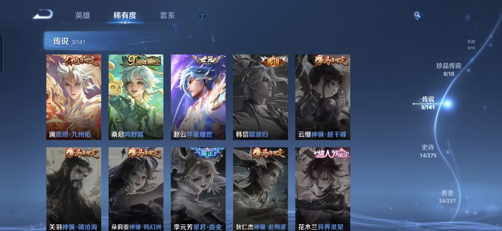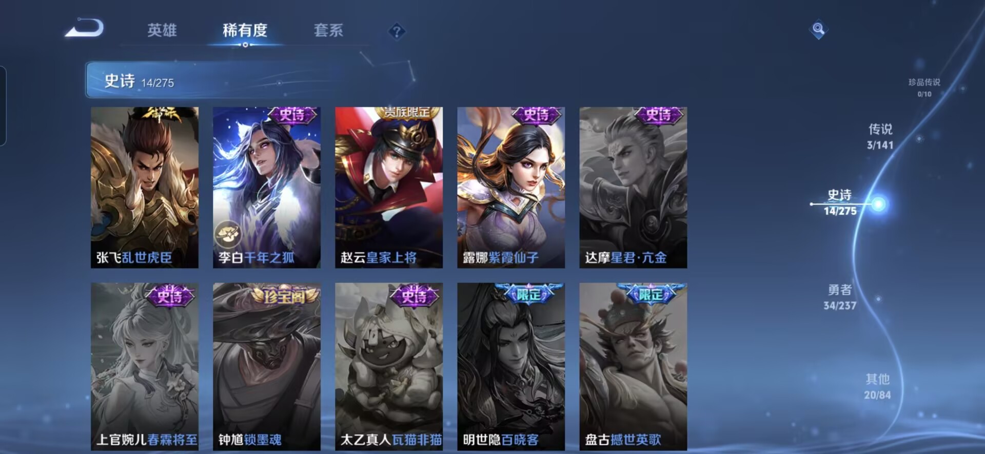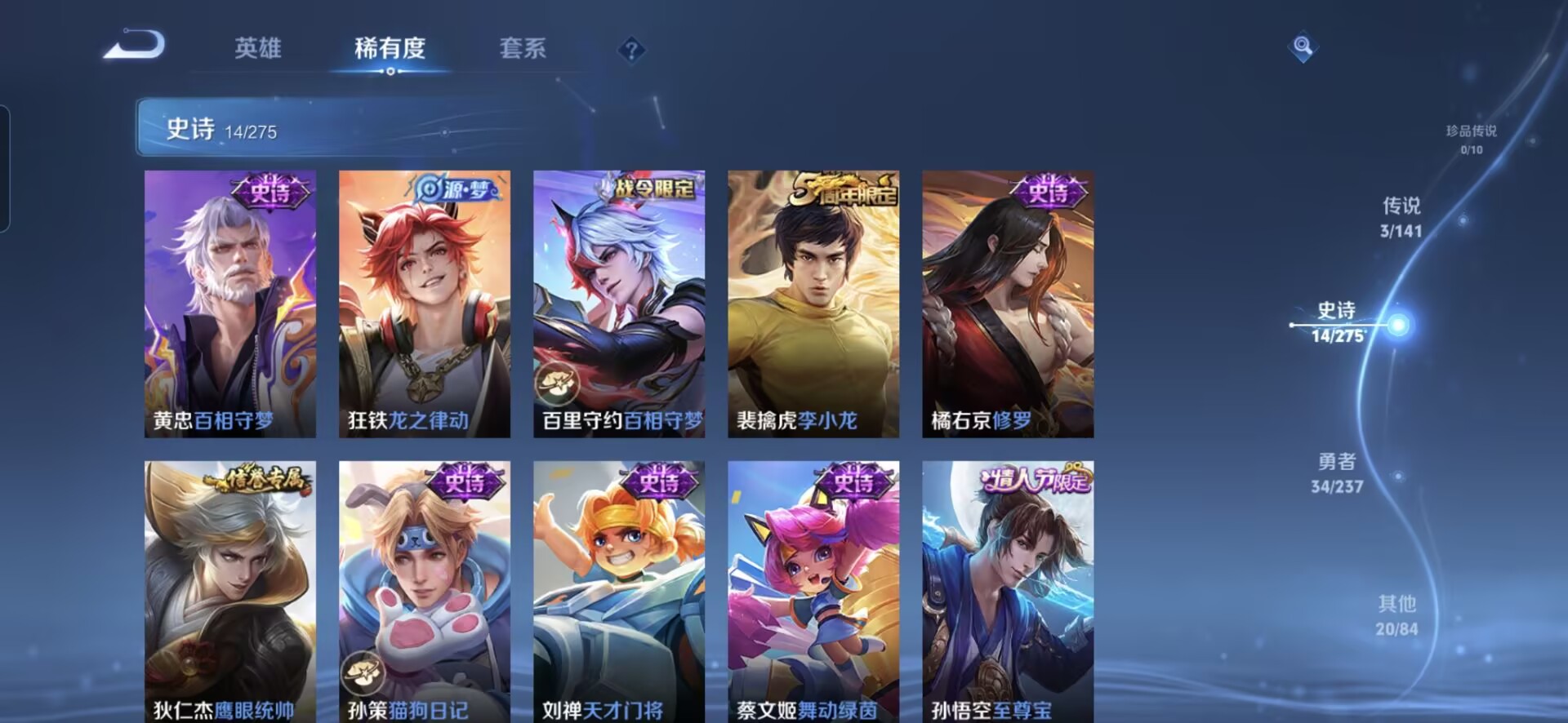 贵族等级:v5皮肤数:71传说品质3 生肖限定1 情人节限定1 英雄数:90
