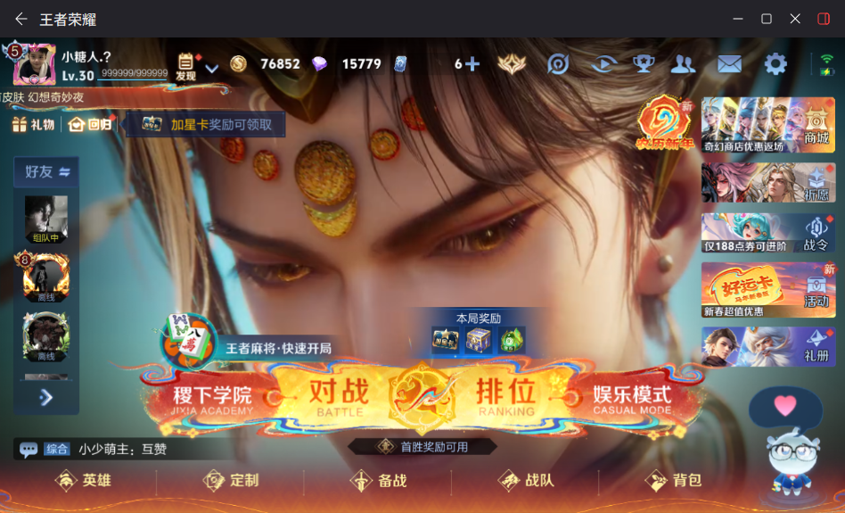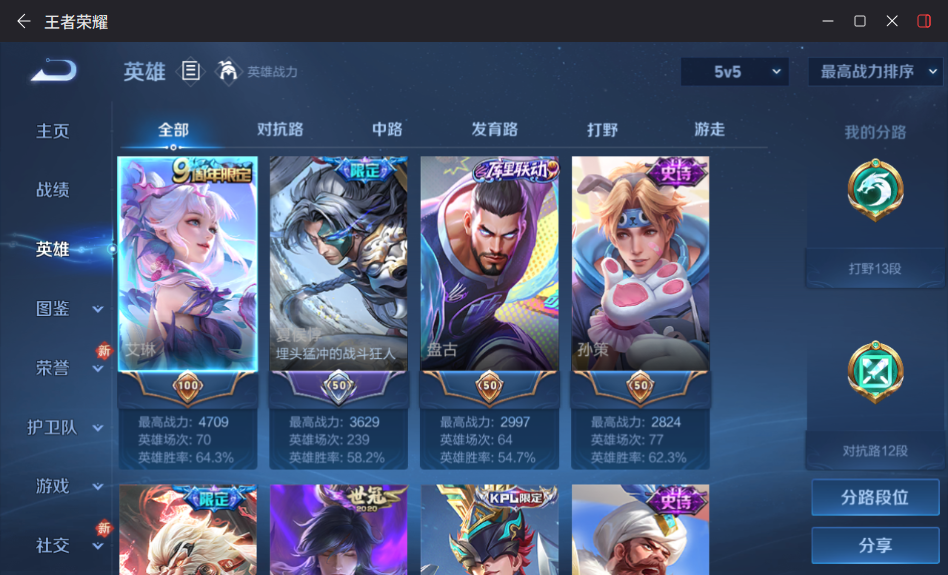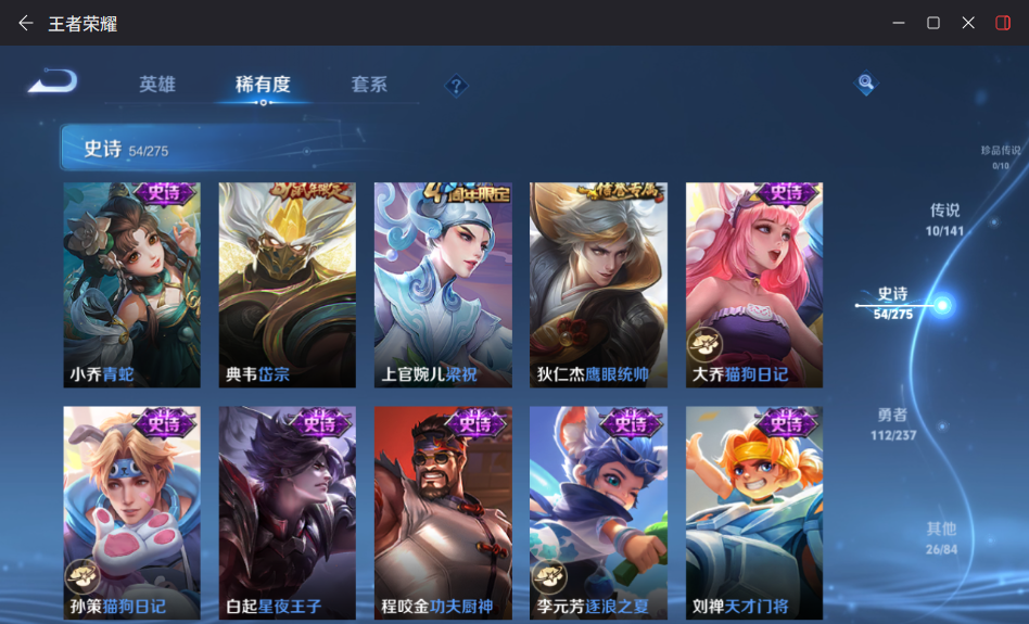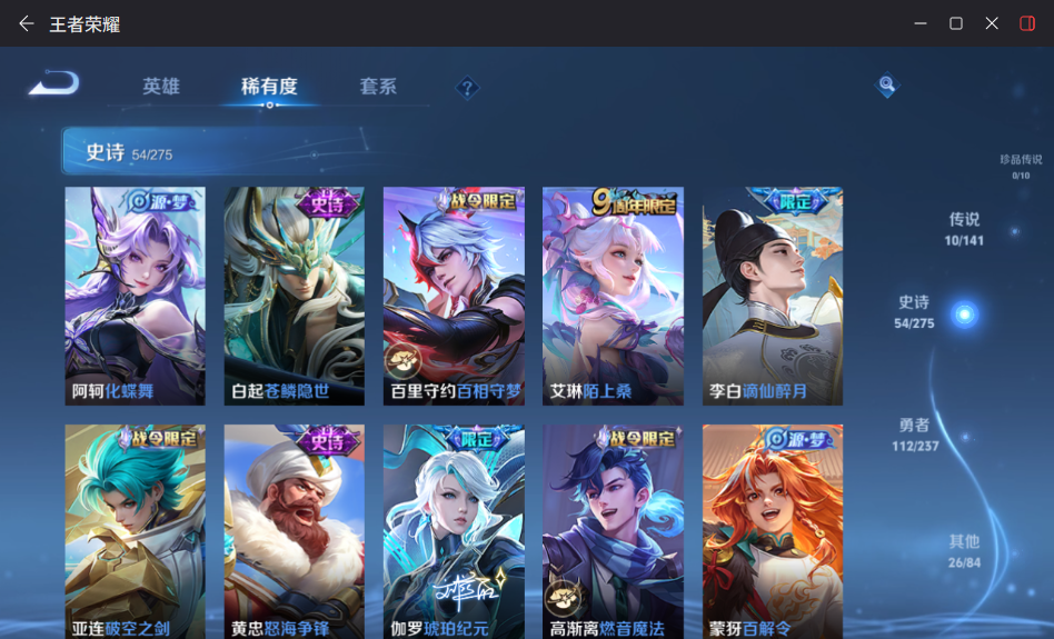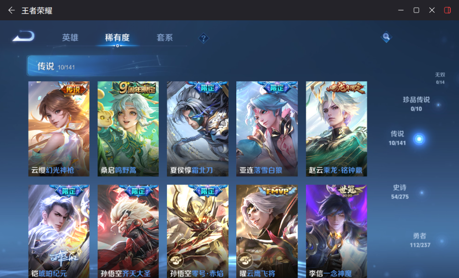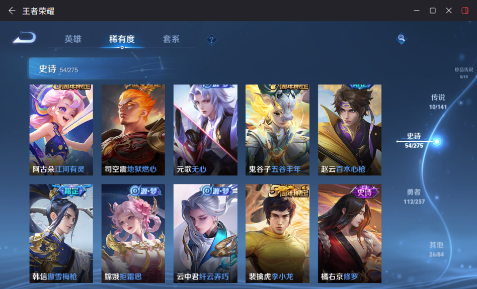 贵族等级:v7皮肤数:204生肖限定2 传说品质10 荣耀典藏2 英雄数:127