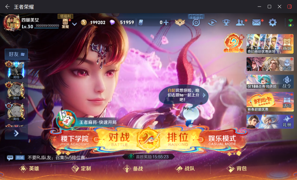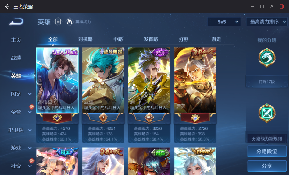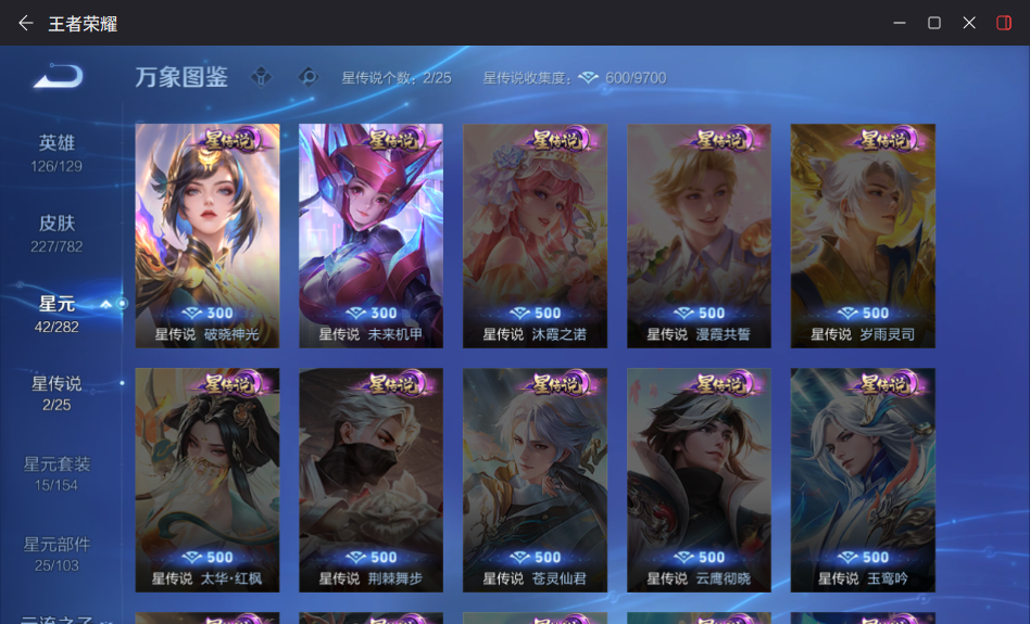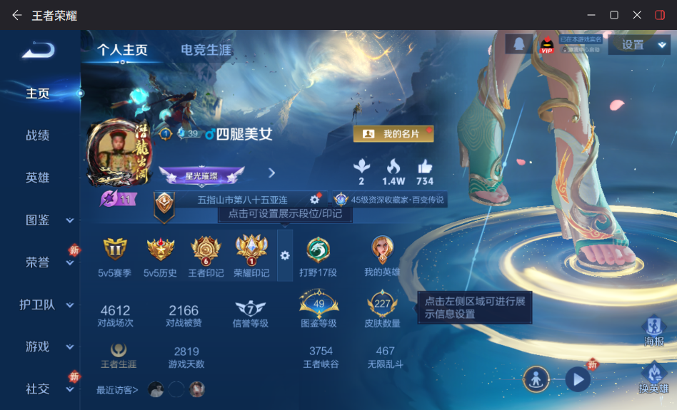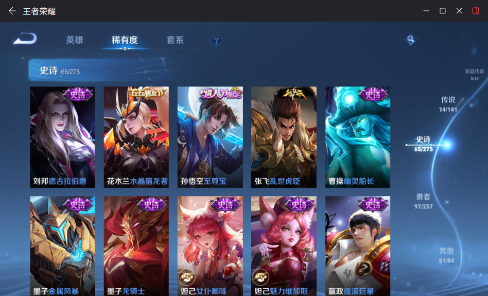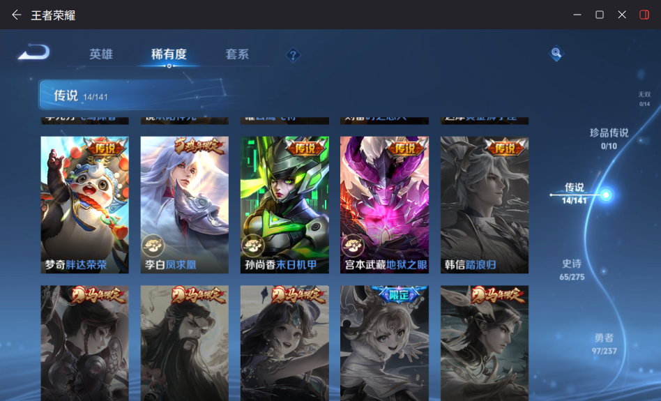 贵族等级:v7皮肤数:227生肖限定3 情人节限定1 传说品质14 英雄数:126