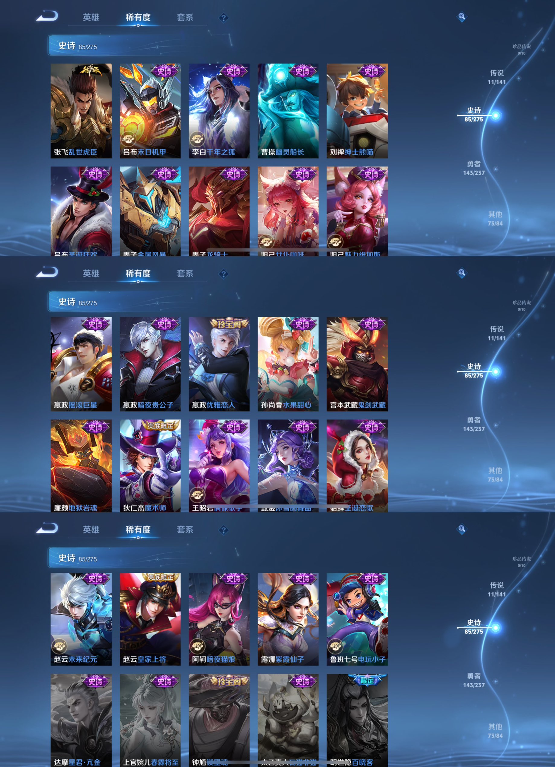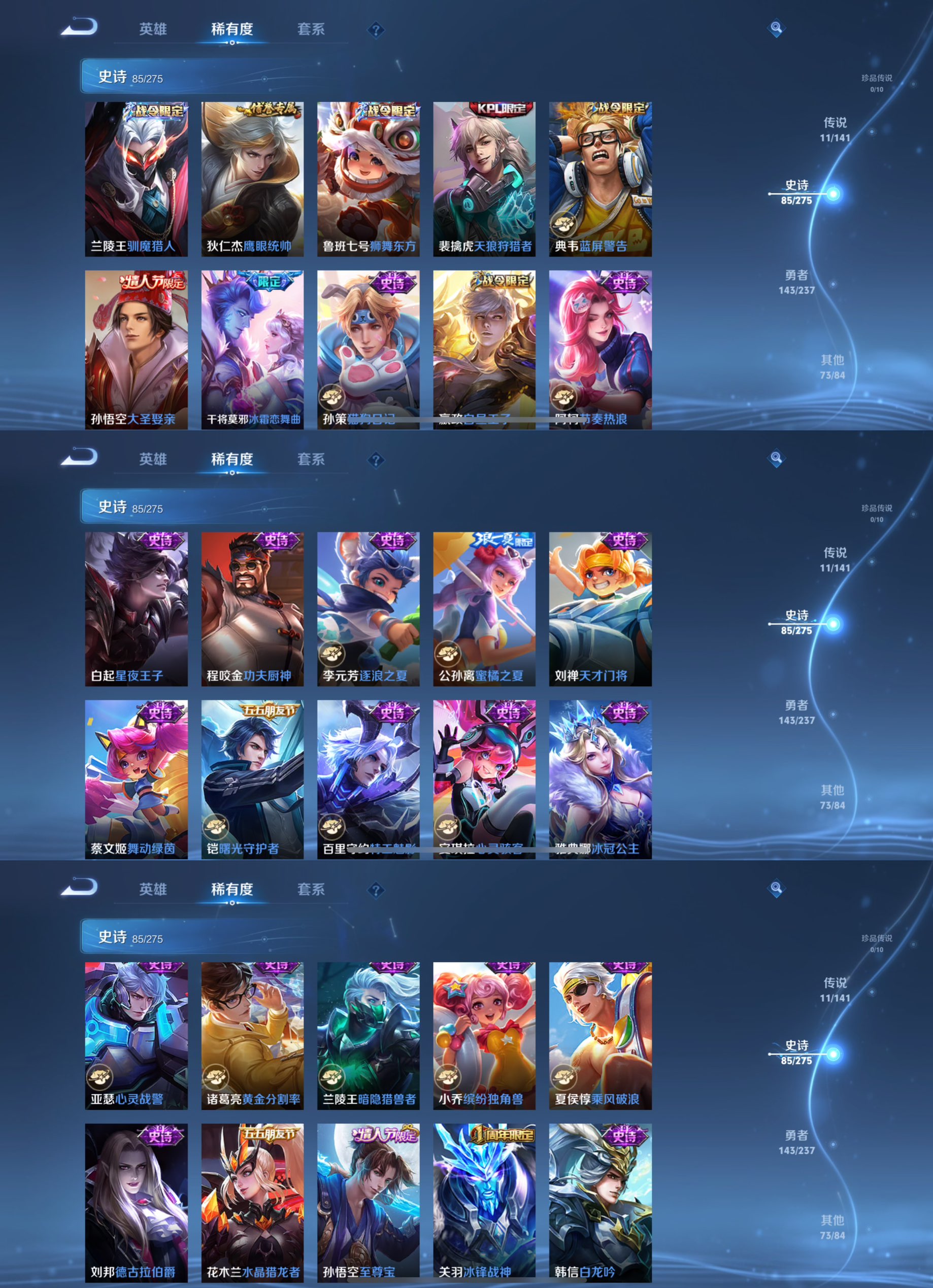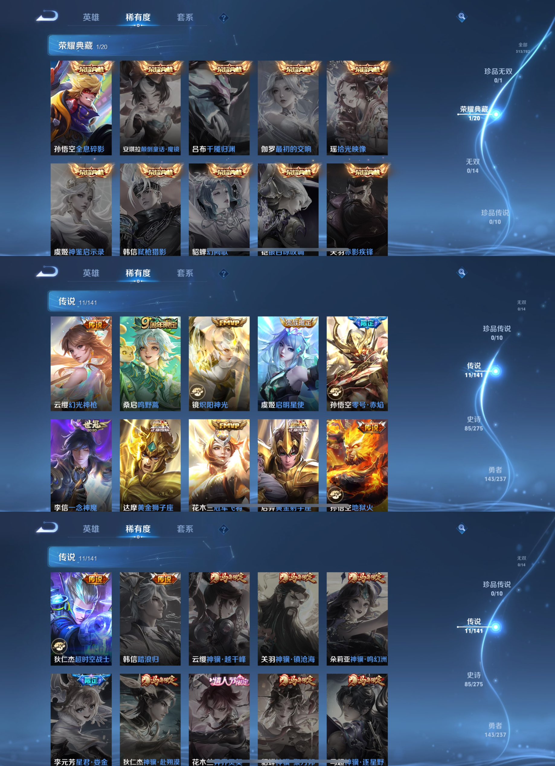 贵族等级:v8皮肤数:313传说品质11 情人节限定2 荣耀典藏1 英雄数:128