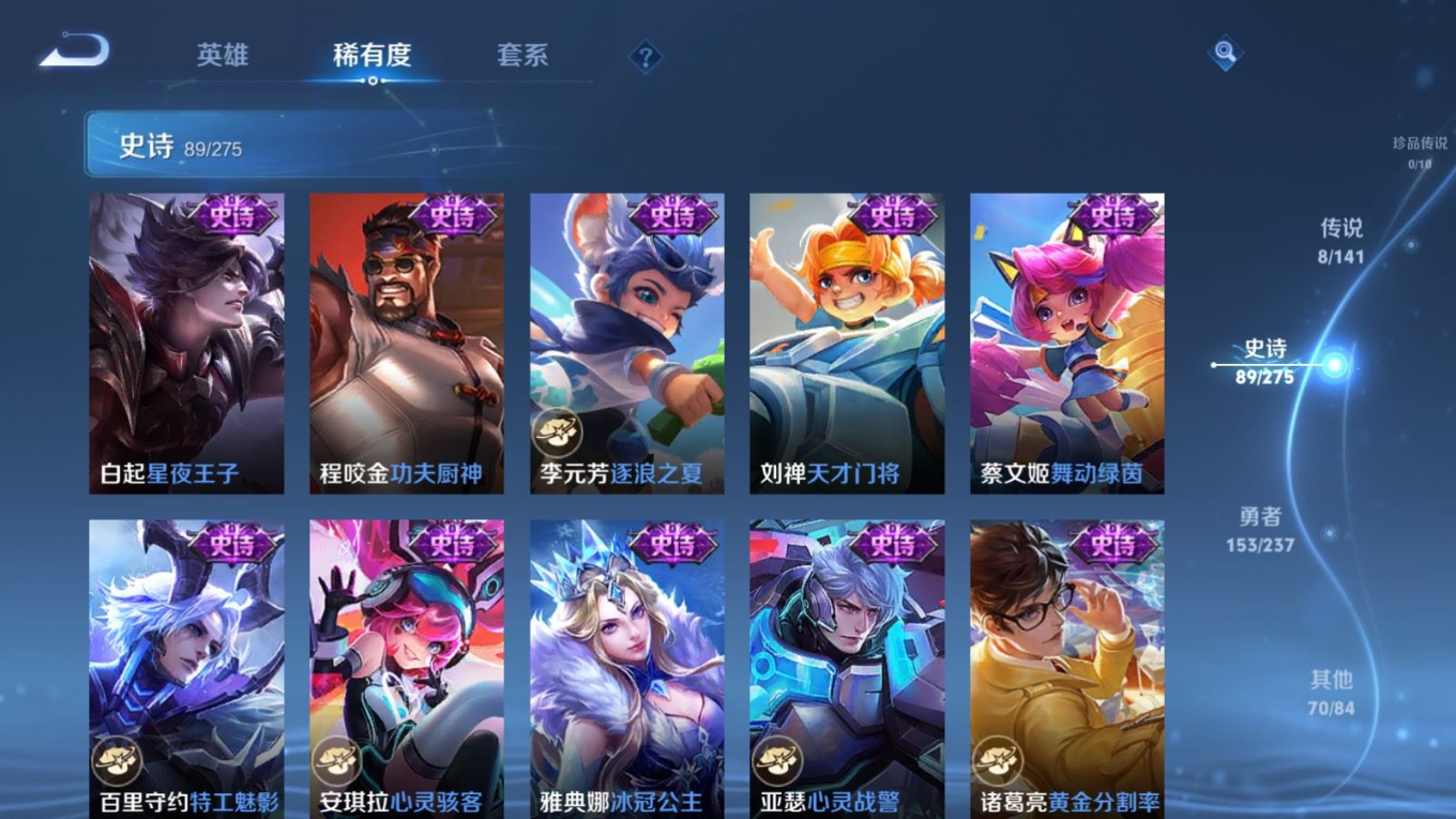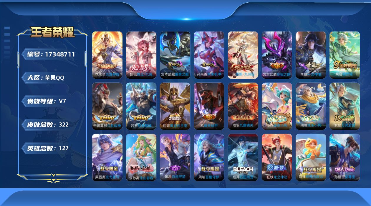 贵族等级:v7皮肤数:322传说品质8 生肖限定3 情人节限定1 荣耀典藏1 无双1 英雄数:127