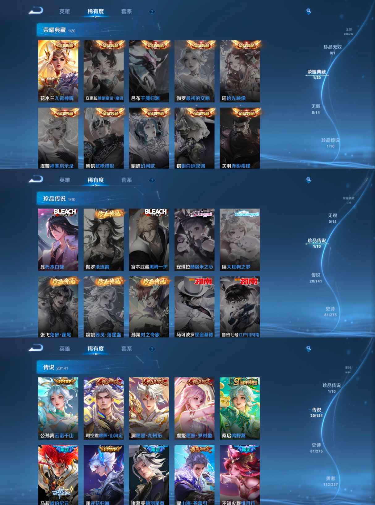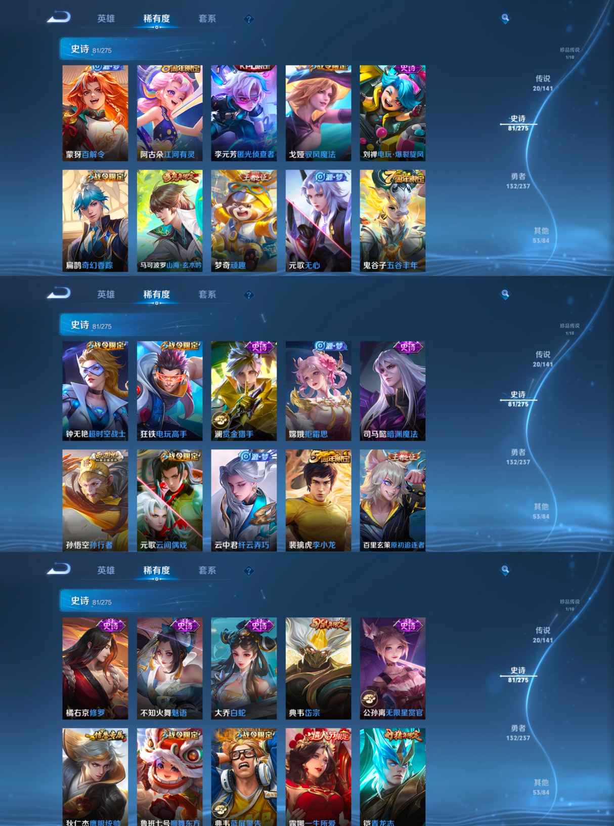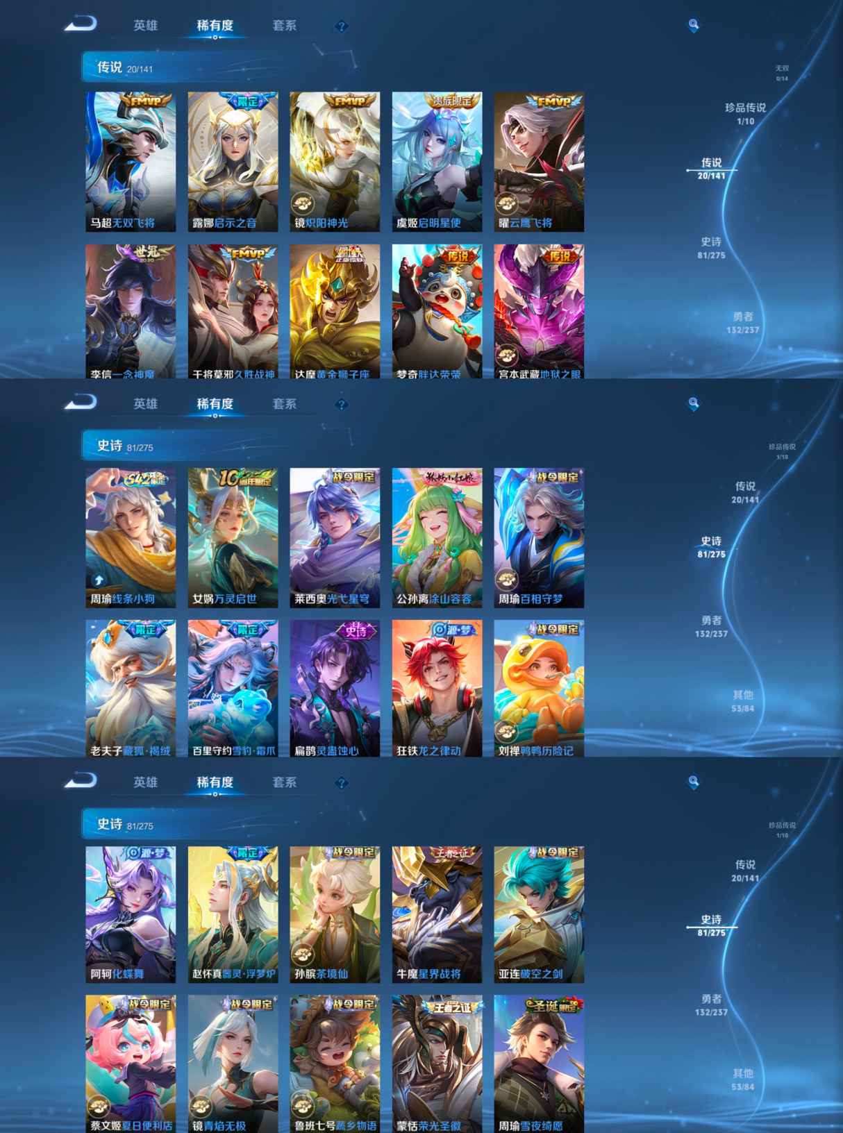 贵族等级:v8皮肤数:288传说品质20 生肖限定7 情人节限定2 珍品传说1 荣耀典藏1 英雄数:127