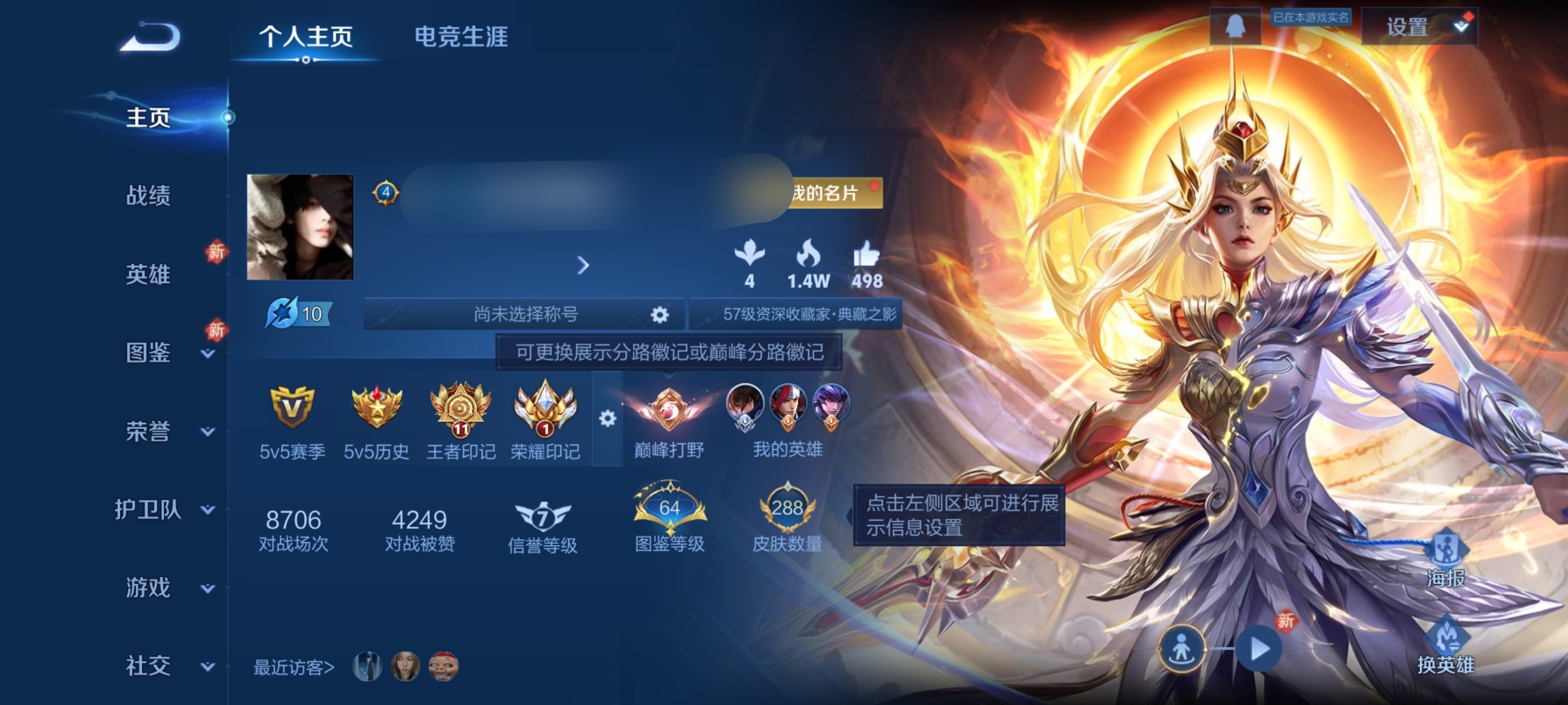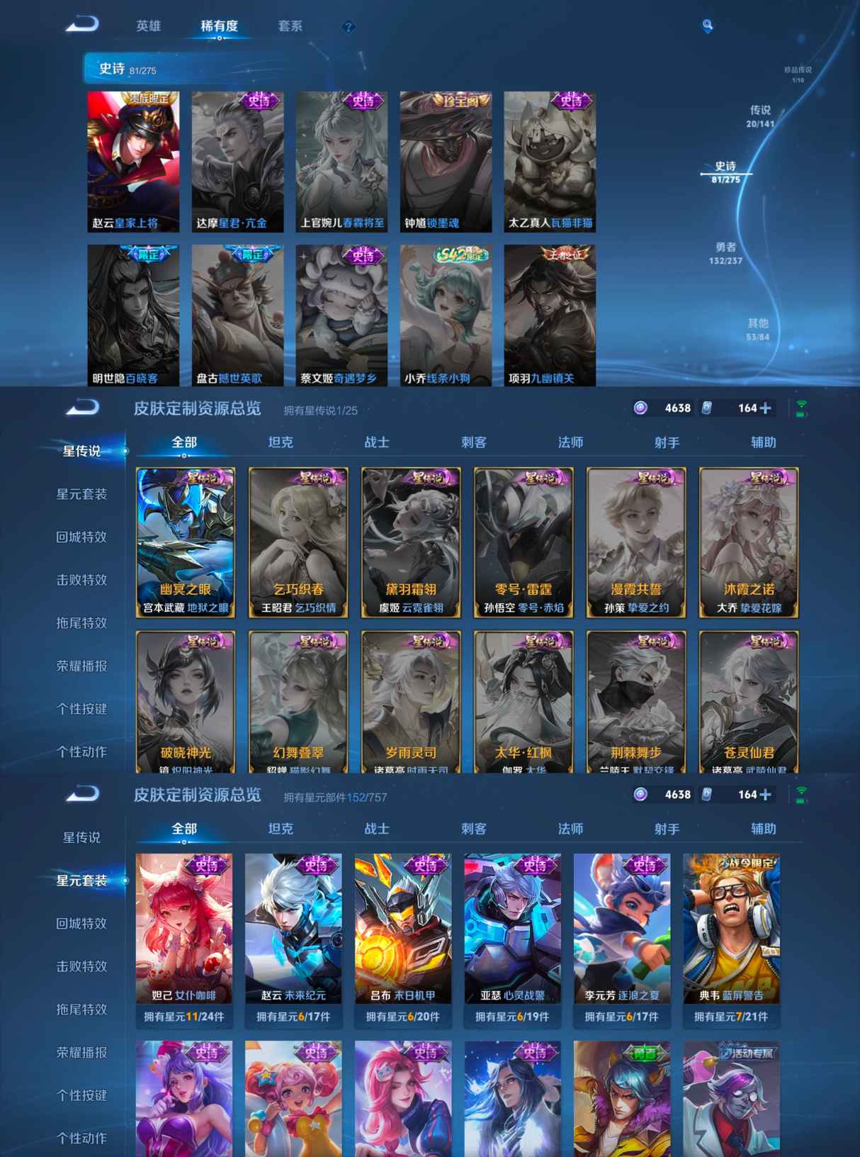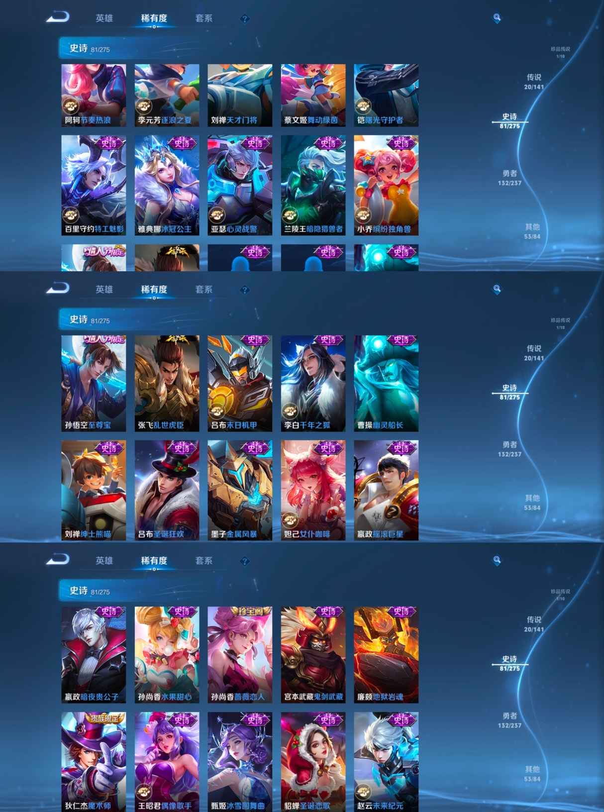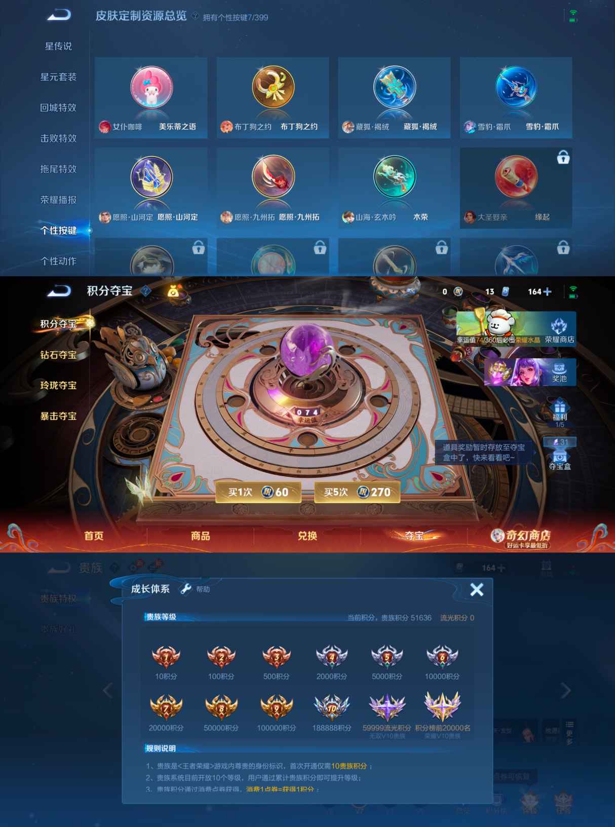 贵族等级:v8皮肤数:288传说品质20 生肖限定7 情人节限定2 珍品传说1 荣耀典藏1 英雄数:127