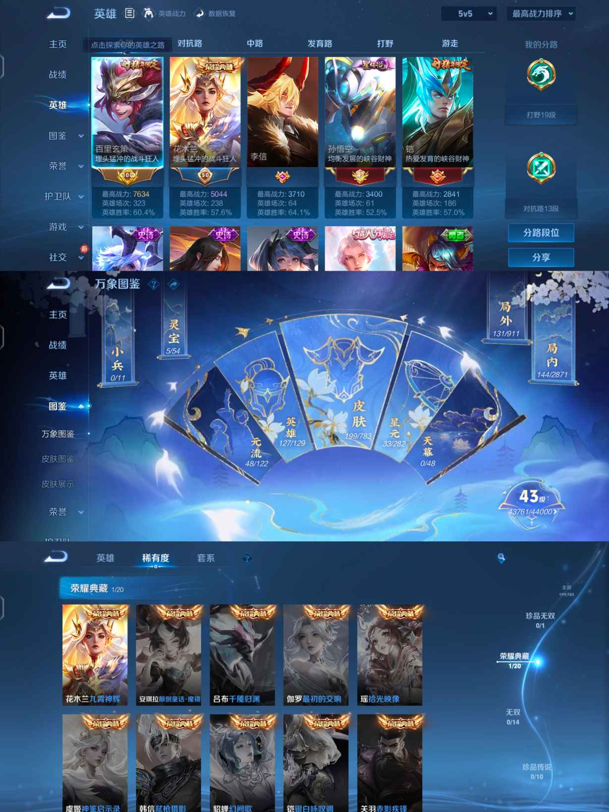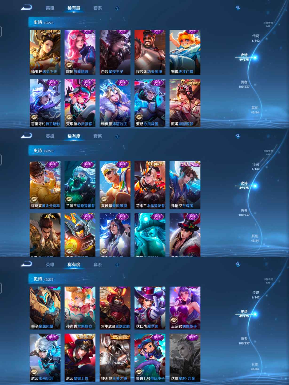 贵族等级:v7皮肤数:199传说品质6 情人节限定3 荣耀典藏1 生肖限定2 英雄数:127