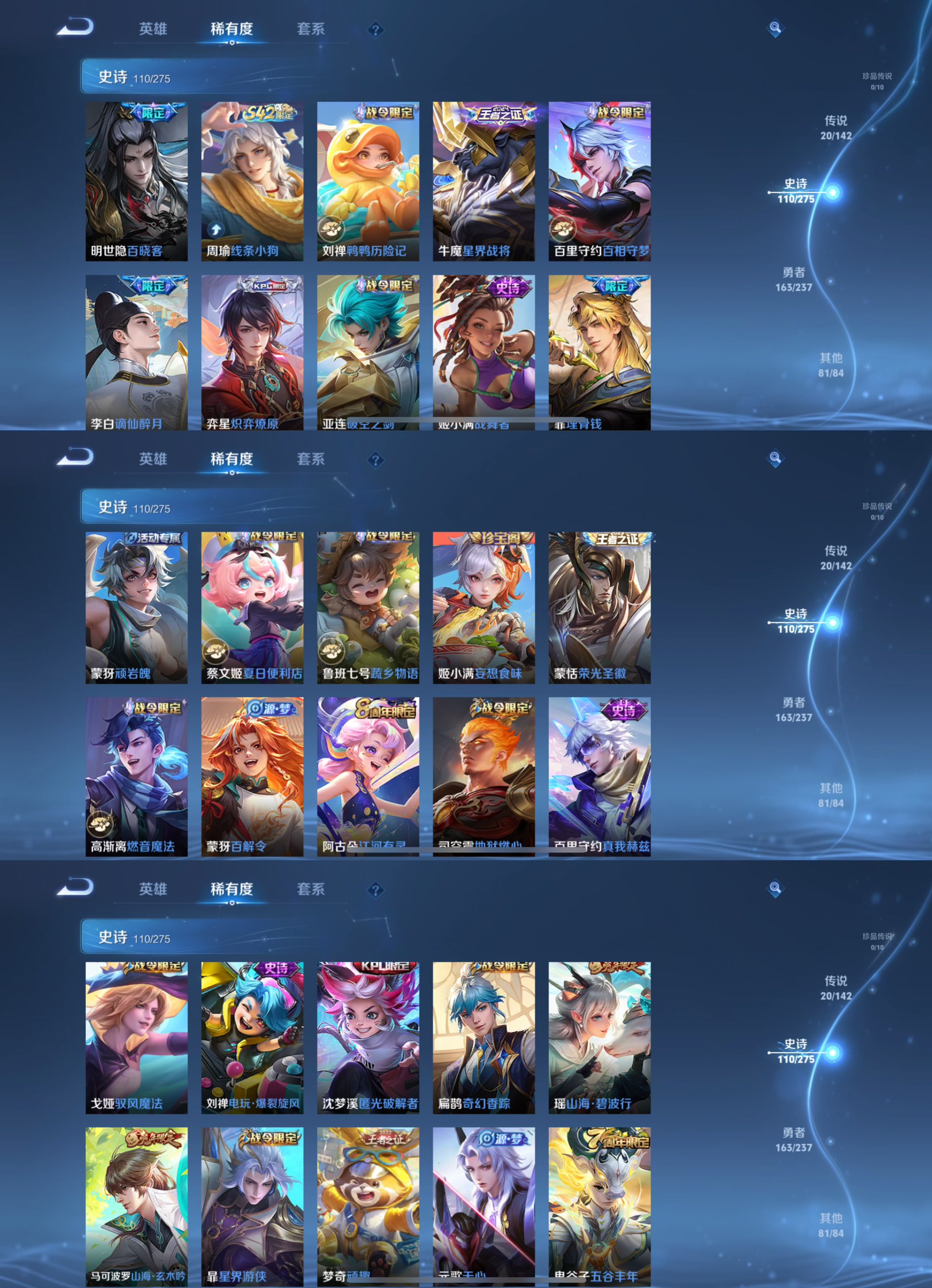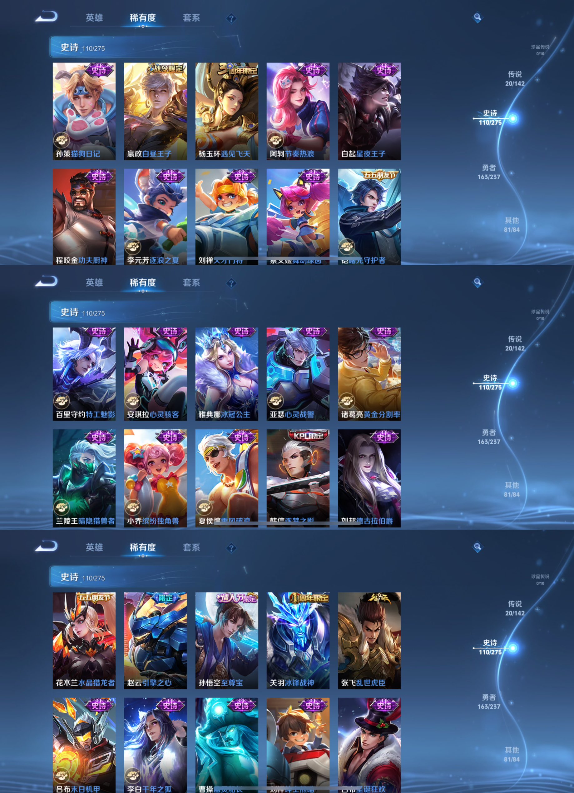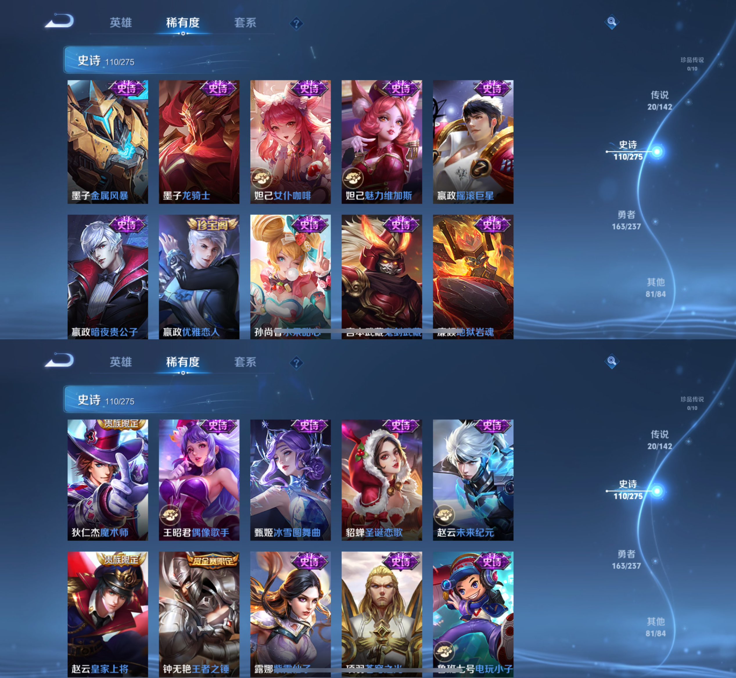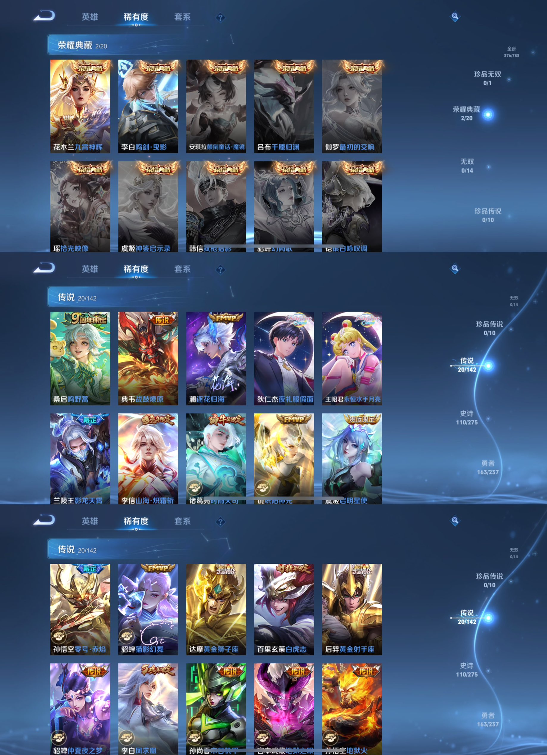 贵族等级:v8皮肤数:376传说品质20 生肖限定8 情人节限定2 荣耀典藏2 英雄数:128