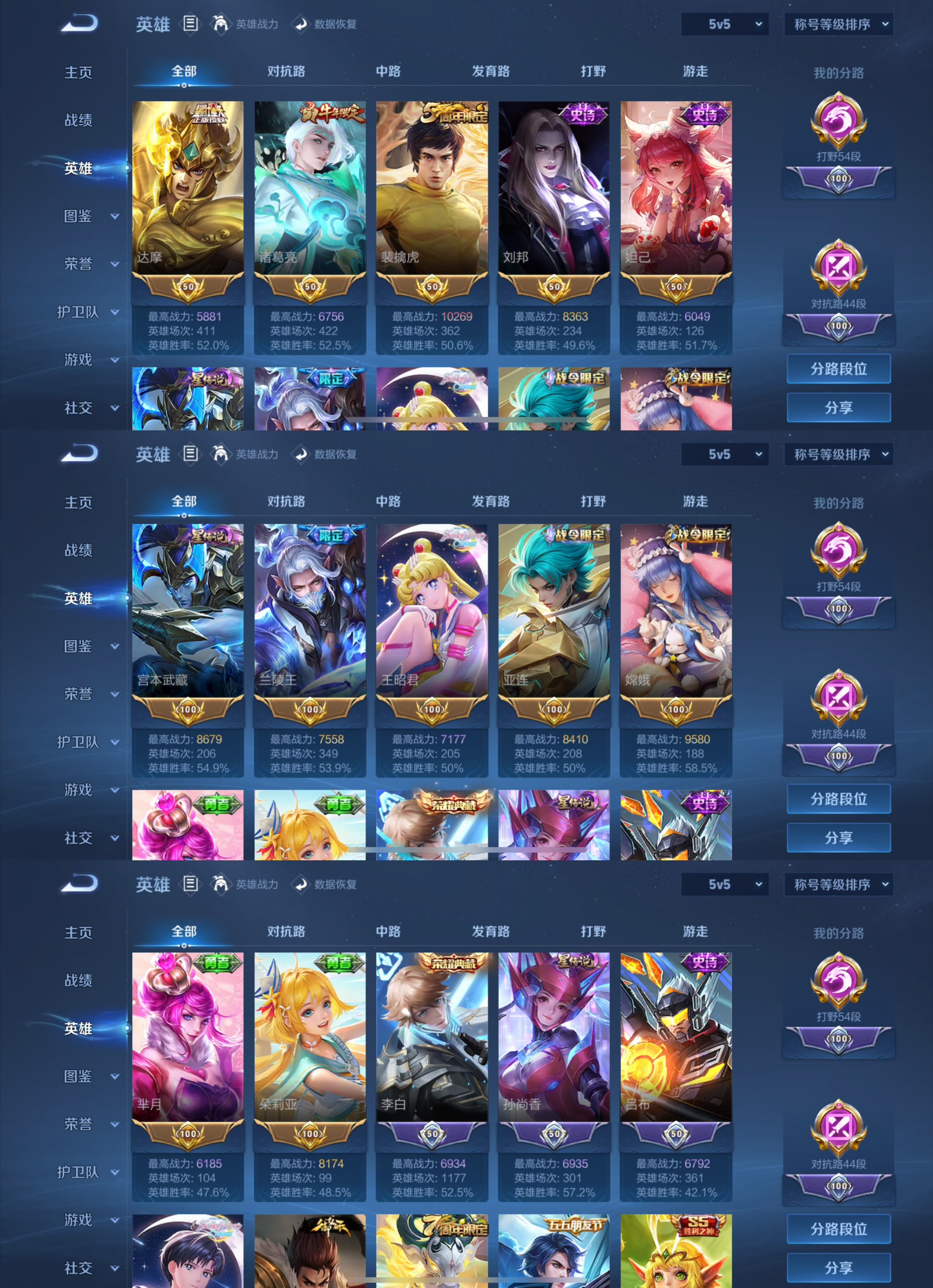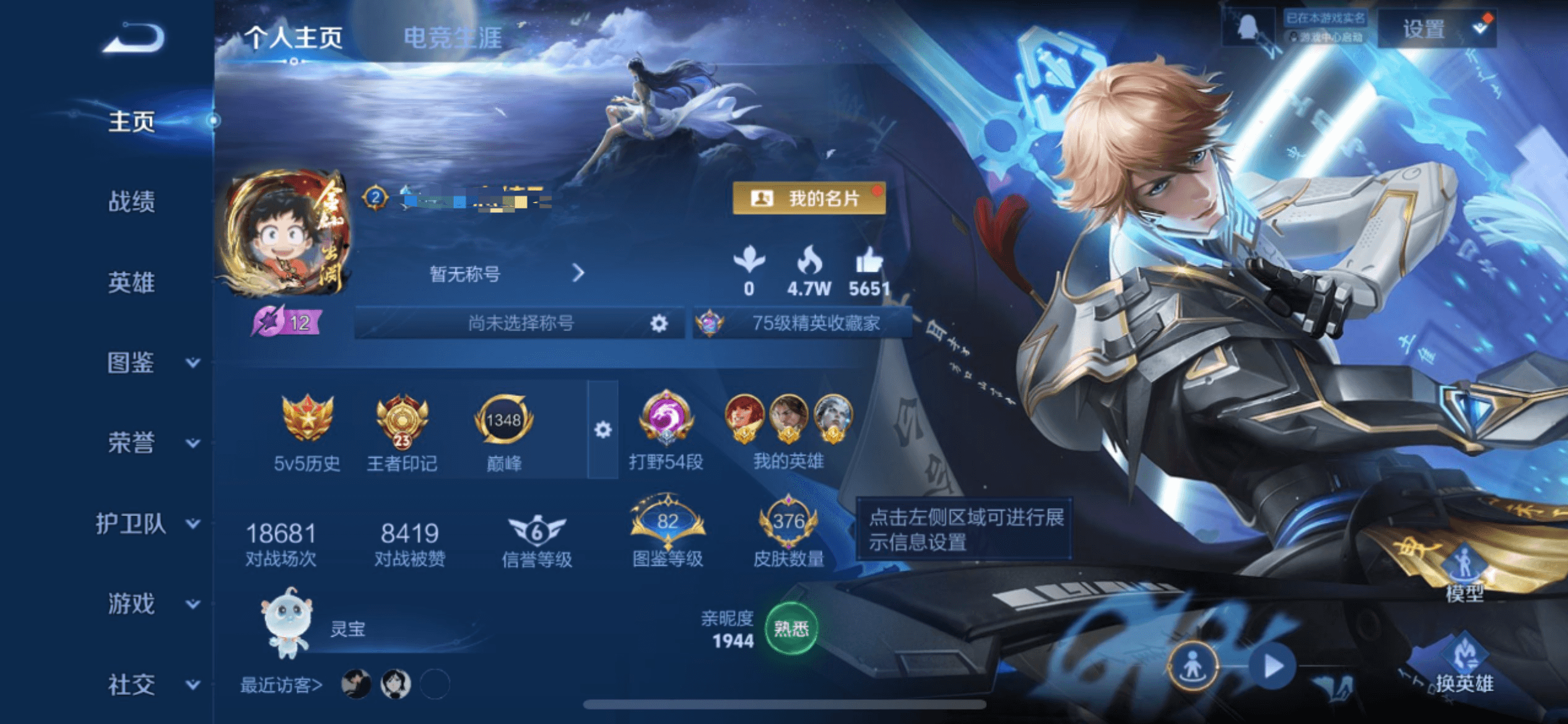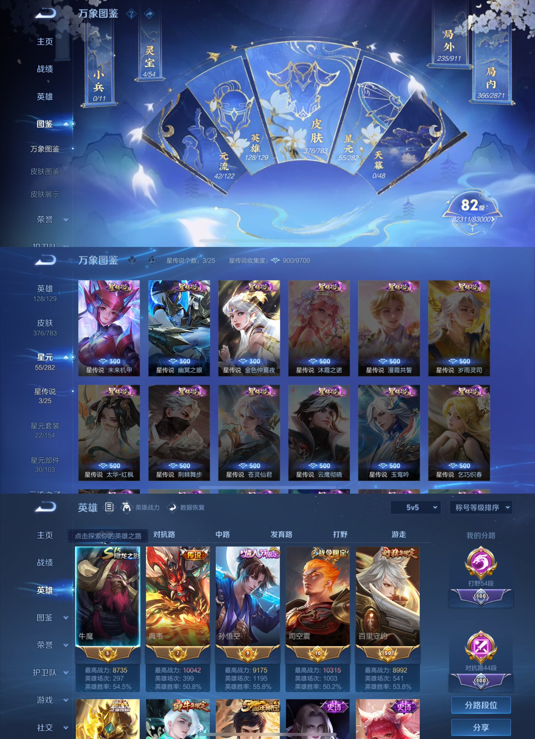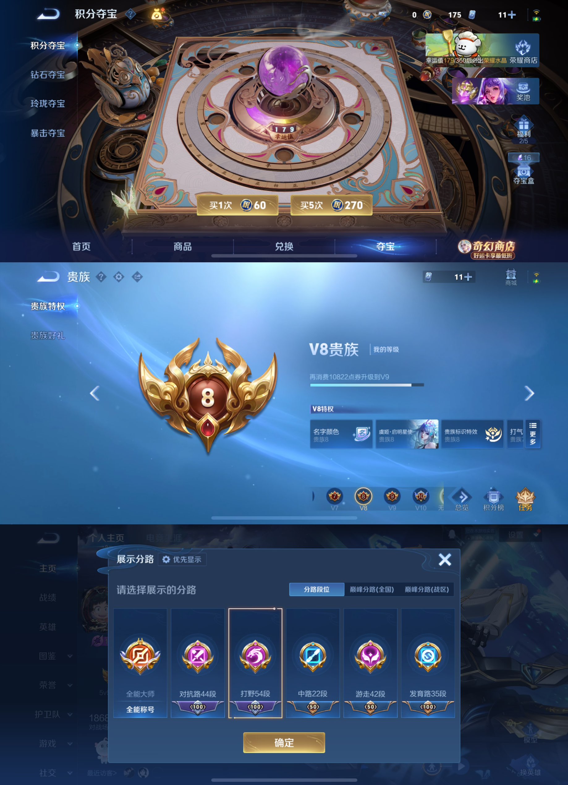 贵族等级:v8皮肤数:376传说品质20 生肖限定8 情人节限定2 荣耀典藏2 英雄数:128