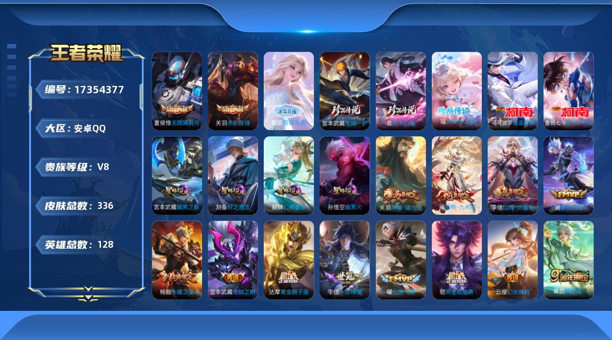 贵族等级:v8皮肤数:336传说品质21 生肖限定7 荣耀典藏2 珍品传说5 无双1 英雄数:128