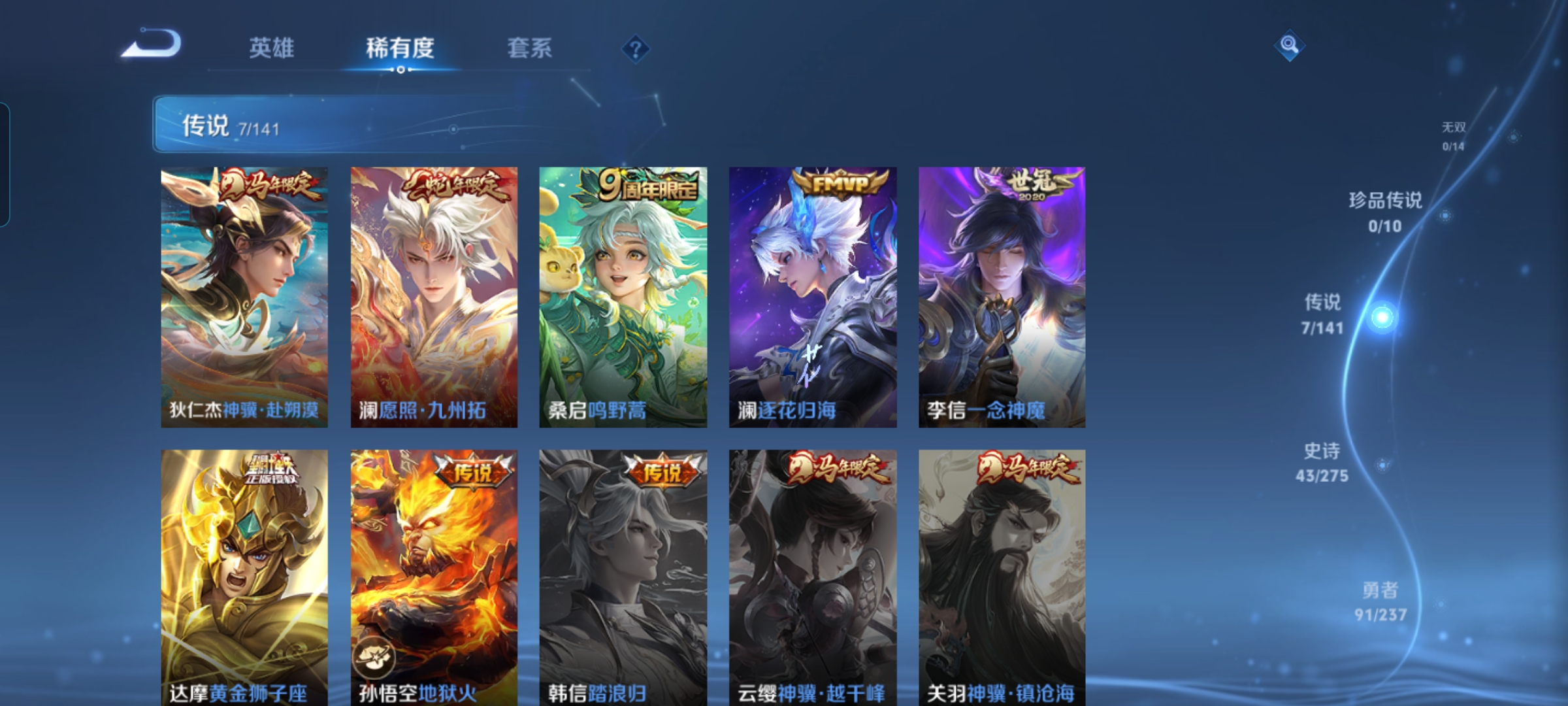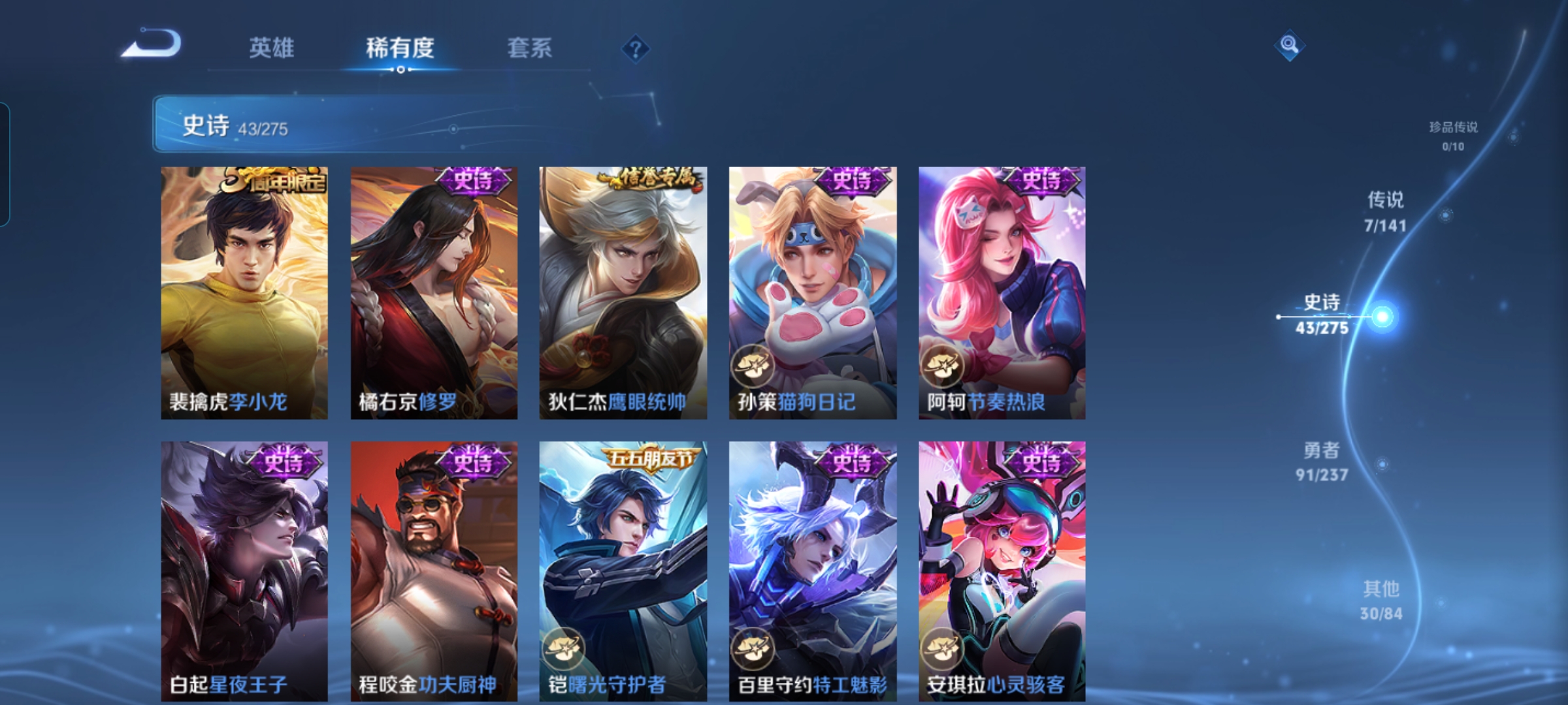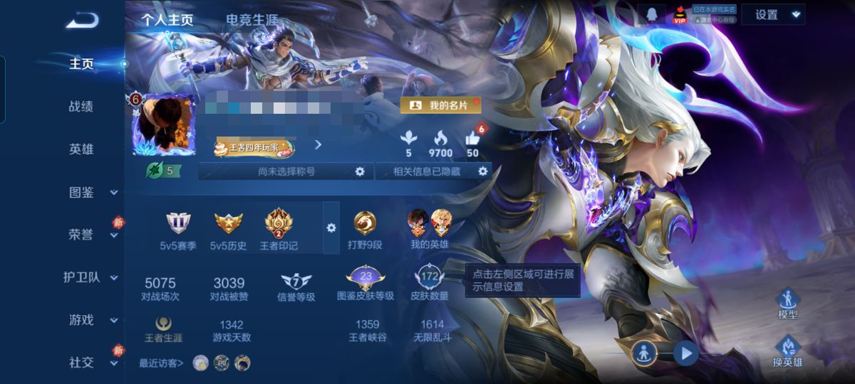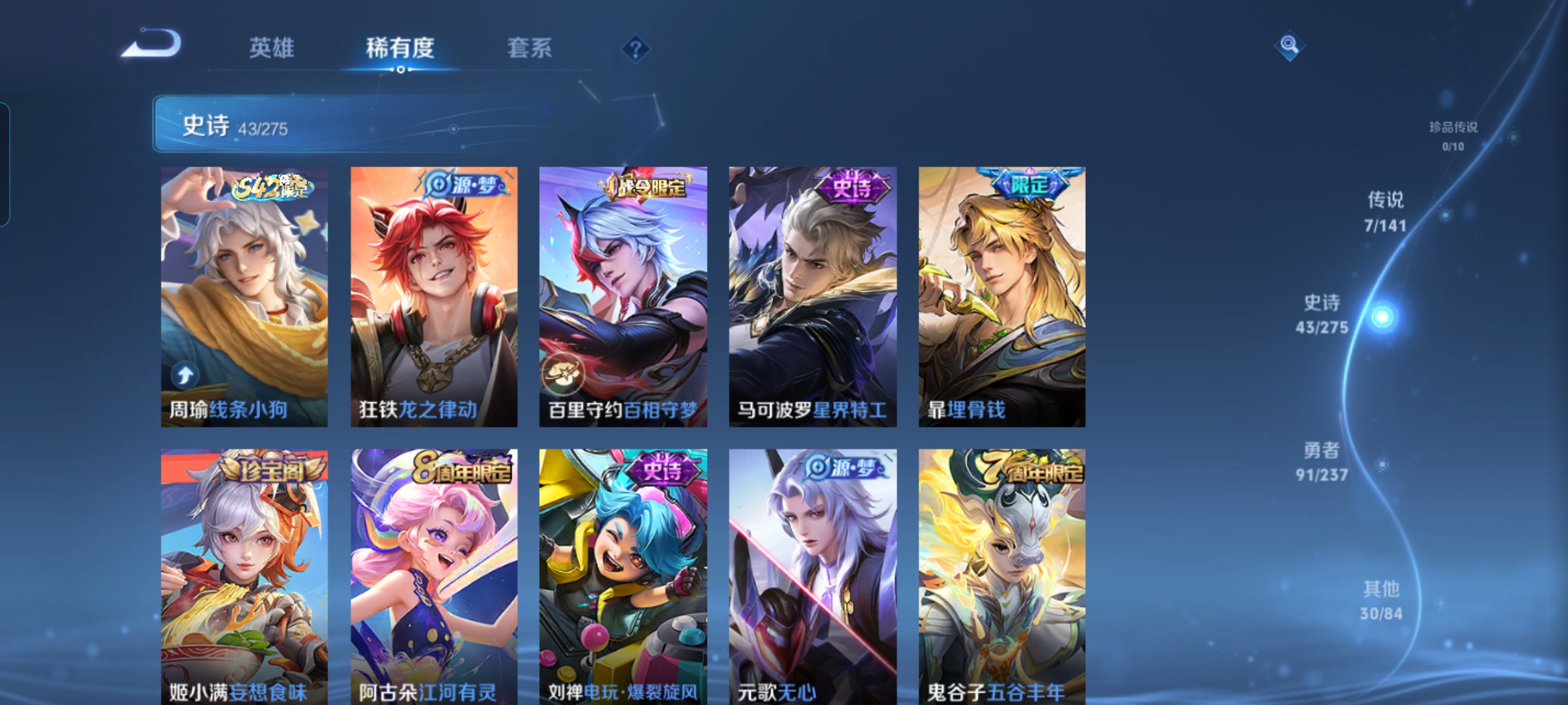 贵族等级:v6皮肤数:172传说品质7 生肖限定2 荣耀典藏1 英雄数:125