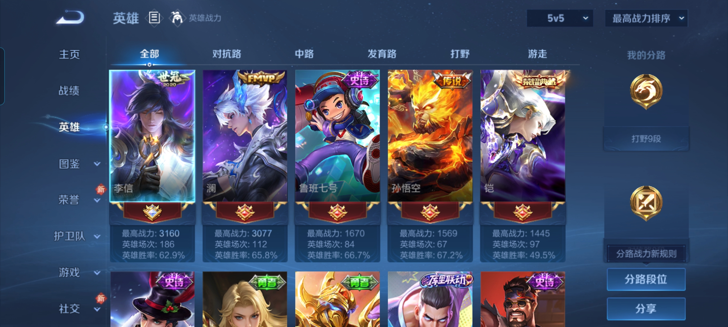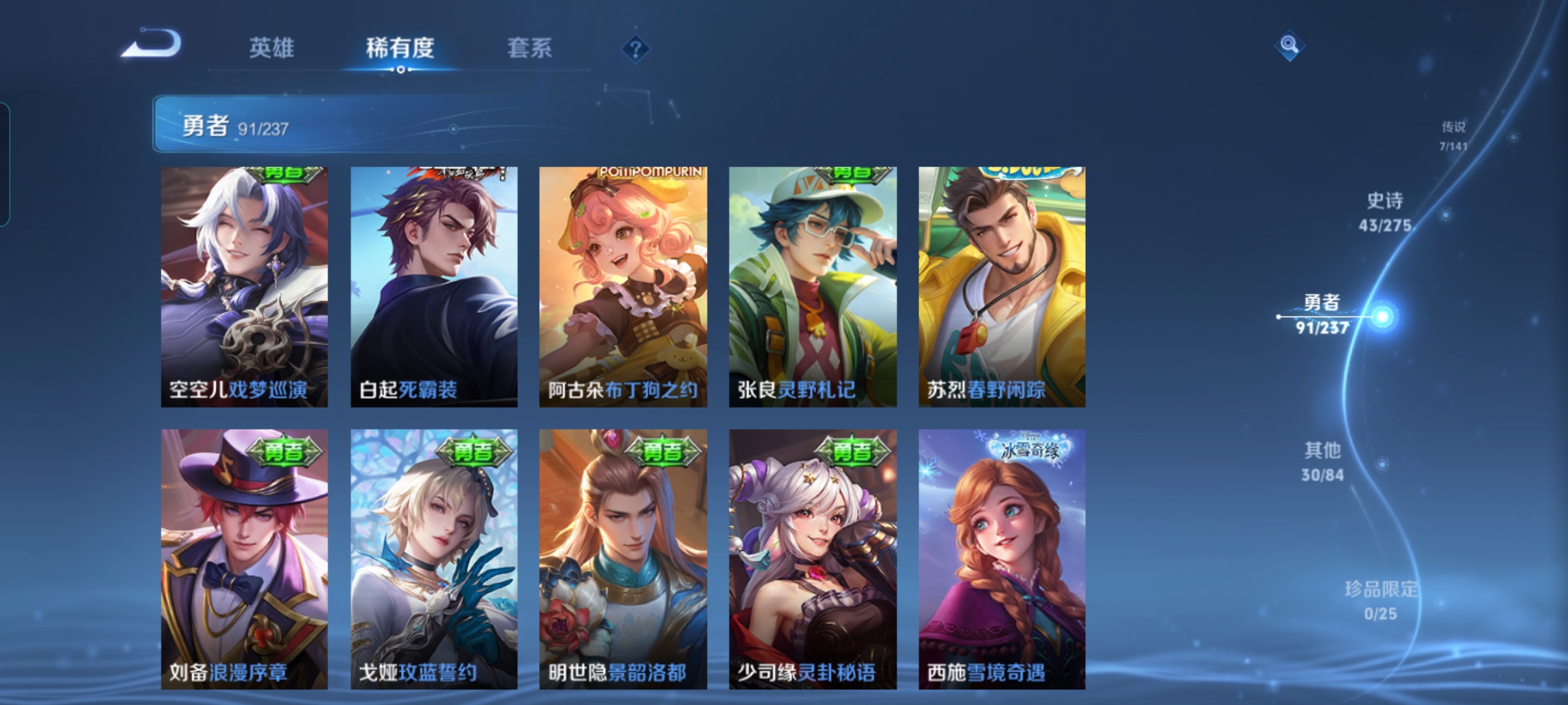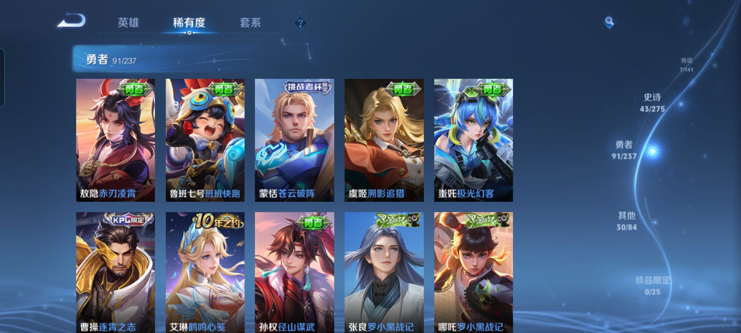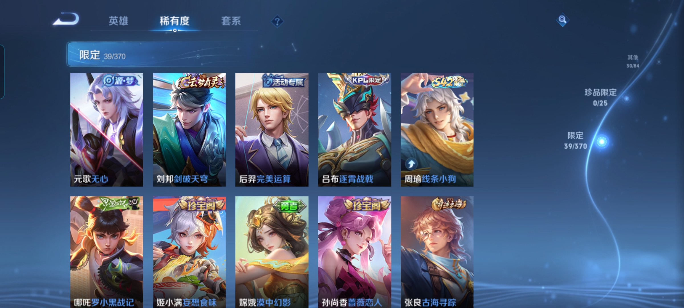 贵族等级:v6皮肤数:172传说品质7 生肖限定2 荣耀典藏1 英雄数:125