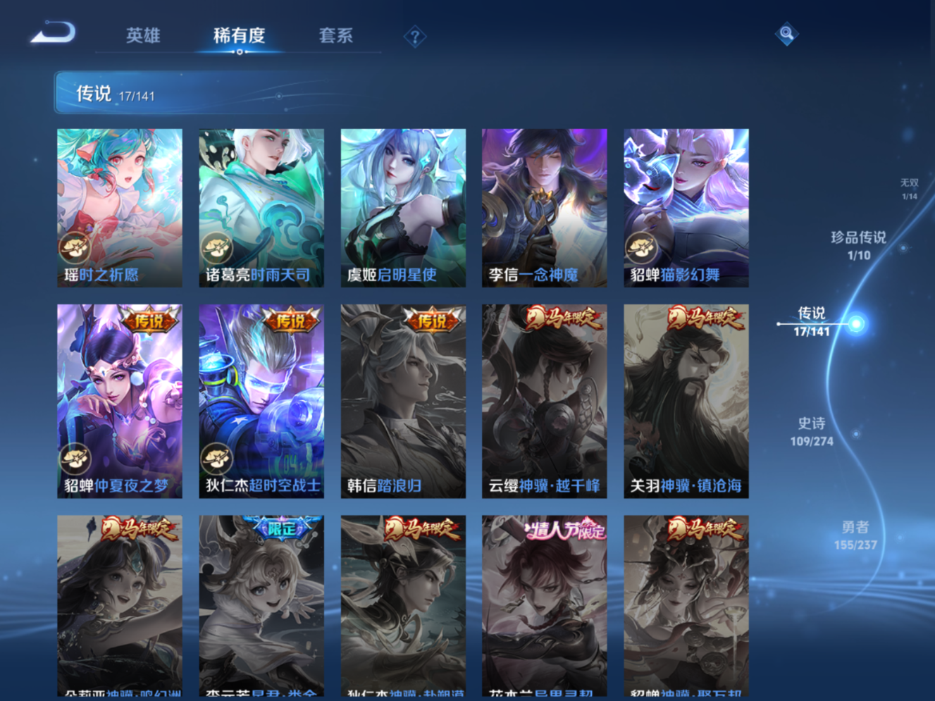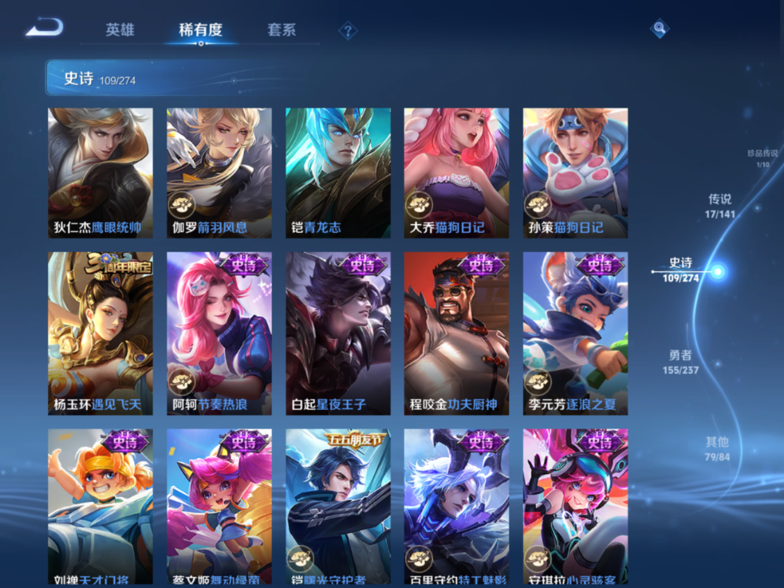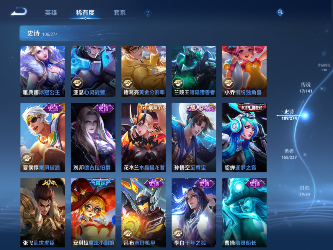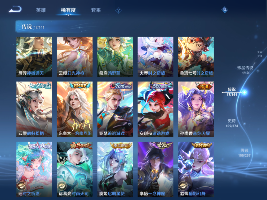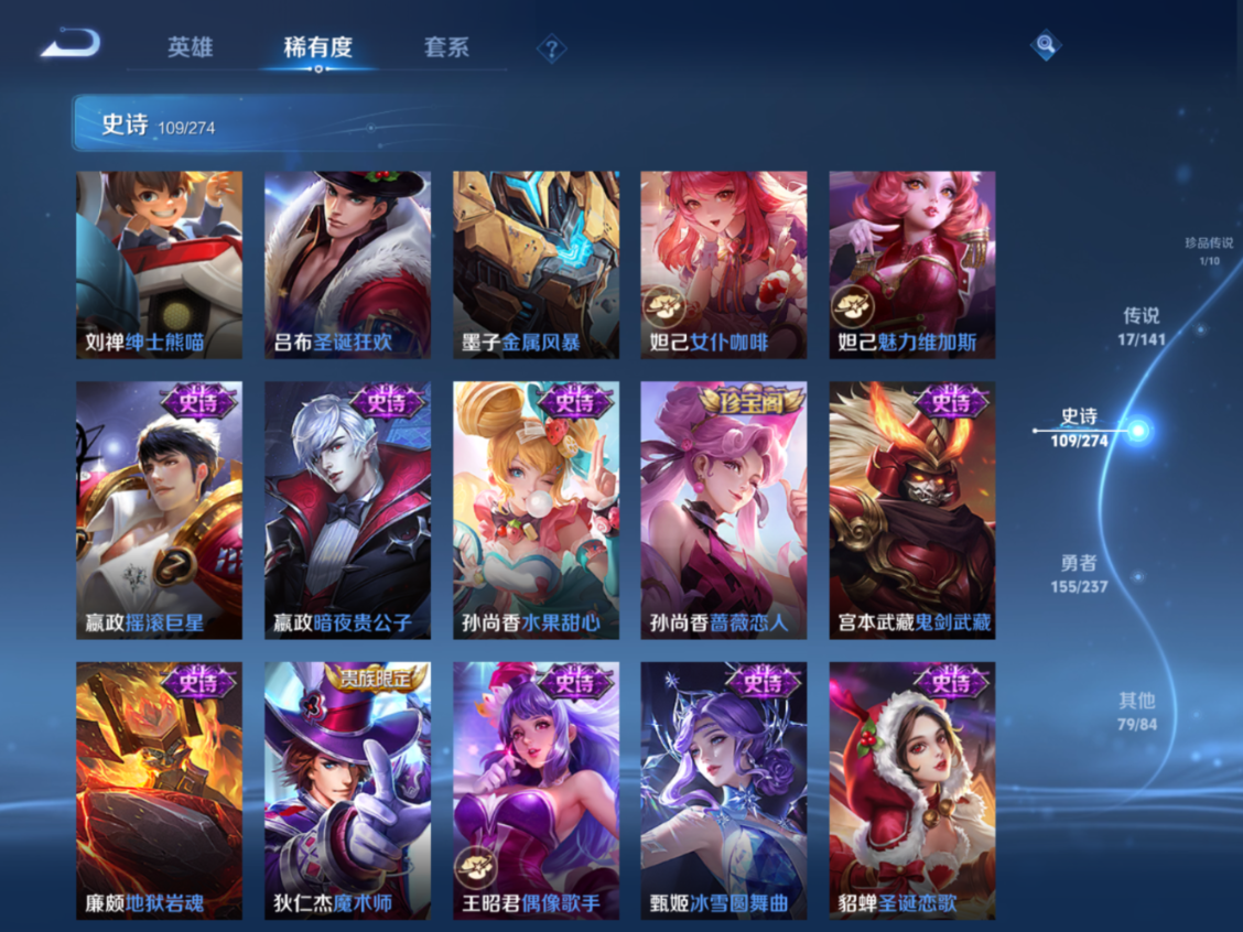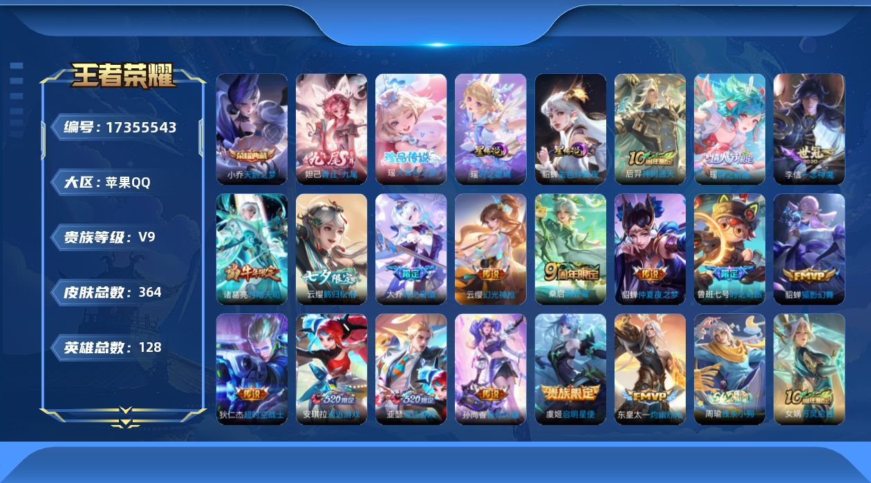 贵族等级:v9皮肤数:364传说品质17 生肖限定4 情人节限定4 荣耀典藏1 无双1 珍品传说1 英雄数:128