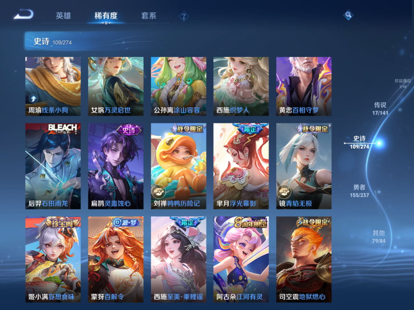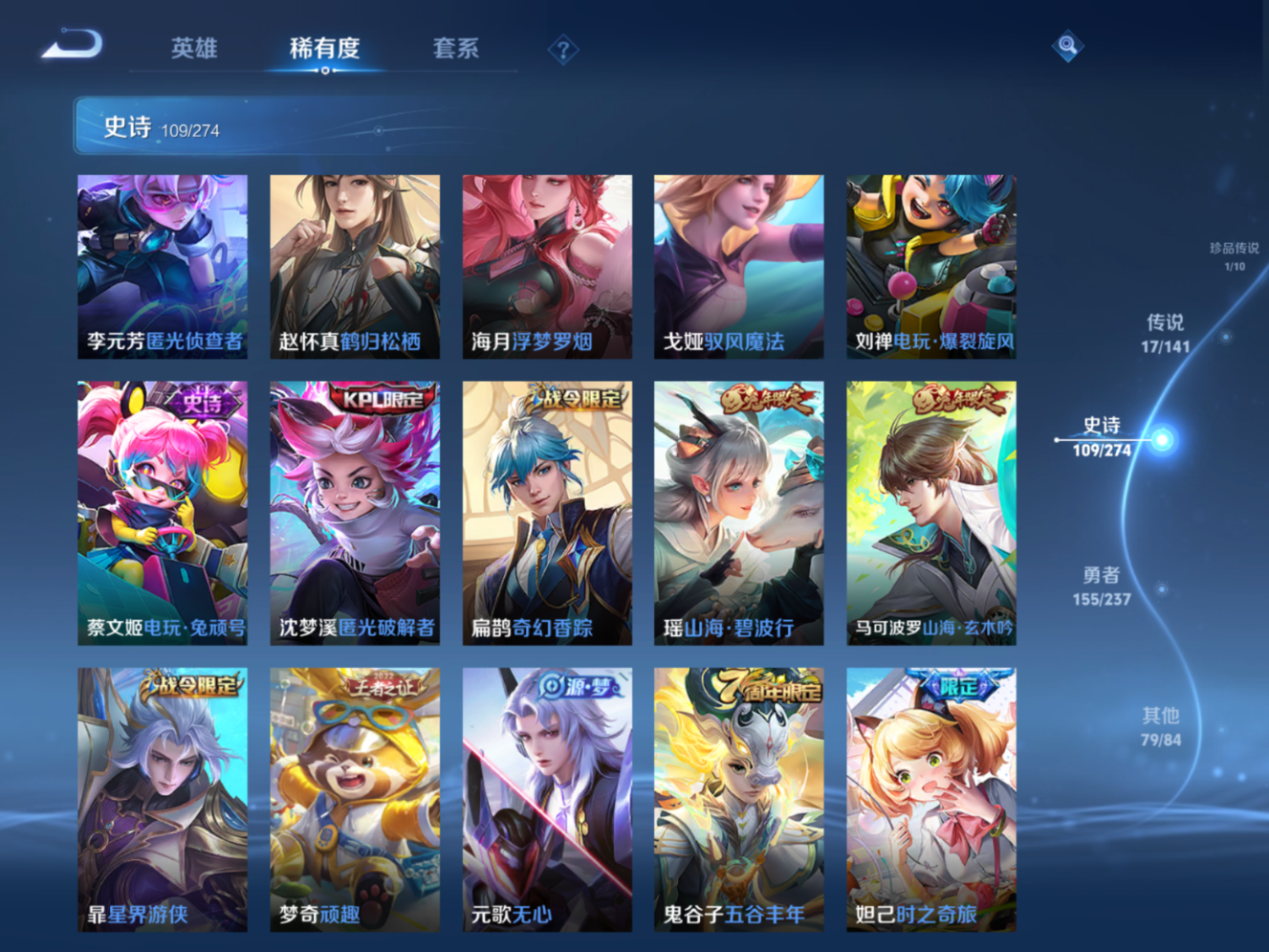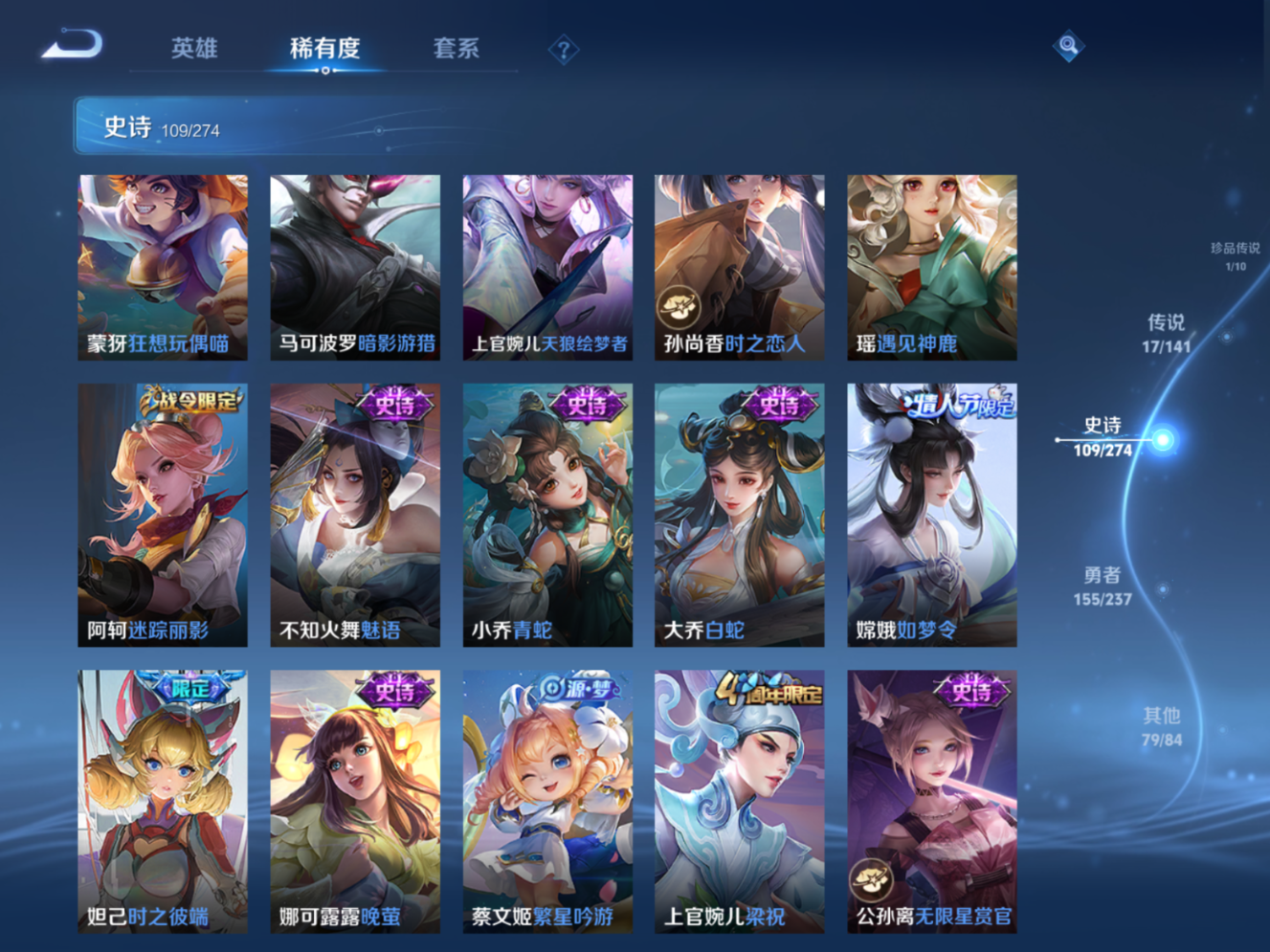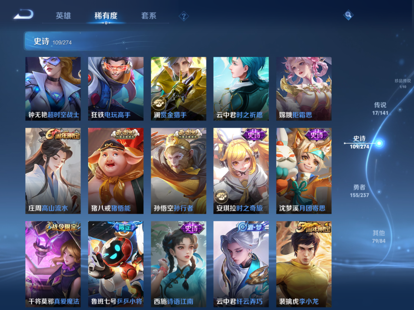 贵族等级:v9皮肤数:364传说品质17 生肖限定4 情人节限定4 荣耀典藏1 无双1 珍品传说1 英雄数:128