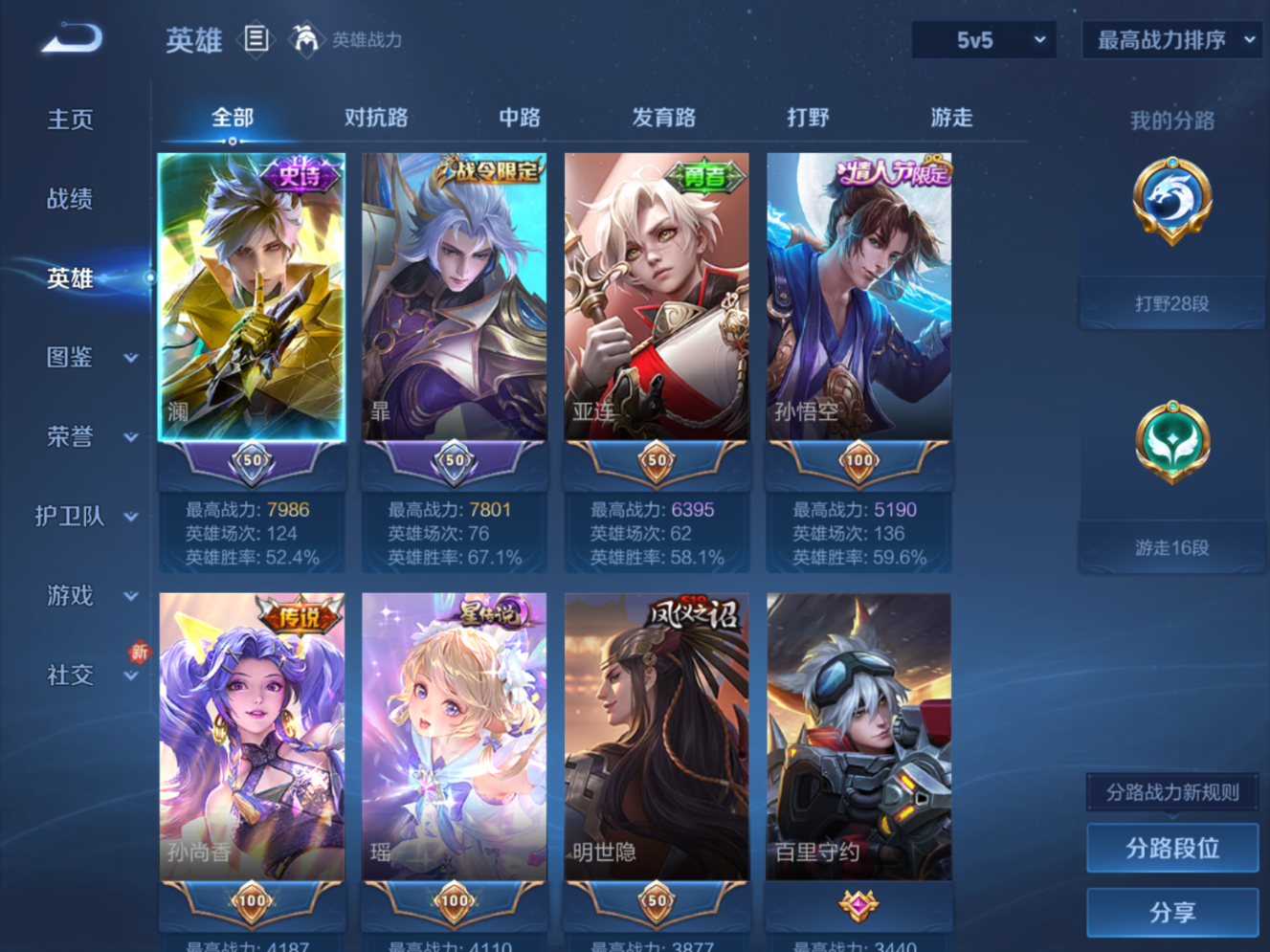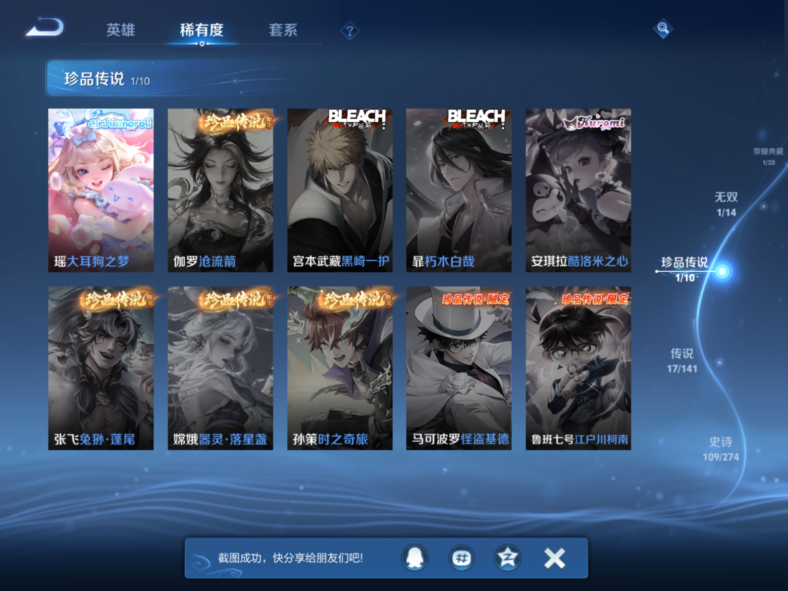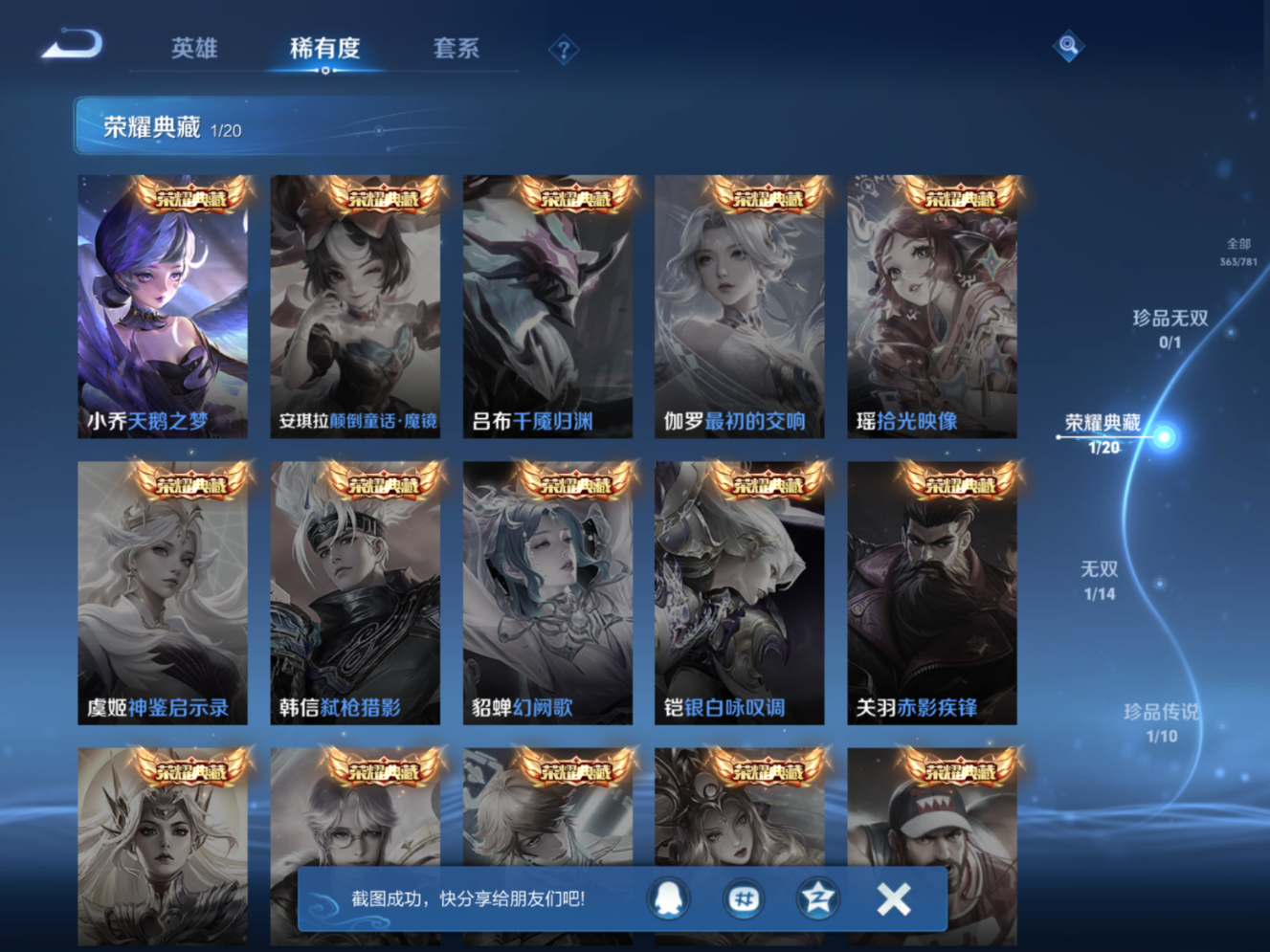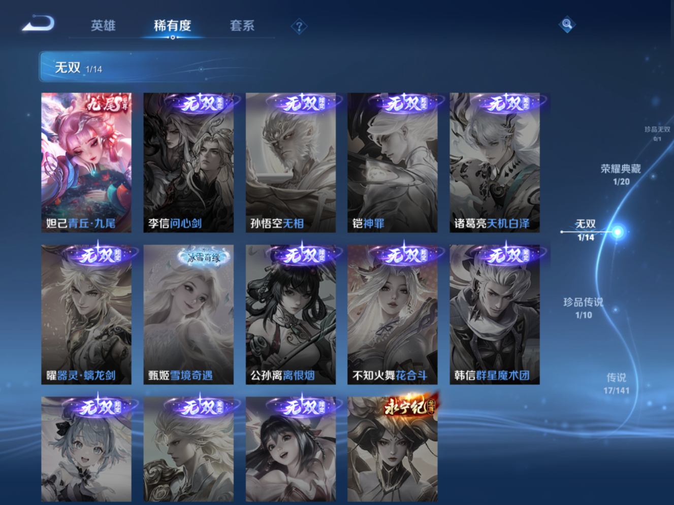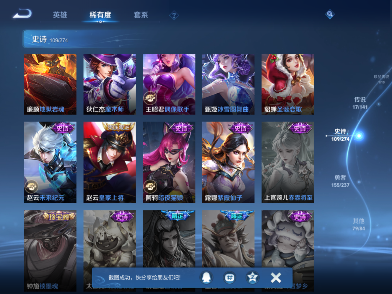 贵族等级:v9皮肤数:364传说品质17 生肖限定4 情人节限定4 荣耀典藏1 无双1 珍品传说1 英雄数:128