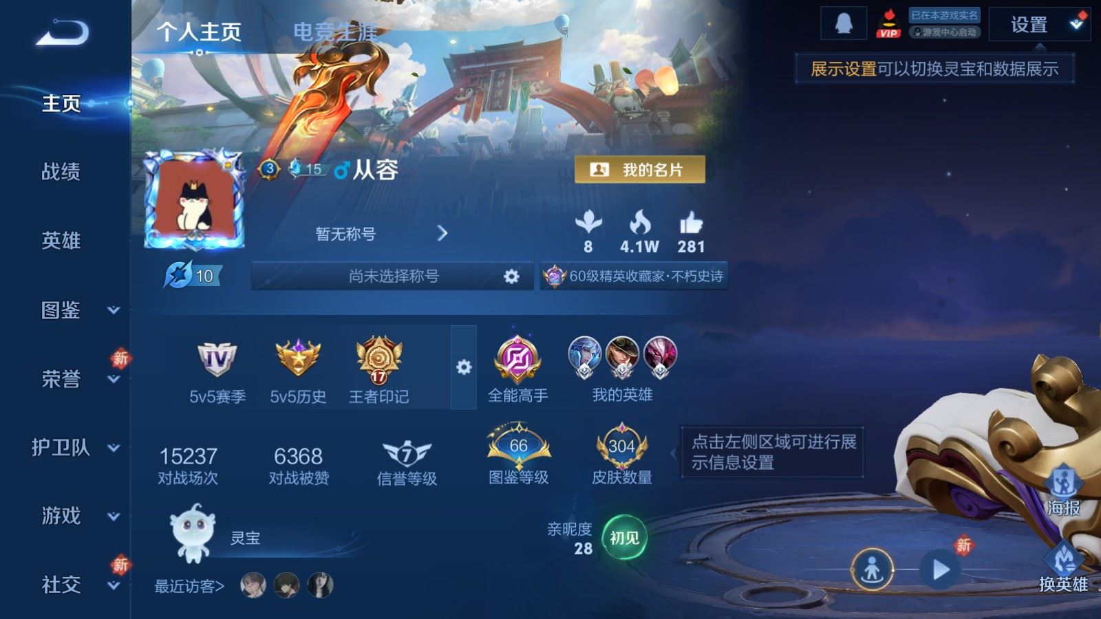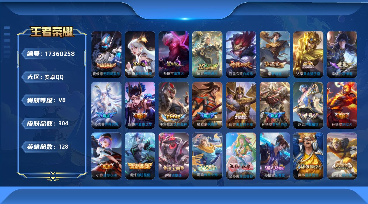 贵族等级:v8皮肤数:304传说品质15 情人节限定2 生肖限定3 荣耀典藏1 英雄数:128