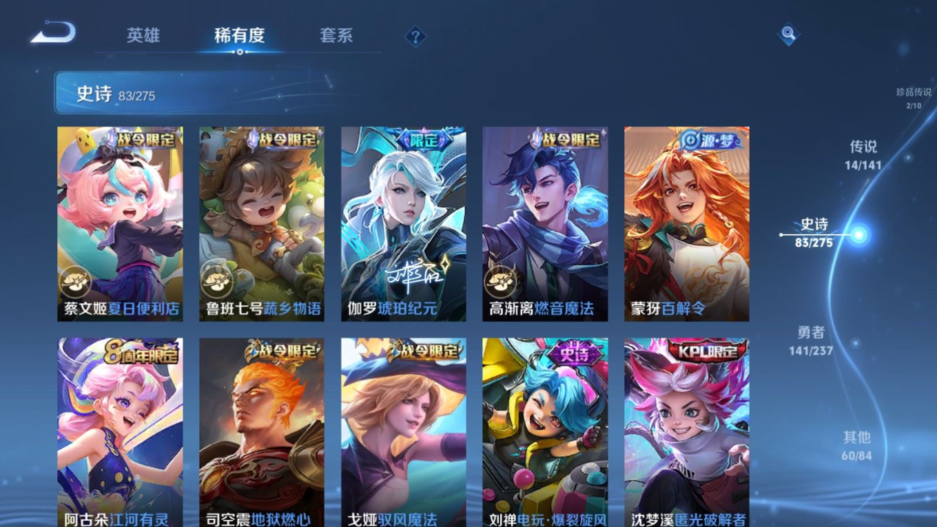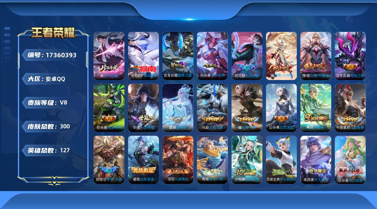 贵族等级:v8皮肤数:300传说品质14 生肖限定4 情人节限定1 珍品传说2 英雄数:127