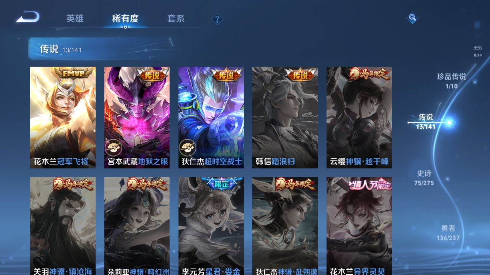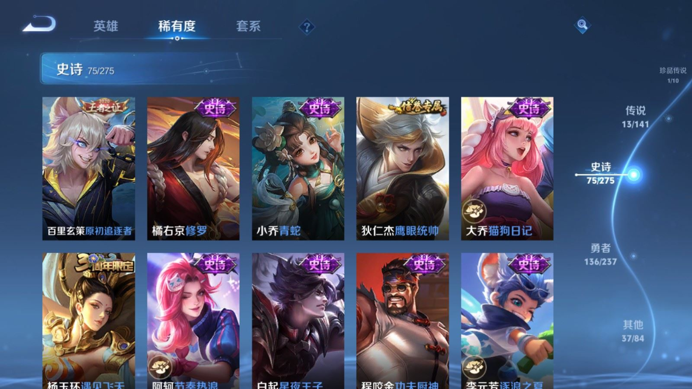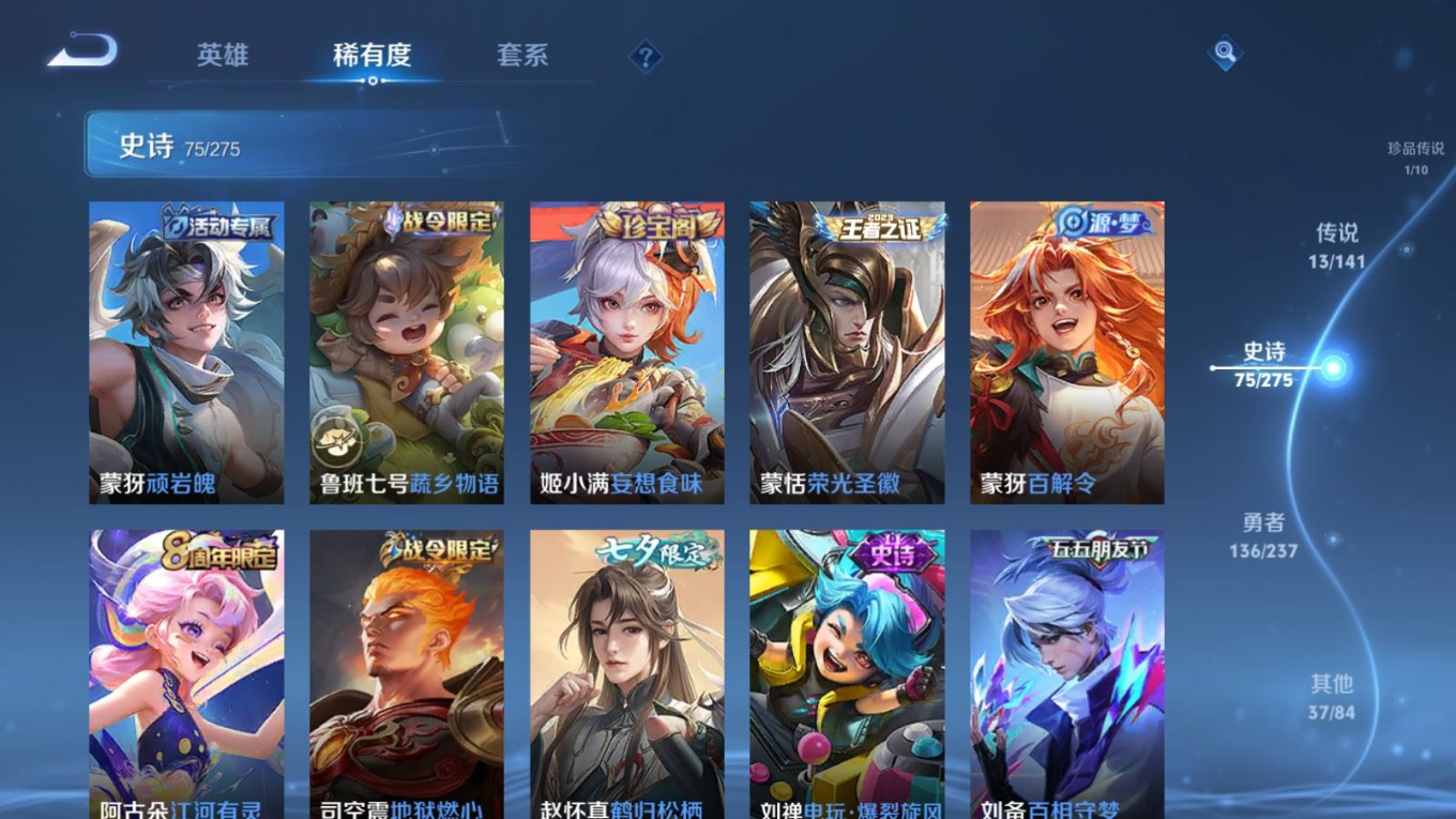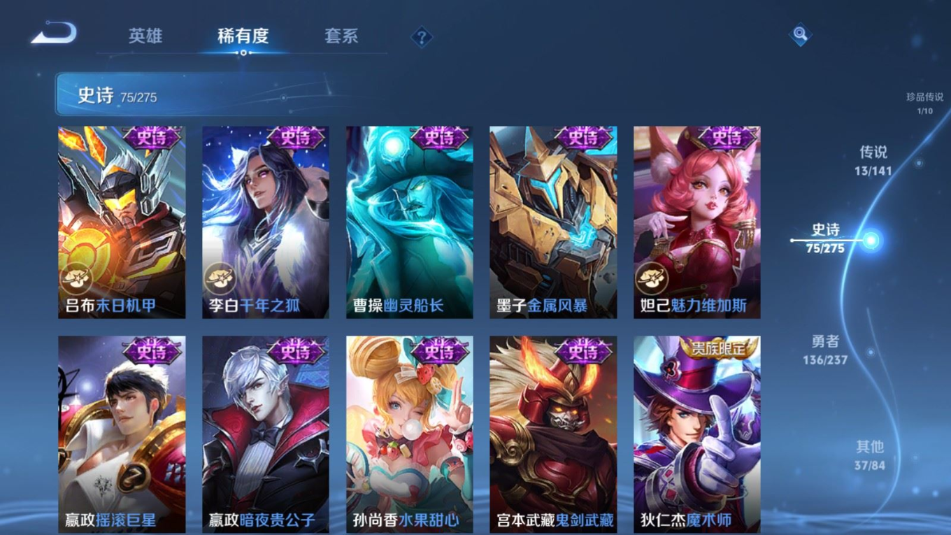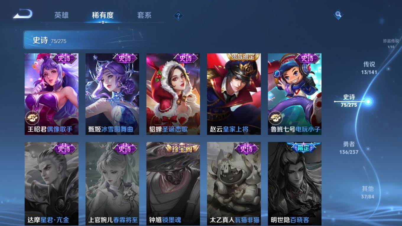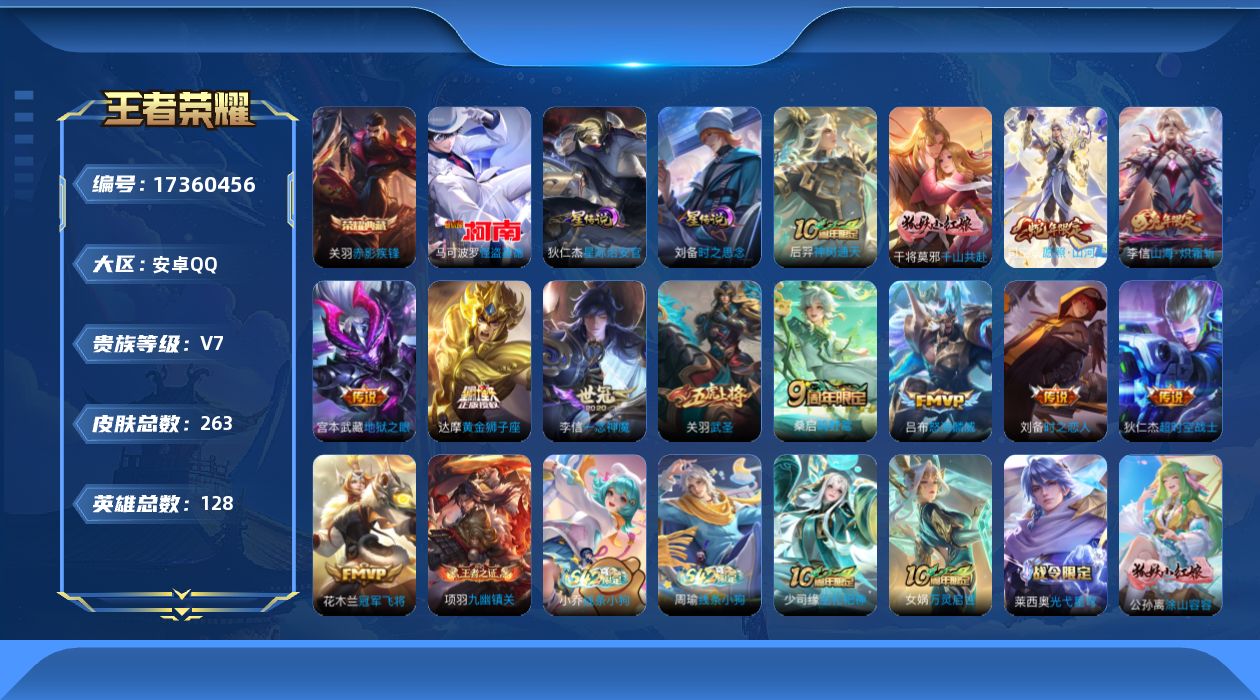 贵族等级:v7皮肤数:263传说品质13 荣耀典藏1 生肖限定3 珍品传说1 英雄数:128