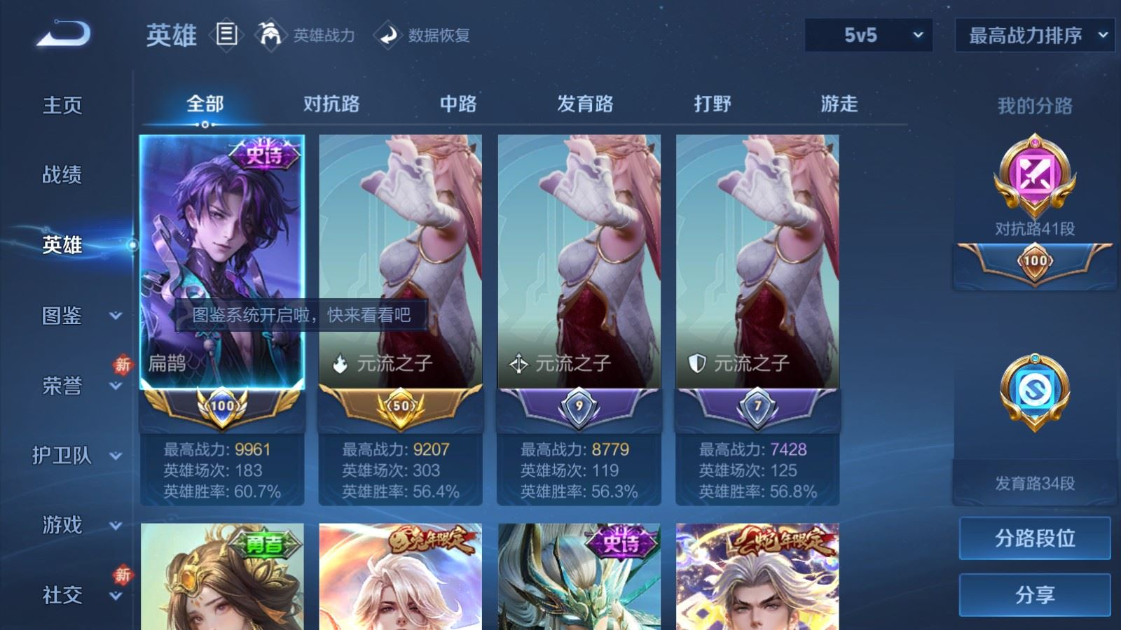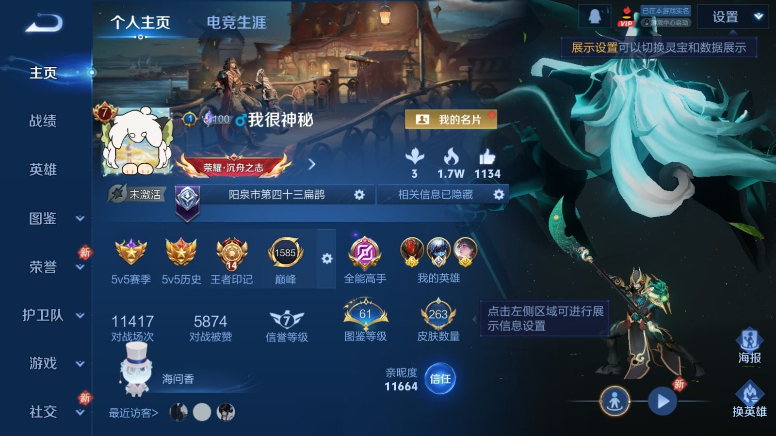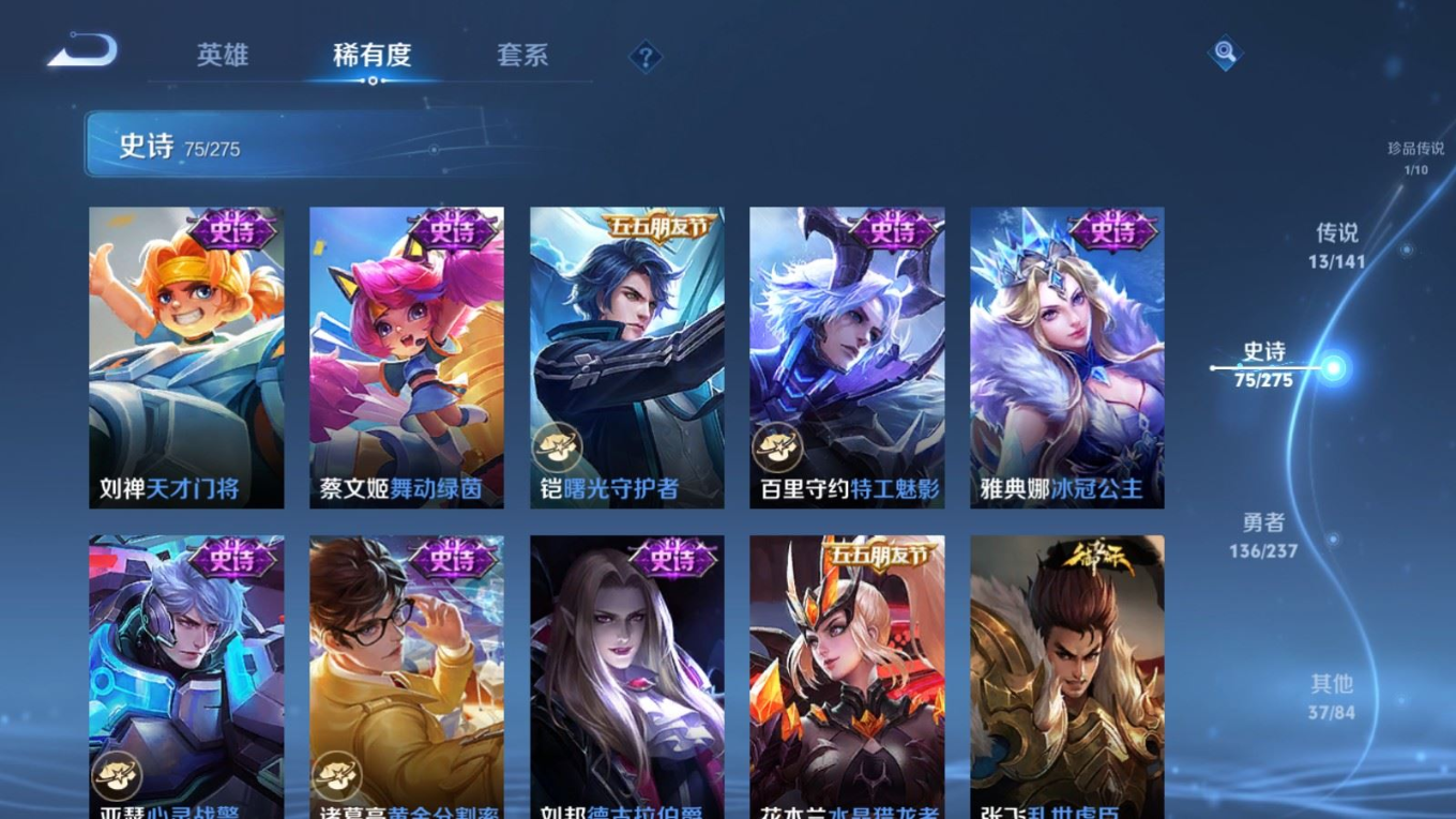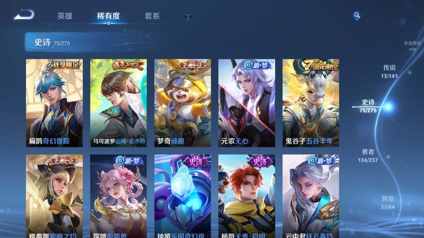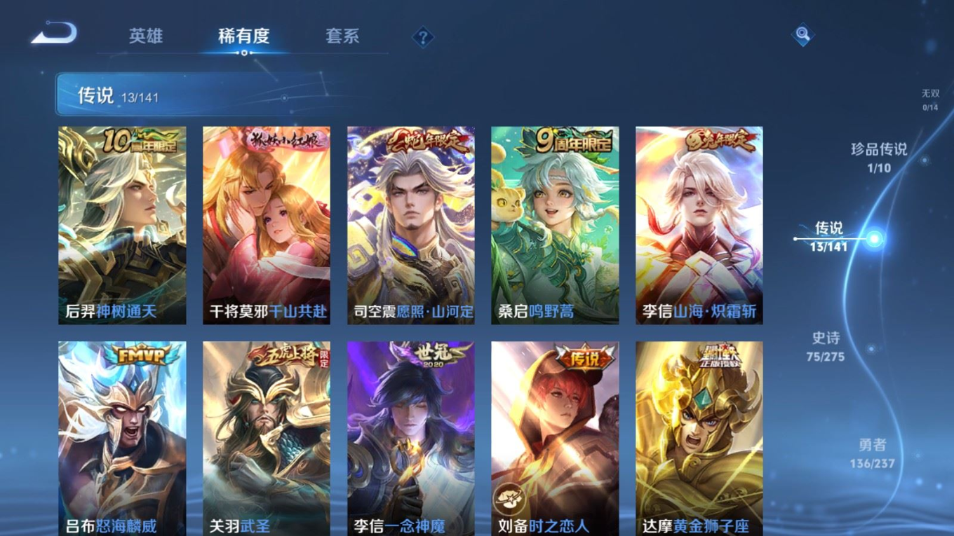 贵族等级:v7皮肤数:263传说品质13 荣耀典藏1 生肖限定3 珍品传说1 英雄数:128