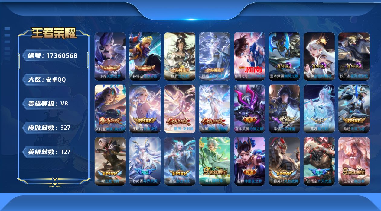 贵族等级:v8皮肤数:327传说品质21 情人节限定1 荣耀典藏2 珍品传说3 生肖限定3 英雄数:127
