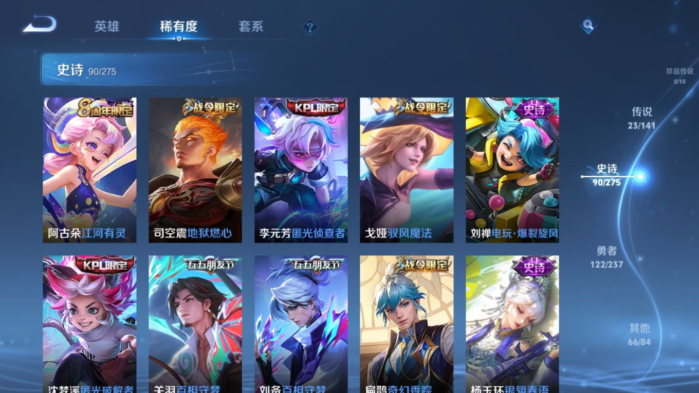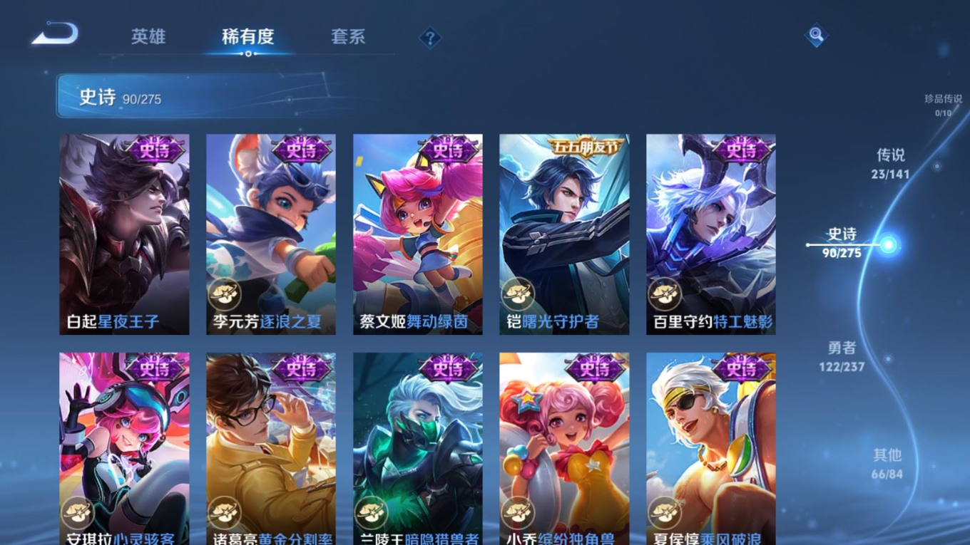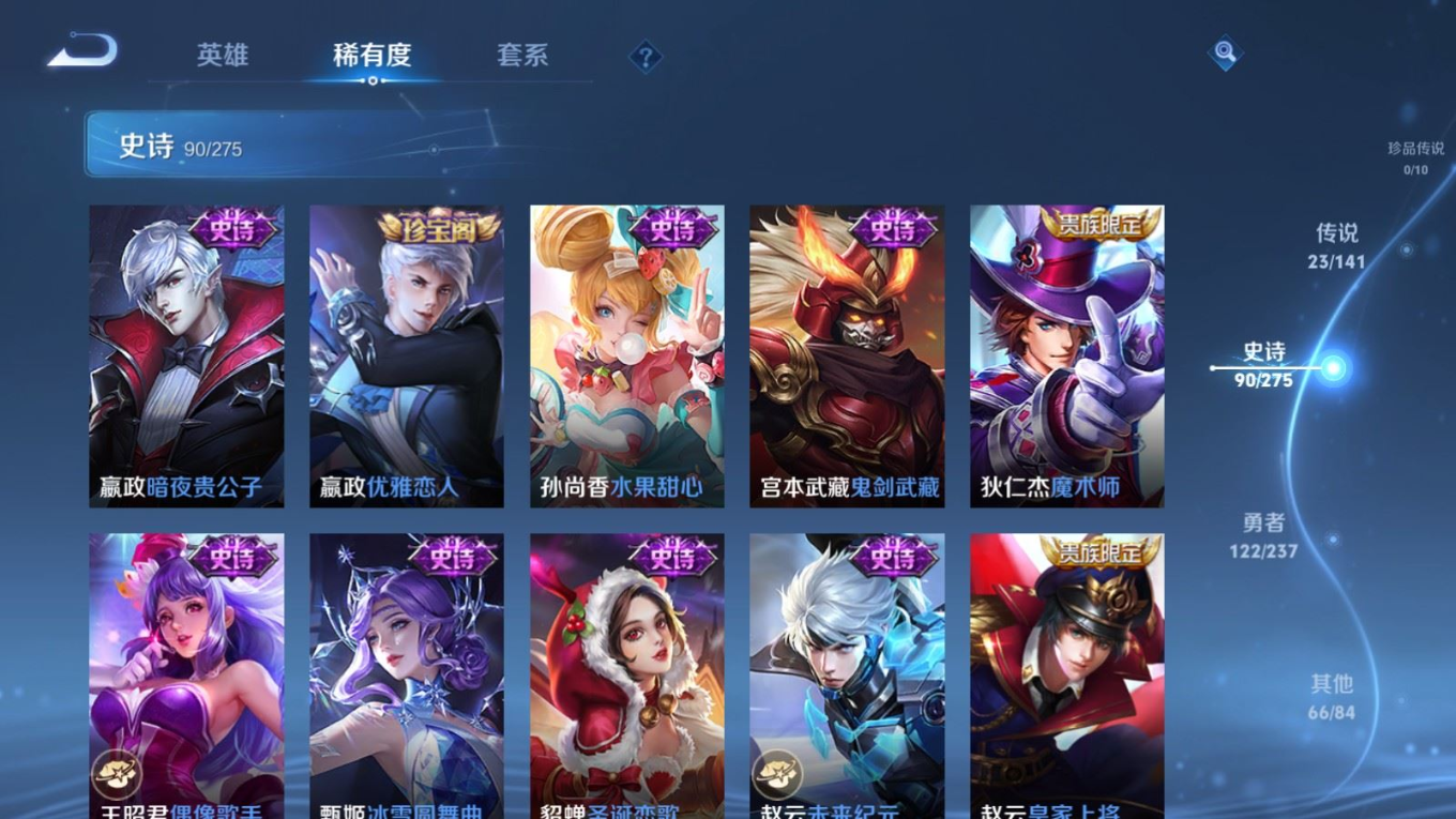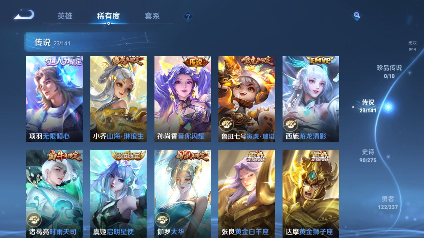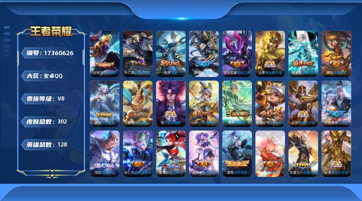 贵族等级:v8皮肤数:302传说品质23 生肖限定8 情人节限定2 荣耀典藏1 英雄数:128