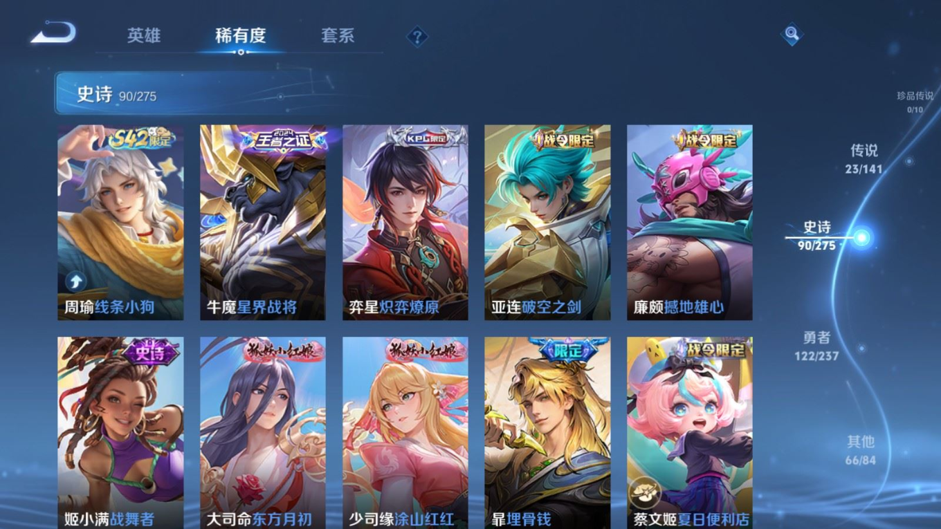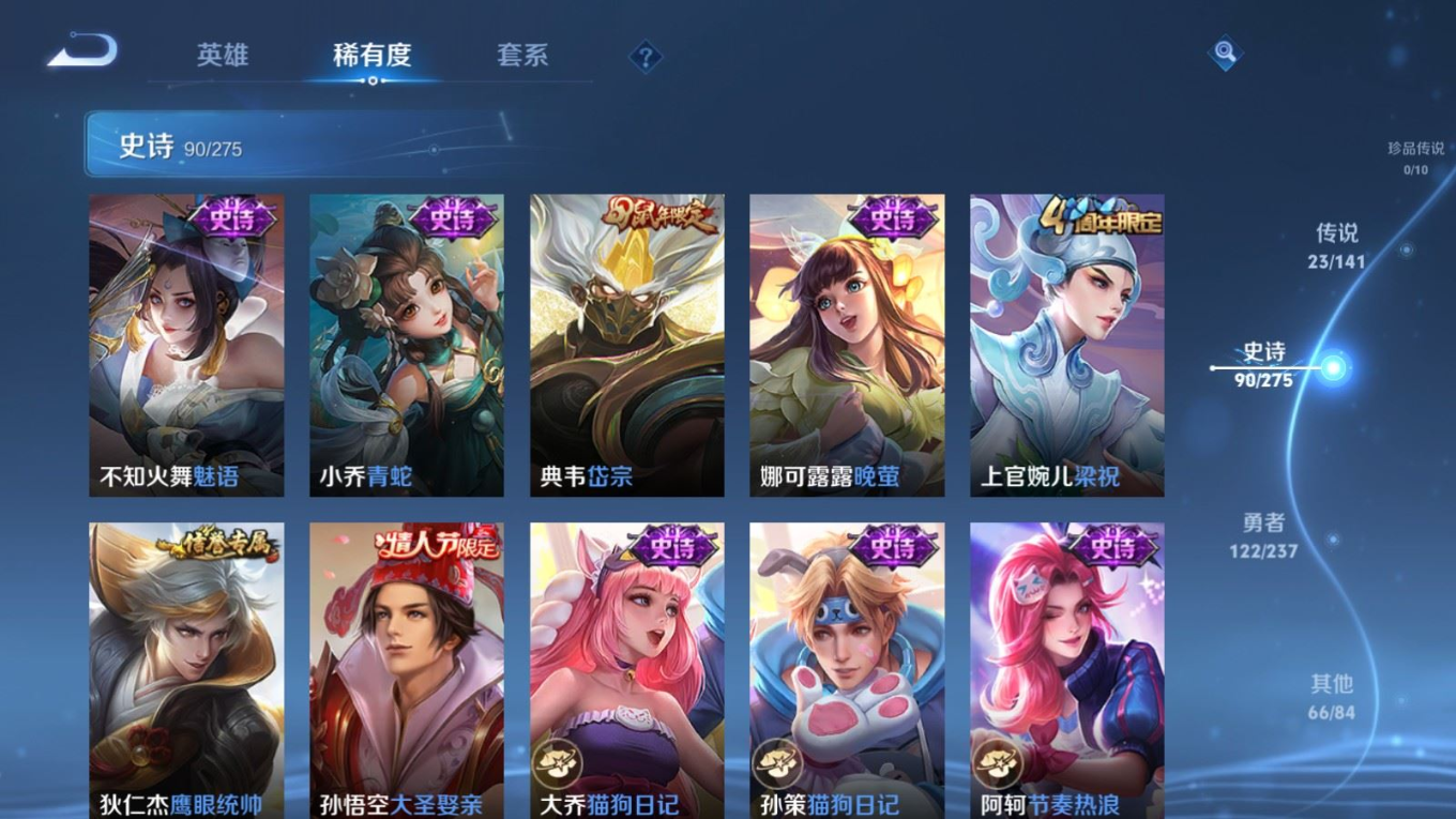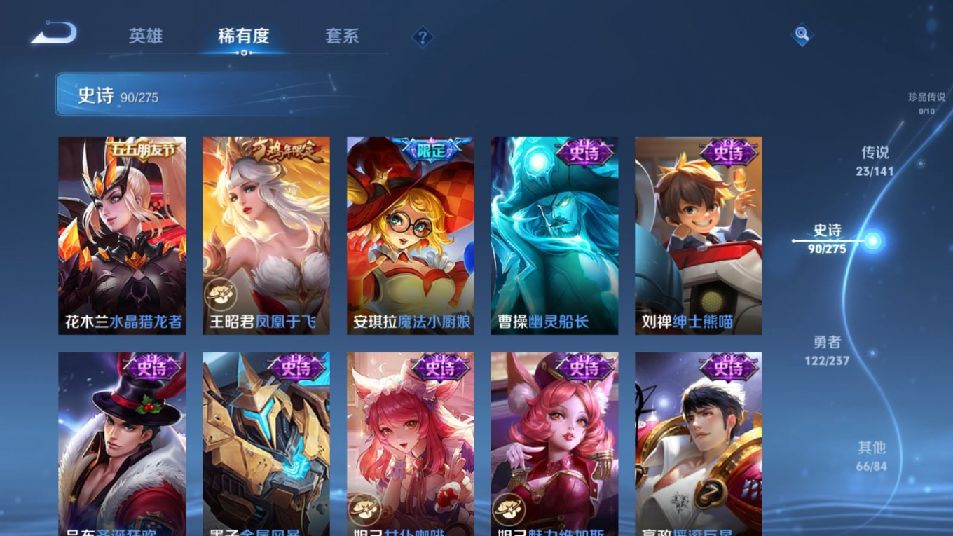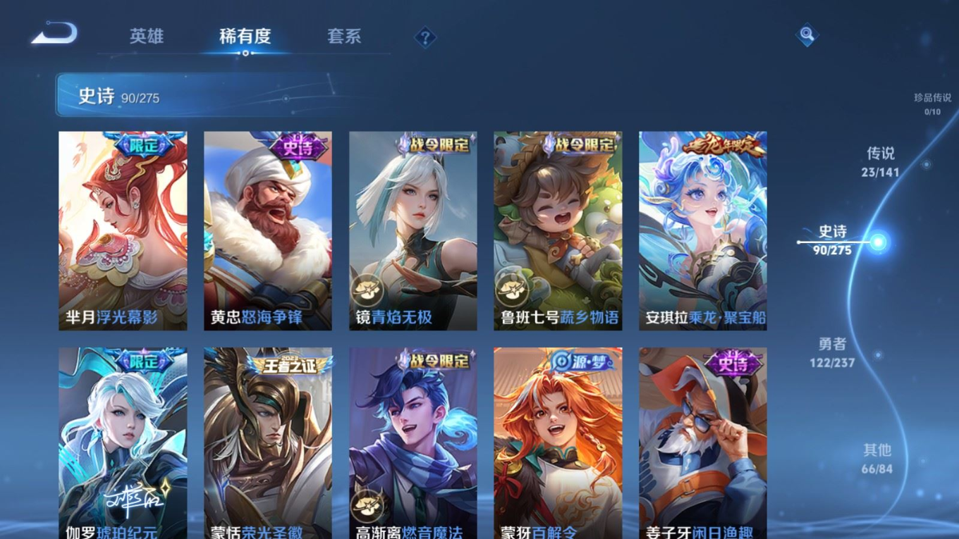 贵族等级:v8皮肤数:302传说品质23 生肖限定8 情人节限定2 荣耀典藏1 英雄数:128